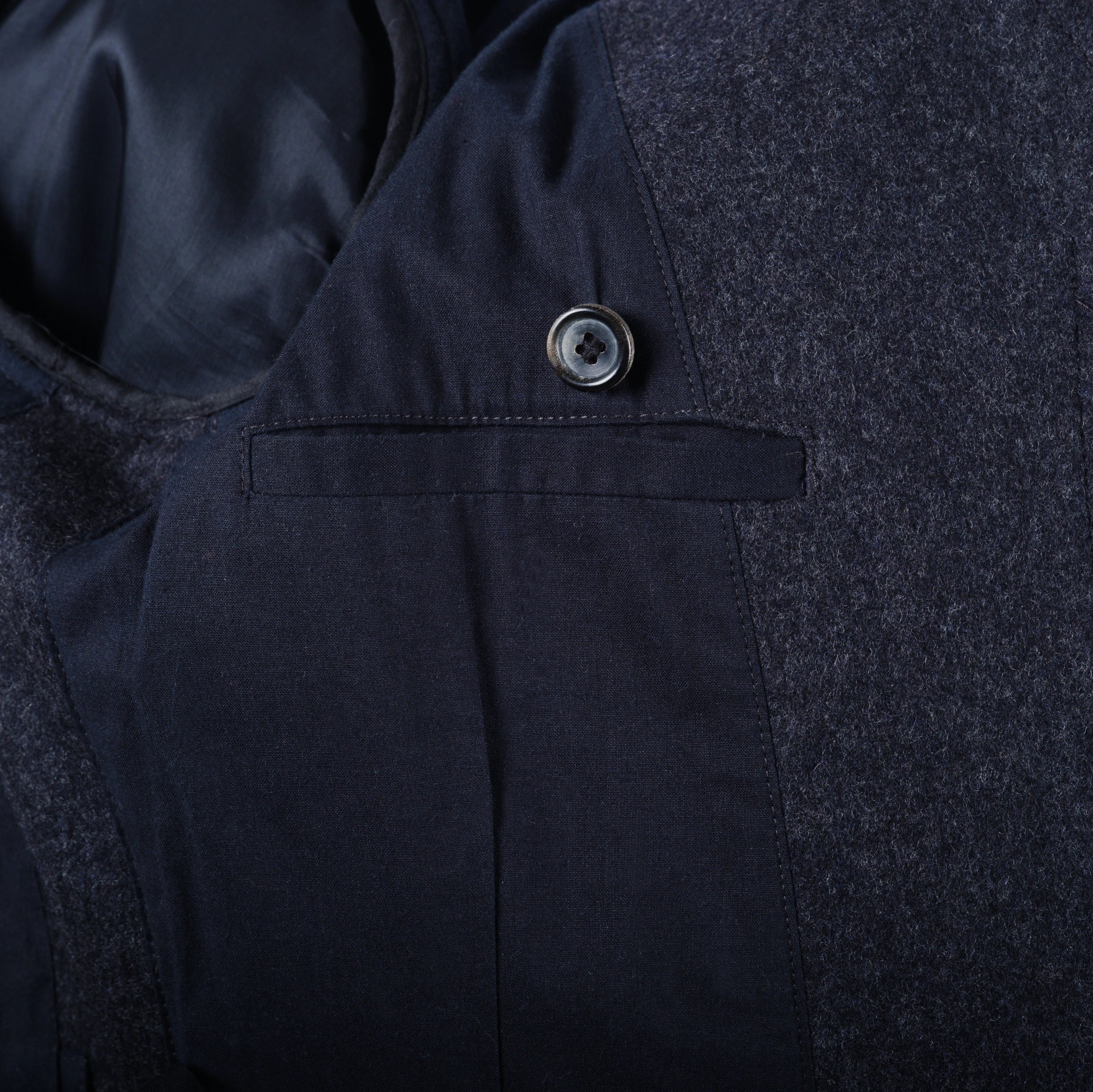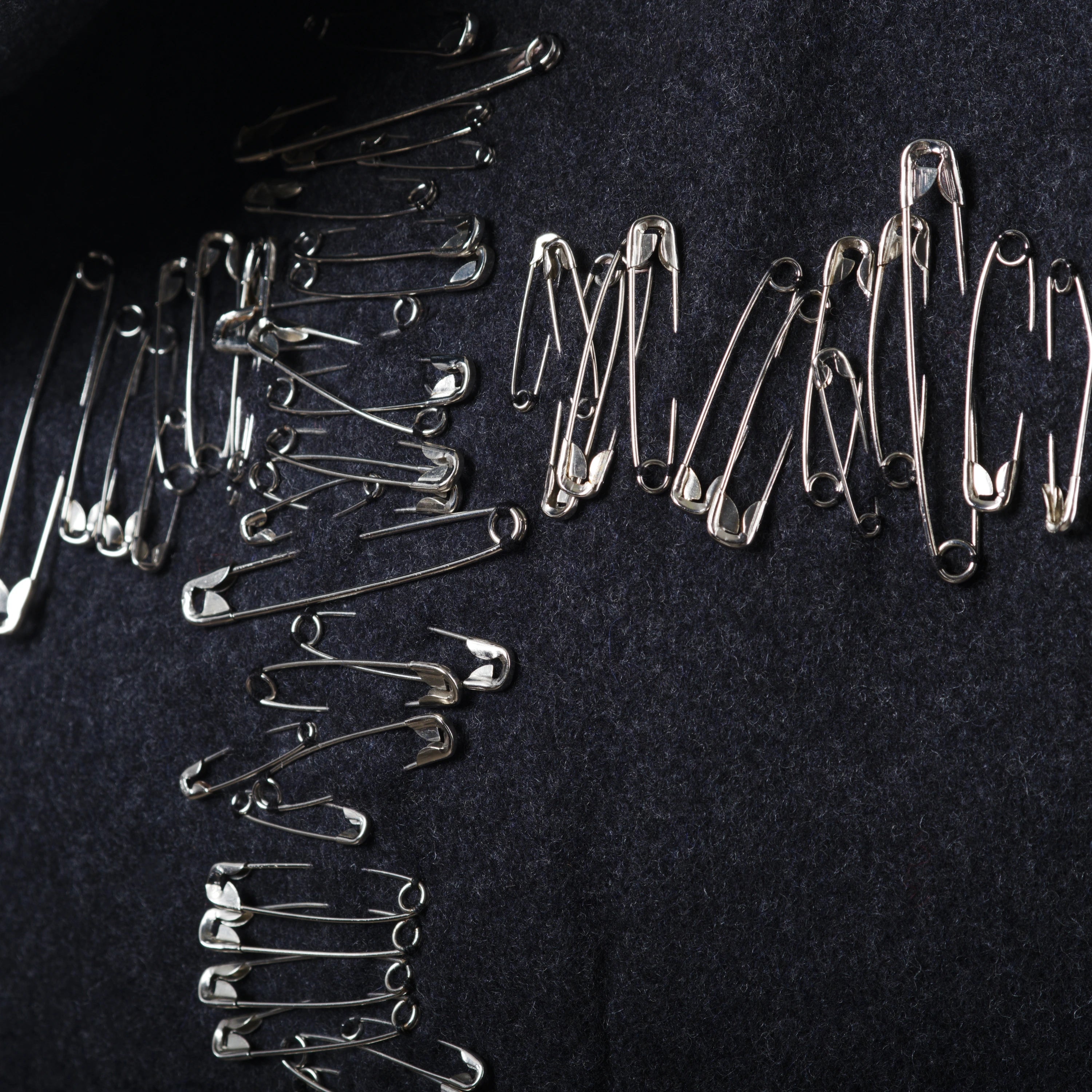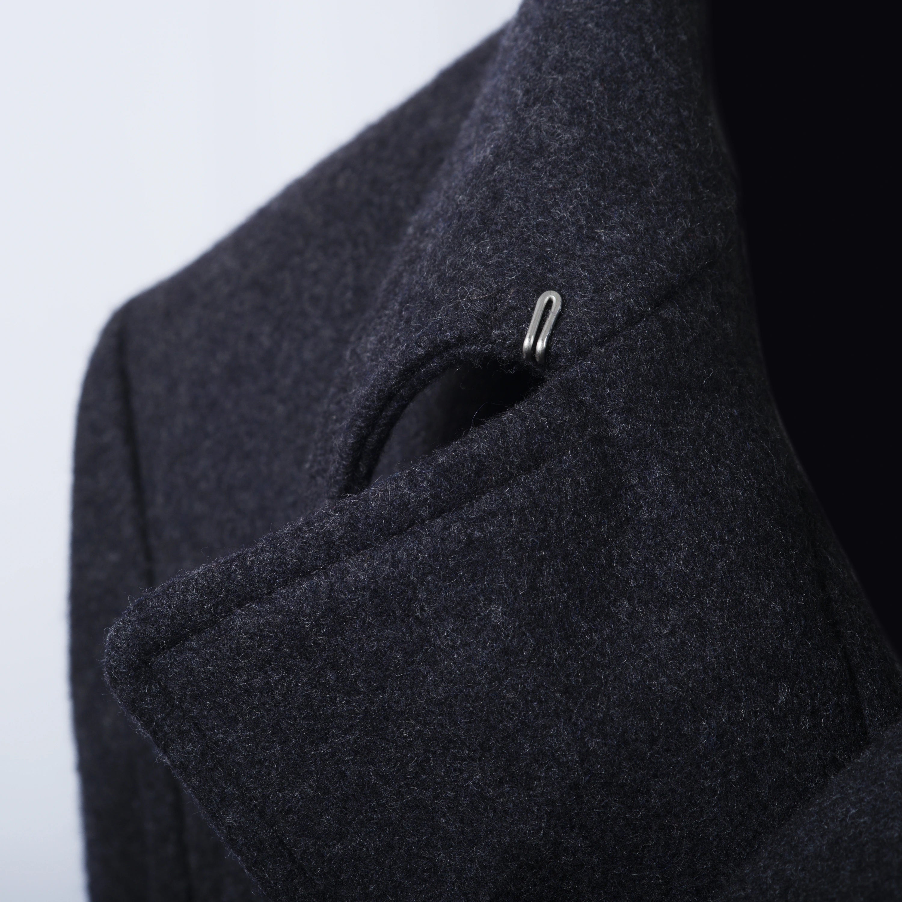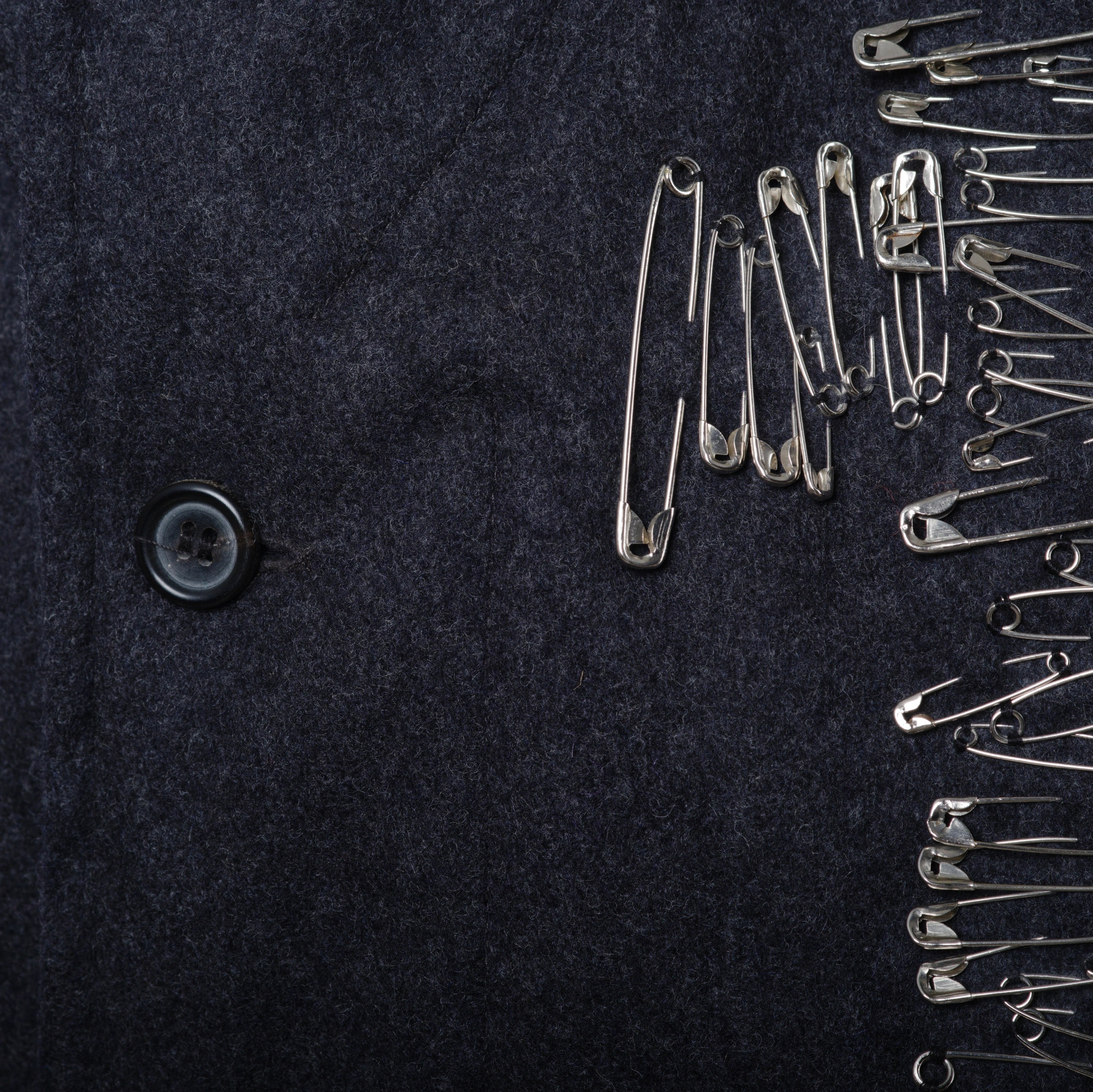 The “Pins Cross” detail adds a recognizable graphic element that breaks the classic linearity of a wool jacket, creating a balance between formal elegance and stylistic innovation.