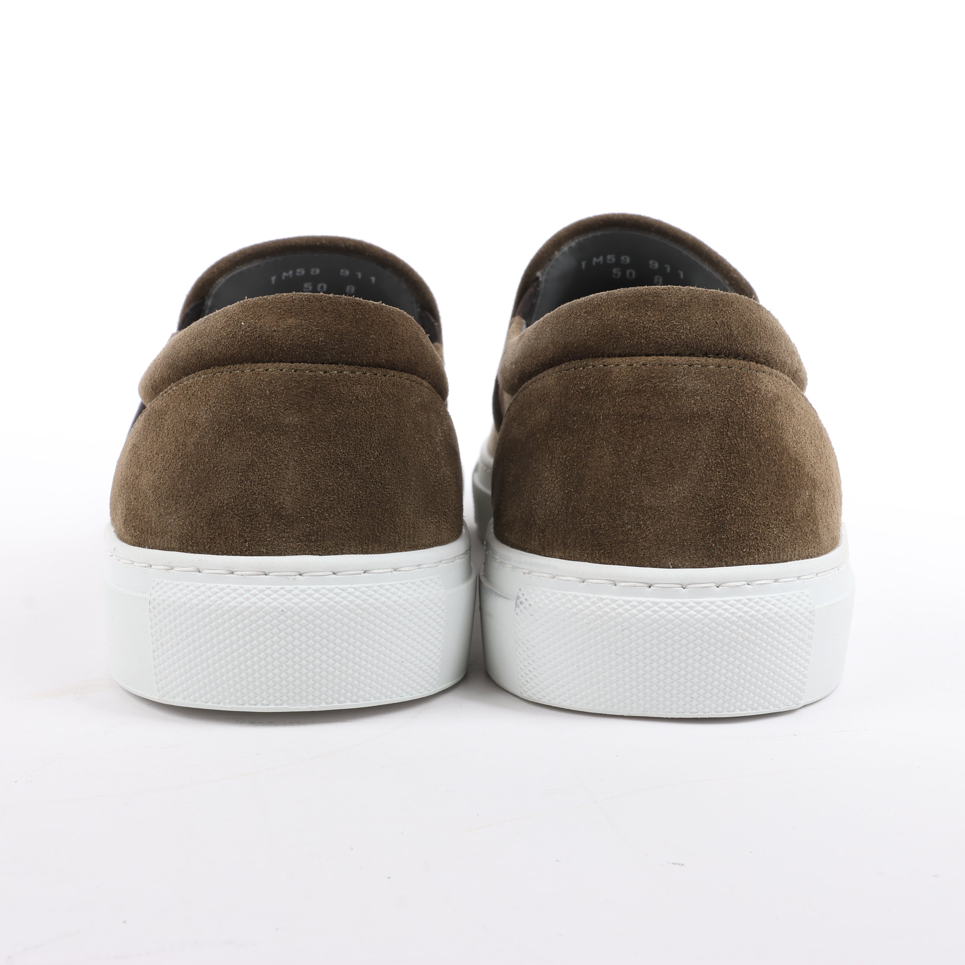 Corneliani slip-on sneakers in brown suede and cloth combine casual ease with refined Italian style. Featuring a contrast white sole and tonal paneling, this size 50 EU pair is a versatile staple for understated sophistication.