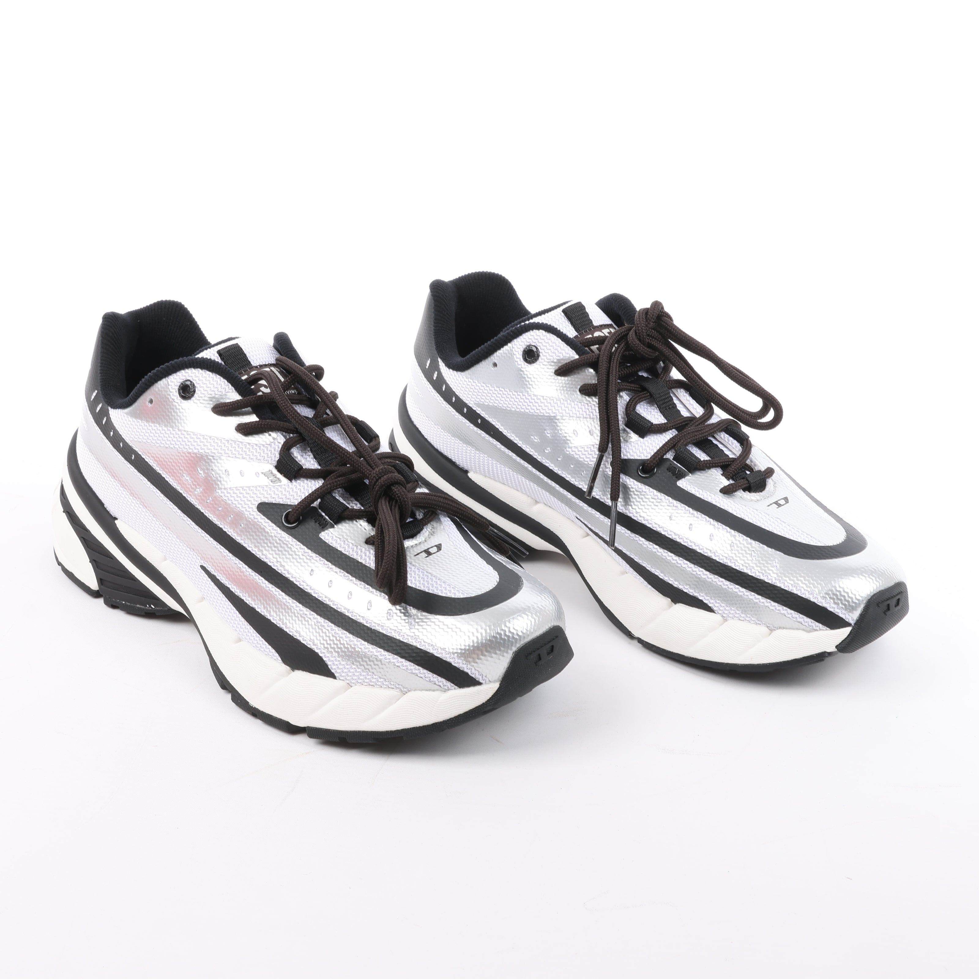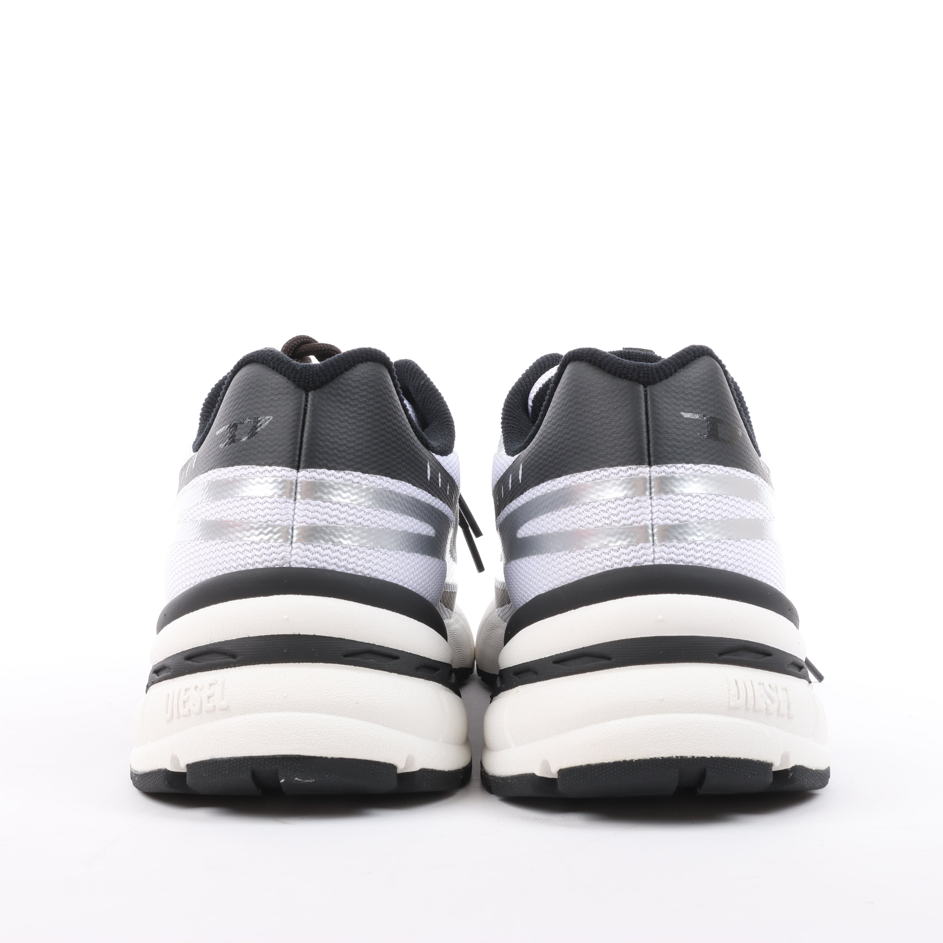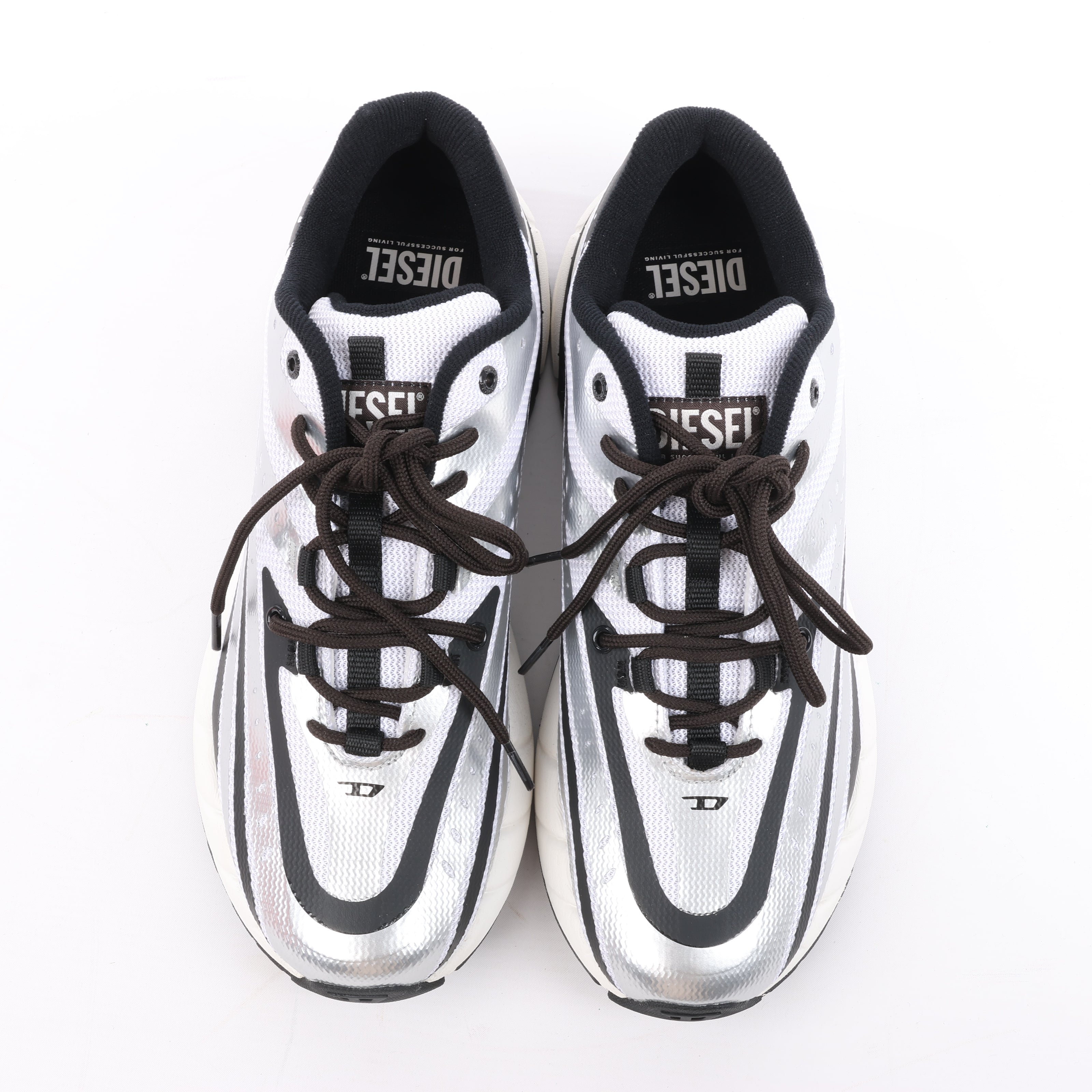 Step into futuristic style with Diesel D-Airspeed low-top sneakers in silver coated ripstop, featuring bold black stripes, layered sole design, and high-performance streetwear flair in size 43 EU.