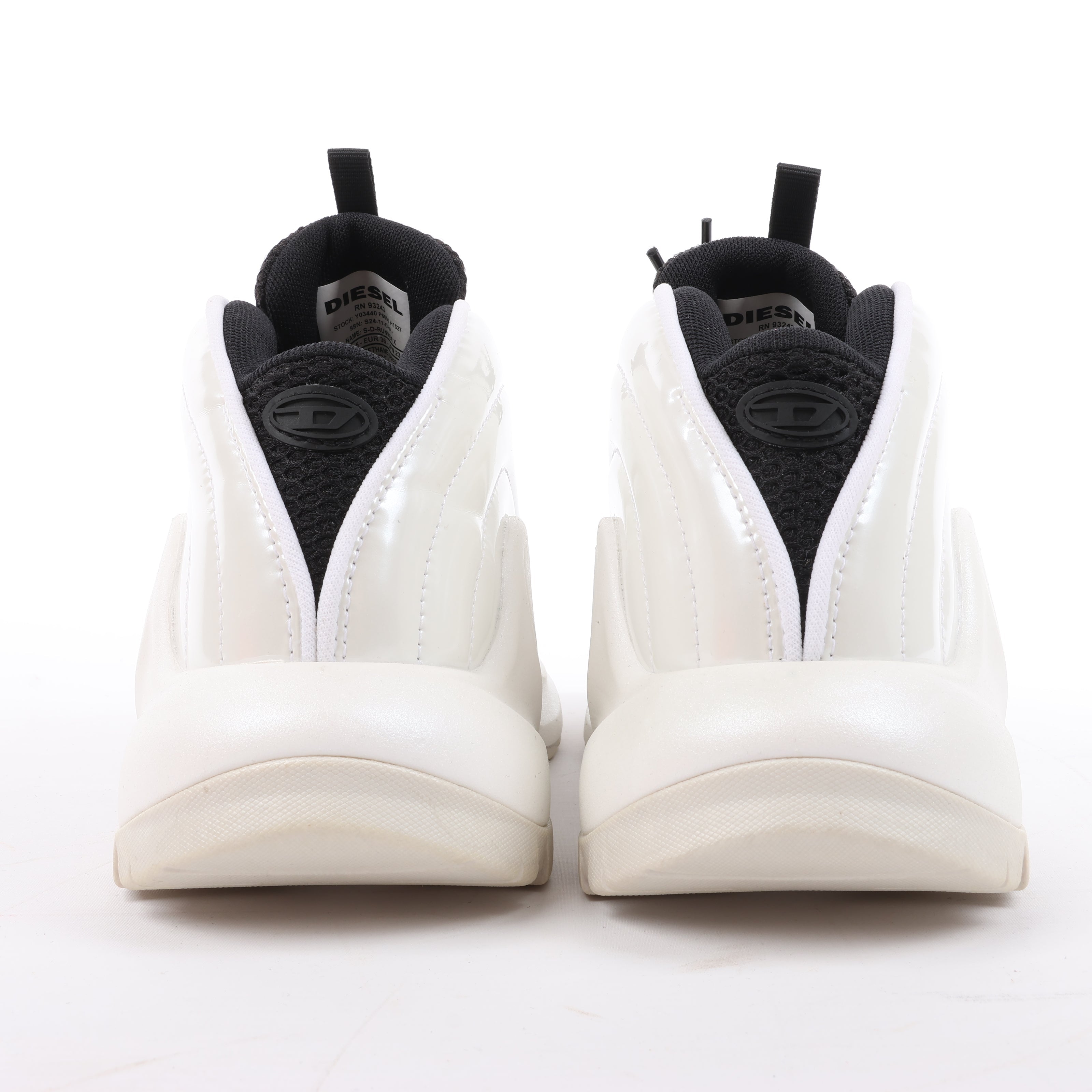 Brand: DieselSize: EU 36Condition: Never worn with tagCondition Details: -Main Colour: WhiteColours: BlackMain material: PolyurethaneMaterials: -Product Code: S24-11-CHPManufactured In: VietnamComes With: Box, brand tag