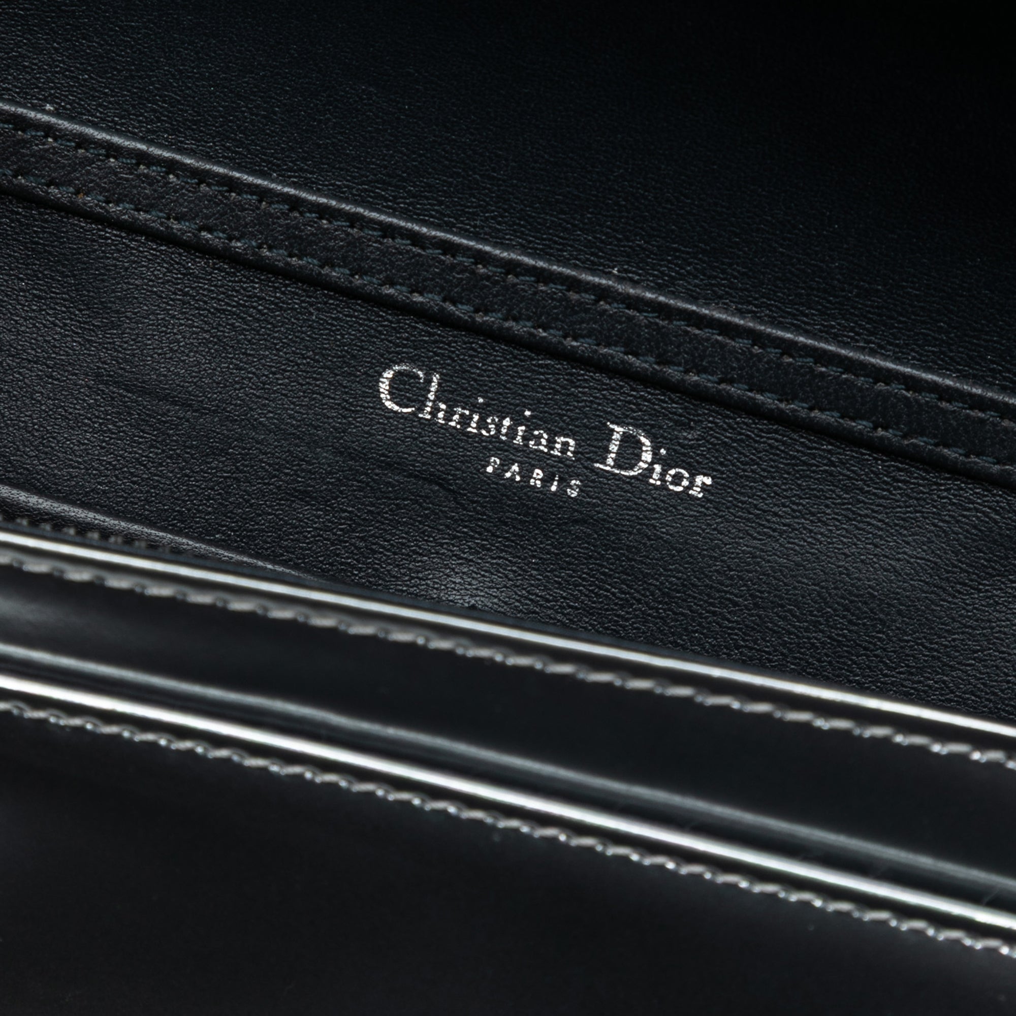 This wallet on chain features a patent leather body, a detachable silver-tone chain shoulder strap, a front flap with a push lock closure, and an interior slip pocket. Retail Price: 1900.00