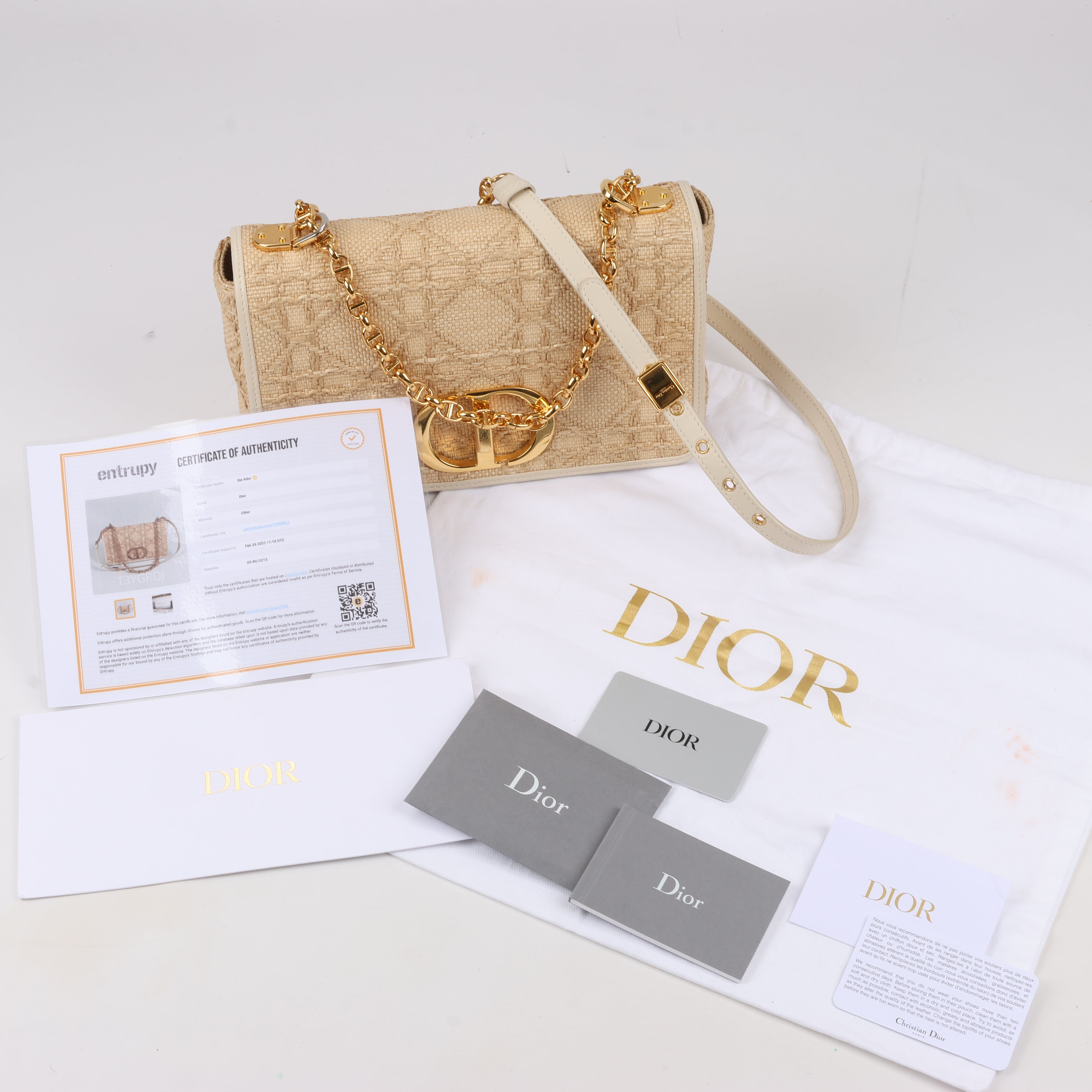 Brand: DiorModel: Dior Caro Size: -Width: 20 cmHeight: 12 cmExterior Condition: ExcellentInterior Condition: ExcellentCondition Details: The exterior is clean and beautiful with rubbings at the bottom corners. The strap is in very good condition. Hardware is bright and crisp, with has hairline scratches. The interior is clean and in great condition.Colour: BeigeInterior Colour: BeigeHardware Colour: GoldMaterial: Cloth, LeatherComes With: Dustbag, Entrupy certificate, Dustbag, Certificate