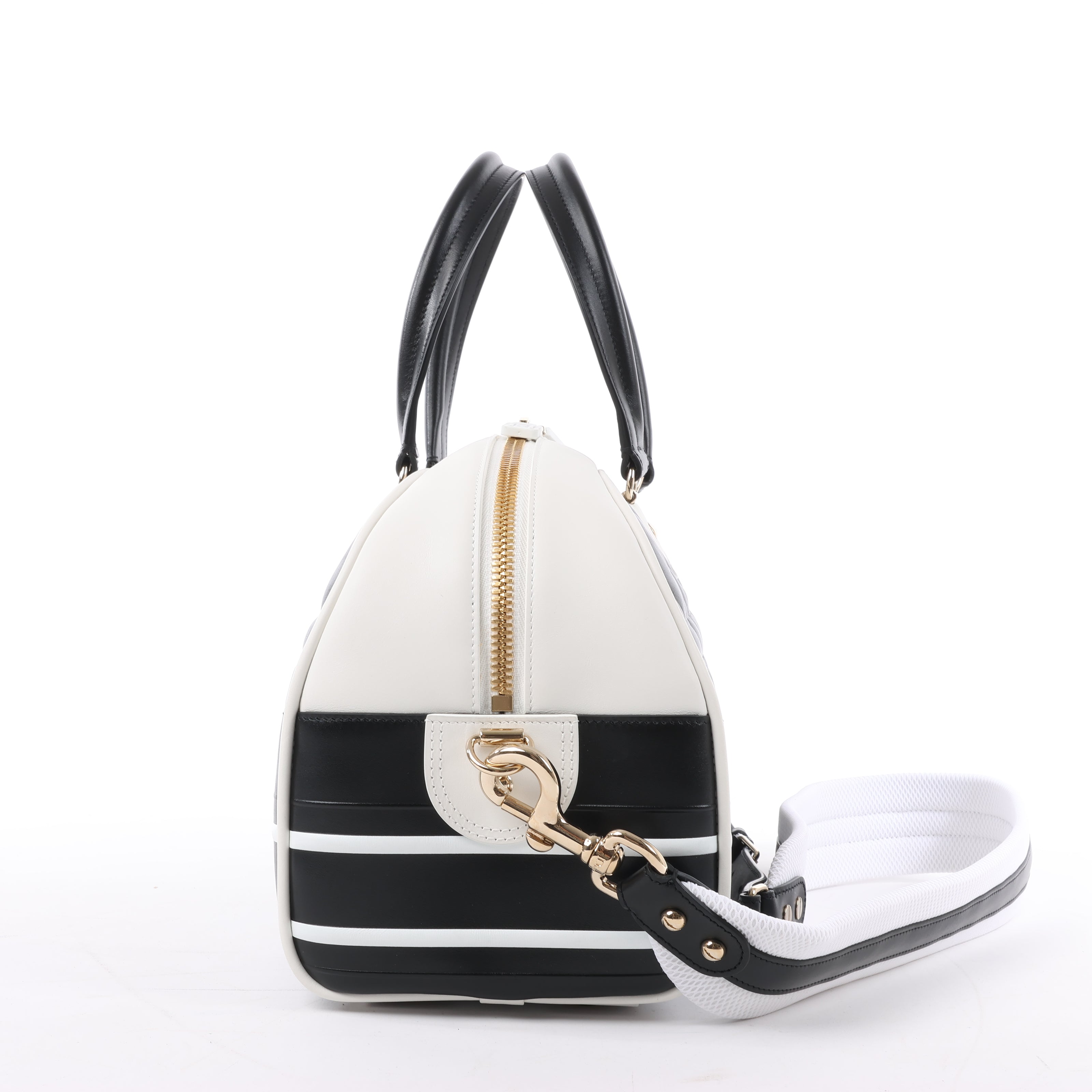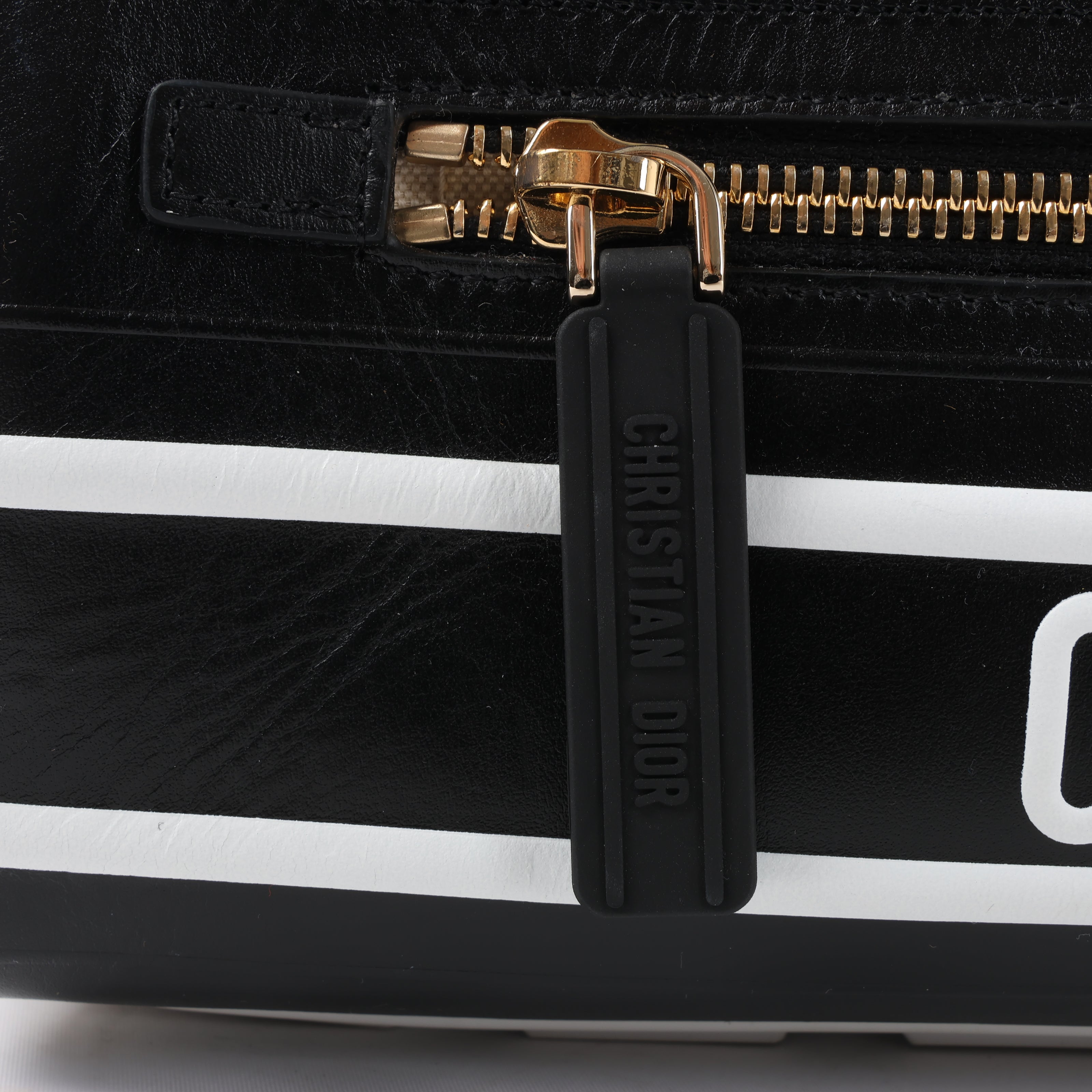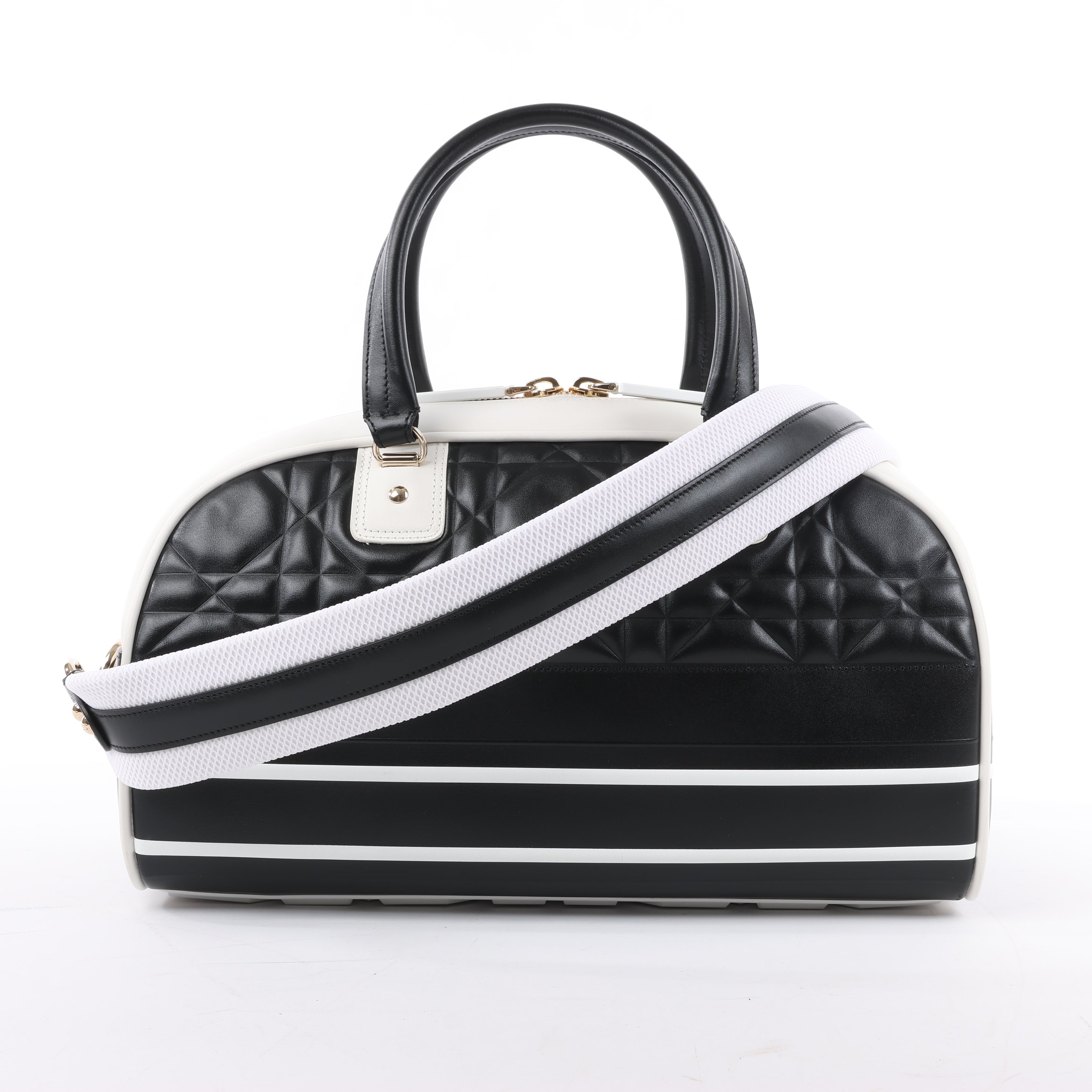 Dior Dior Vibe Zip Bowling Bag in black and white leather blends sporty chic with elegance. Featuring bold logo detailing, quilted texture, and a wide shoulder strap, it's a statement piece for modern, on-the-go luxury.