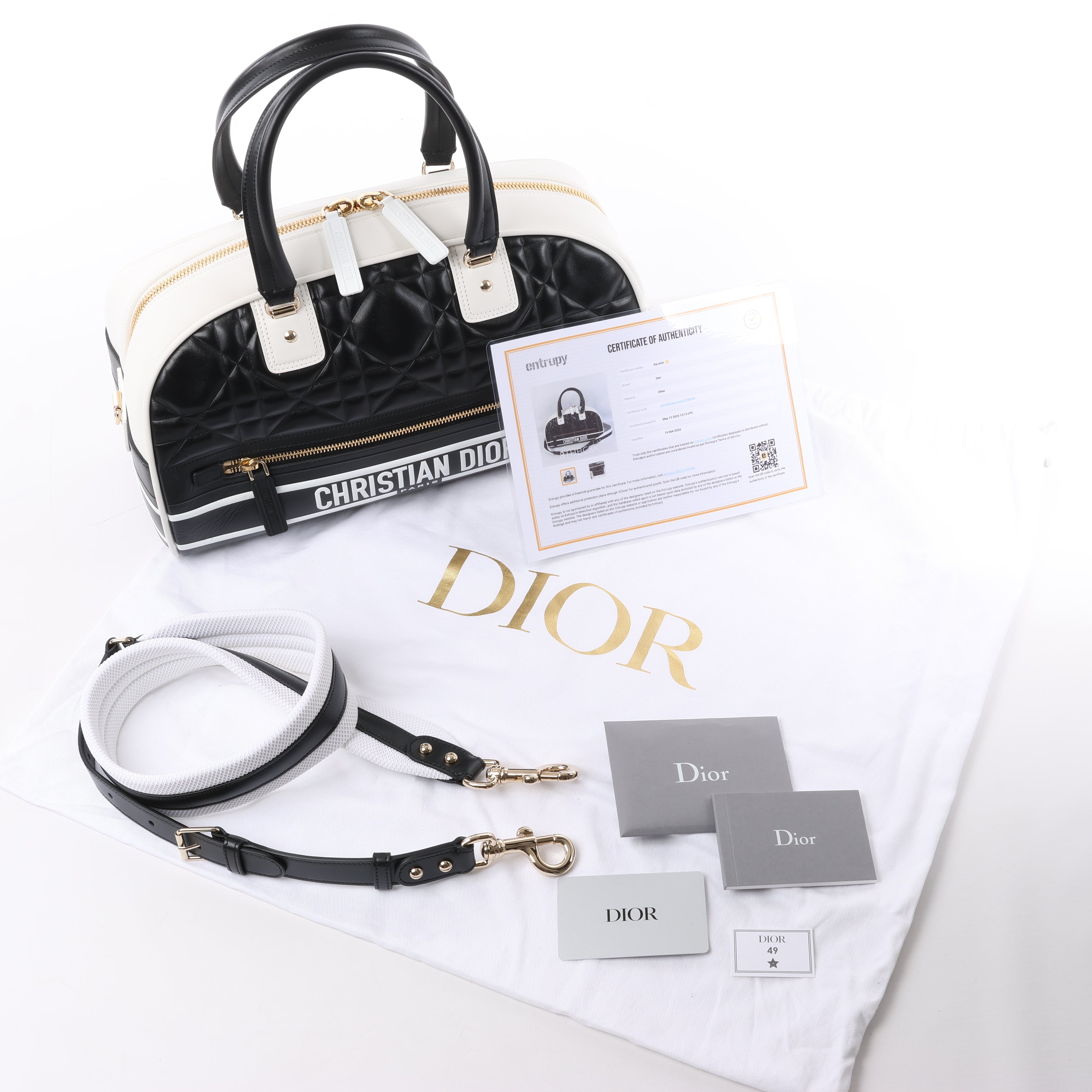 Brand: Dior Model: Dior Vibe Zip BowlingSize: LargeWidth: 34 cmHeight: 22 cmExterior Condition: ExcellentInterior Condition: ExcellentCondition Details: Exterior is in excellent condition. The handles and strap are clean and firm. Hardware is still shiny and crisp. The interior lining is clean and in excellent condition. Overall bag looks like NEW!Colour: Black, WhiteInterior Colour: BeigeHardware Colour: GoldMaterial: LeatherComes With: Shoulder strap, dustbag, paper, Entrupy authentication certificate
