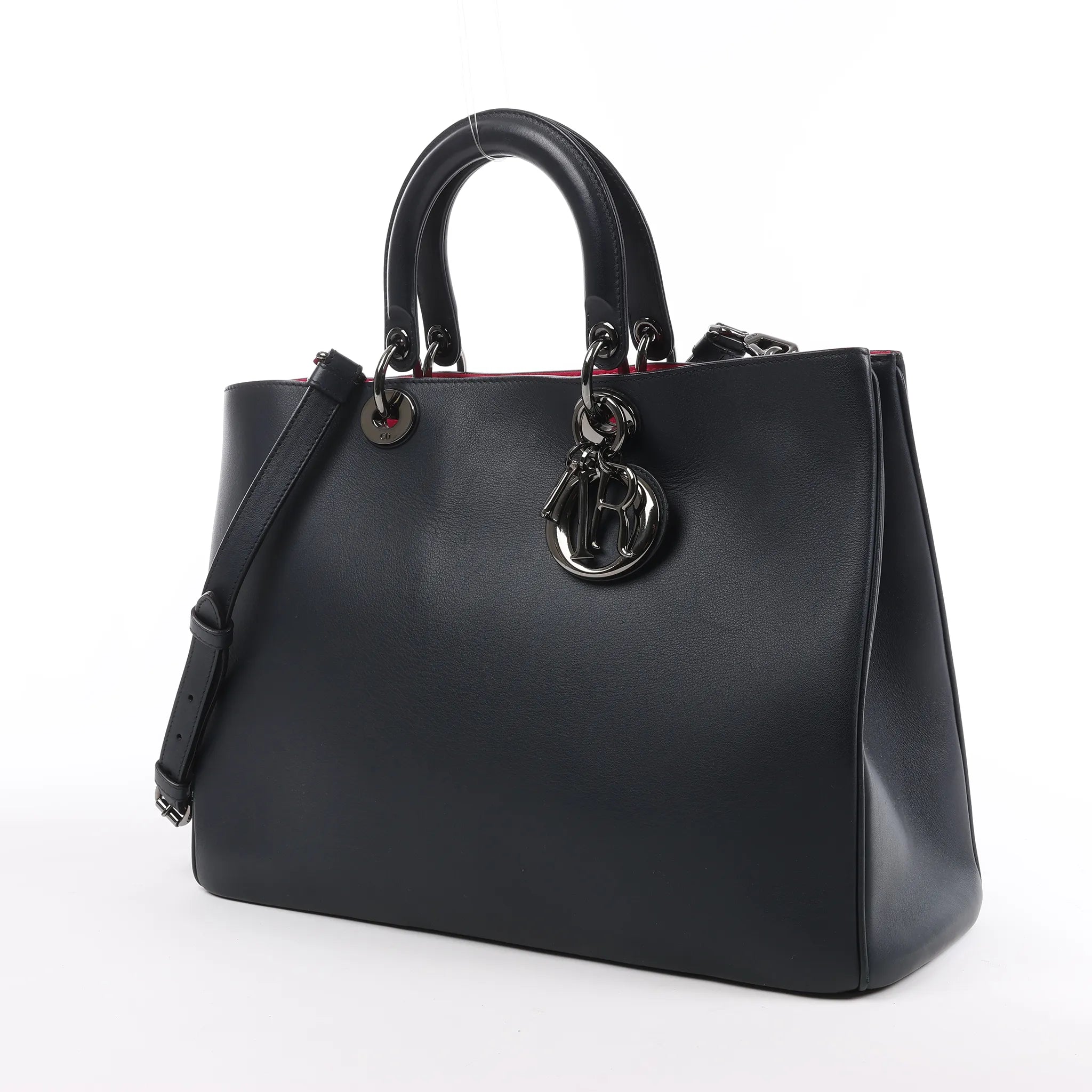 Brand: DiorModel: DiorissimoSize: LargeWidth: 37.5 cmHeight: 26.5 cmExterior Condition: Excellent Interior Condition: ExcellentCondition Details: Exterior leather is beautiful and in excellent condition with small rubbings at the vorners. The handles are clean and in good condition. Hardware is shiny and crisp. The interior is clean and in great condition.Colour: BlackInterior Colour: Rose IndienHardware Colour: Dark SilverMaterial: LeatherComes With: Shoulder strap, dustbag