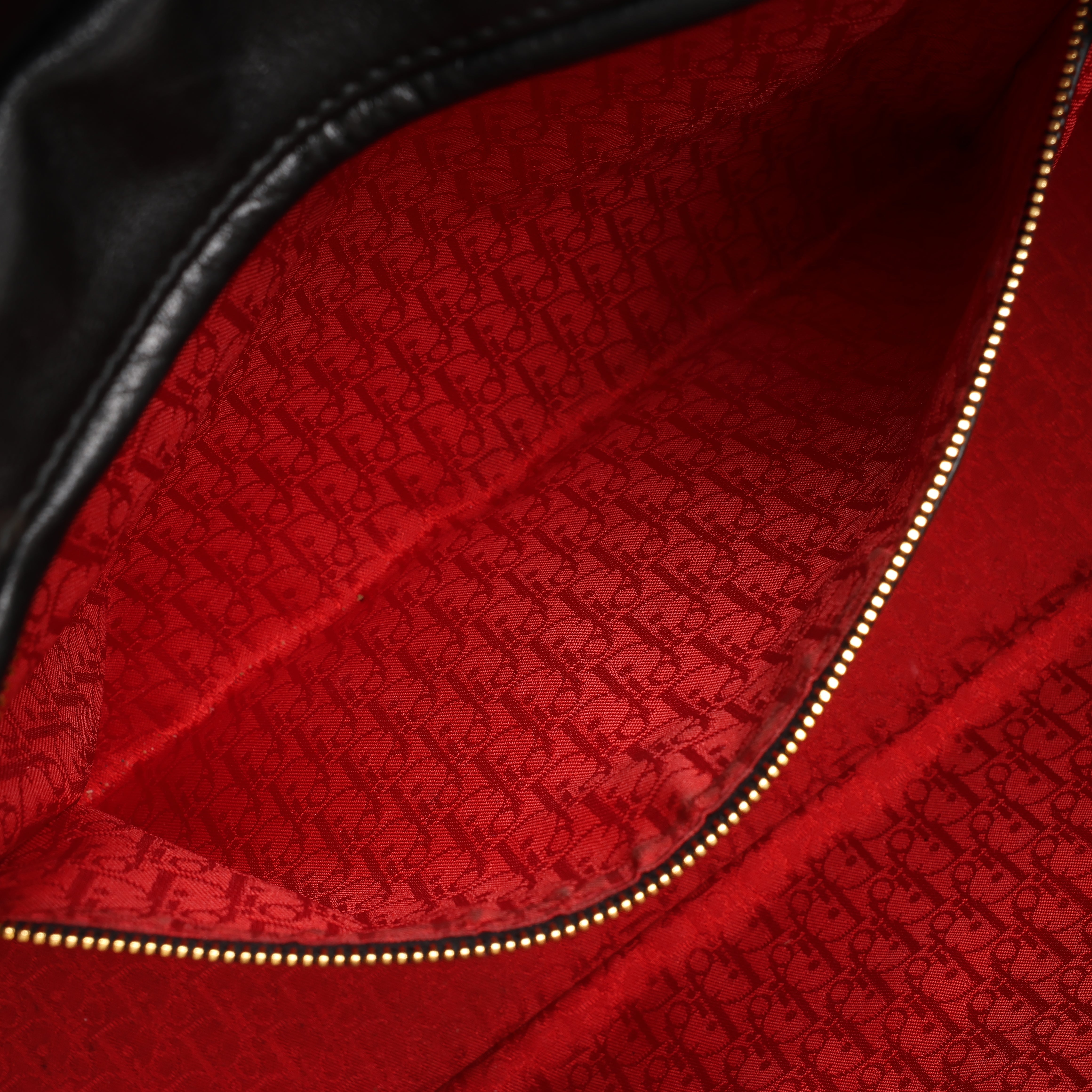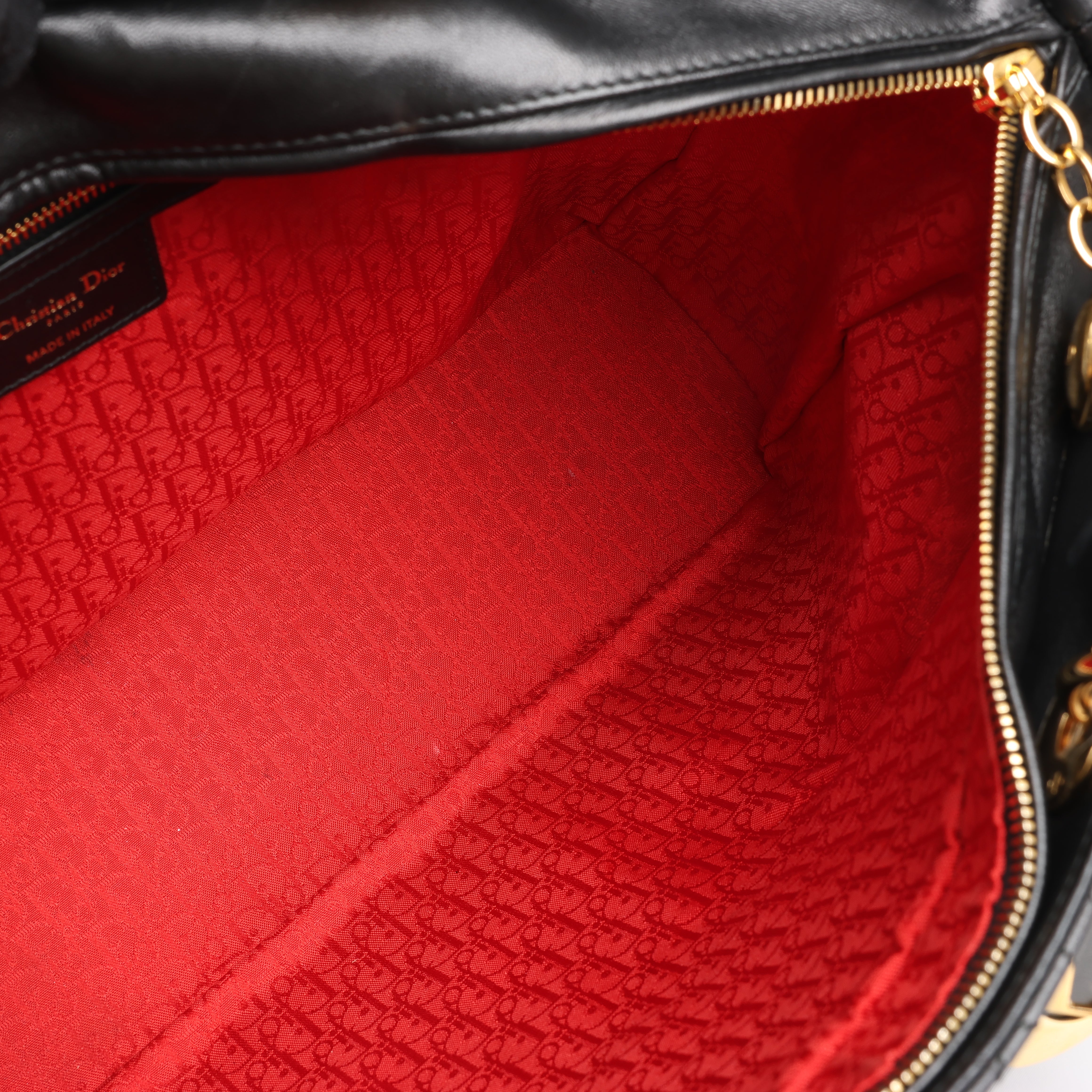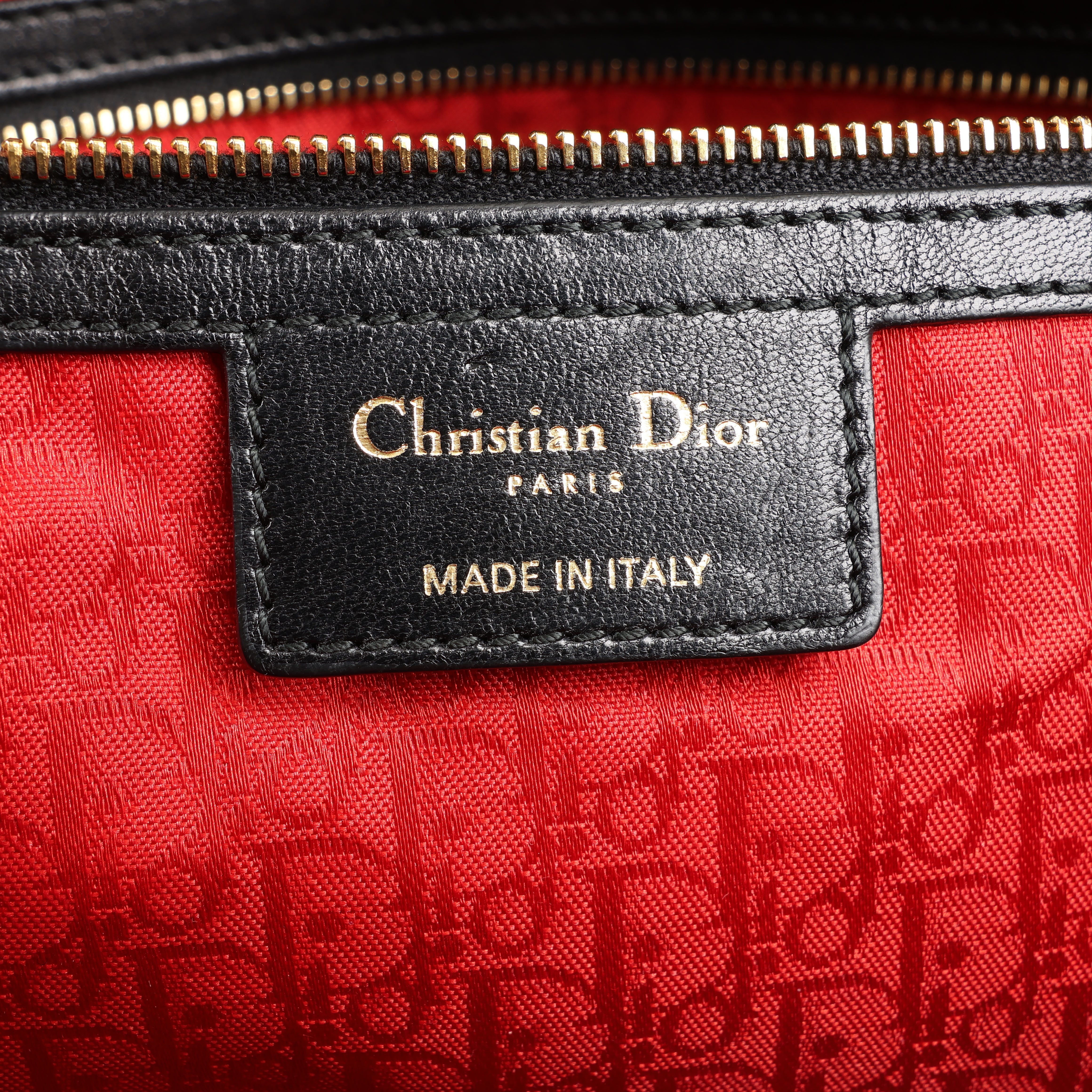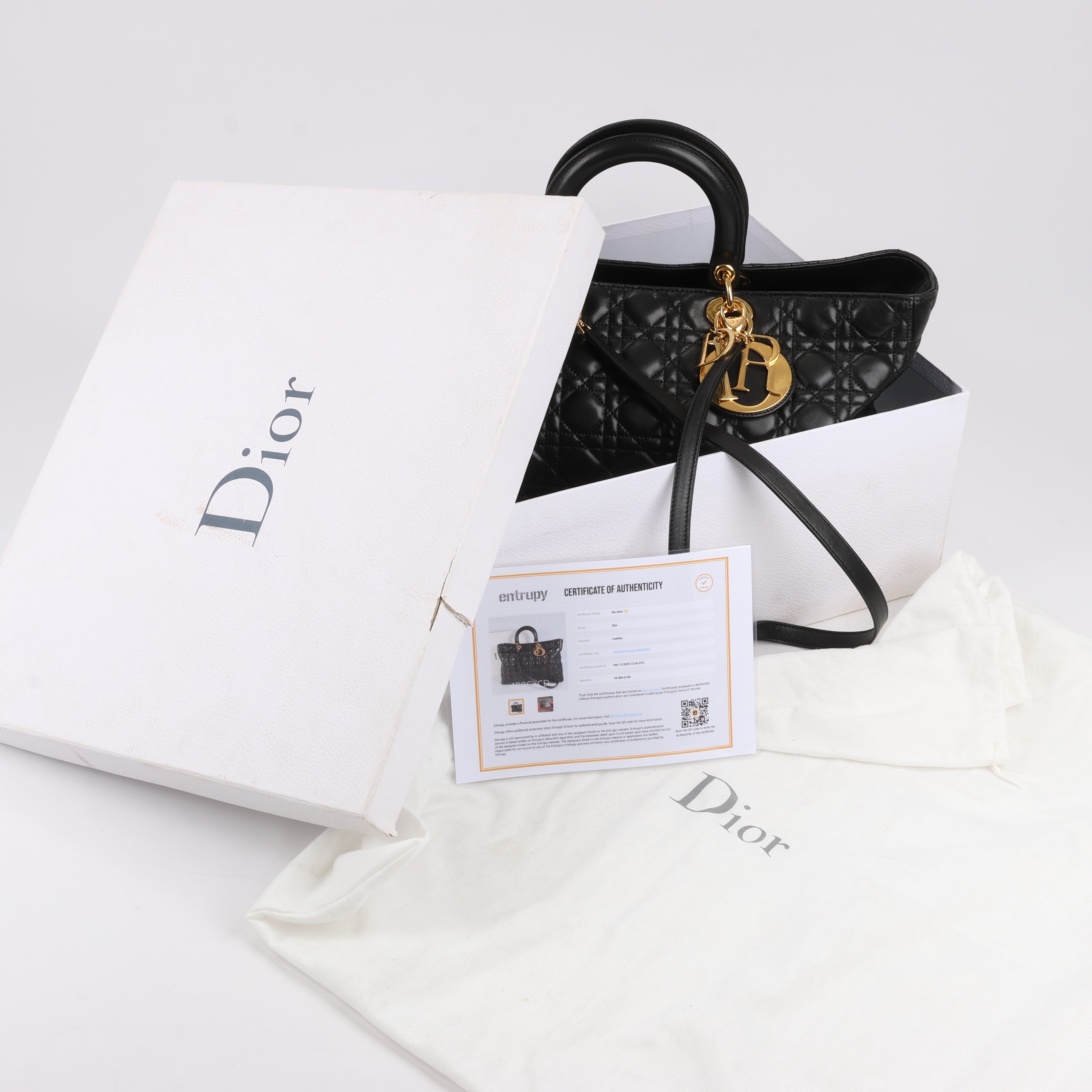 Brand: DiorModel: Lady DiorSize: LargeWidth: 41 cmHeight: 27.5 cmExterior Condition: ExcellentInterior Condition: ExcellentCondition Details: Exterior leather is clean and beautiful in great condition, with rubbings on the corners and scratches. The handles and strap are clean and firm in good condition. Hardware is shiny and crisp with light surface scratches. The interior lining is clean and in excellent condition.Colour: BlackInterior Colour: RedHardware Colour: GoldMaterial: Patent leatherComes With: Sholder strap, dust bag, box (damaged), Entrupy authentication certificate