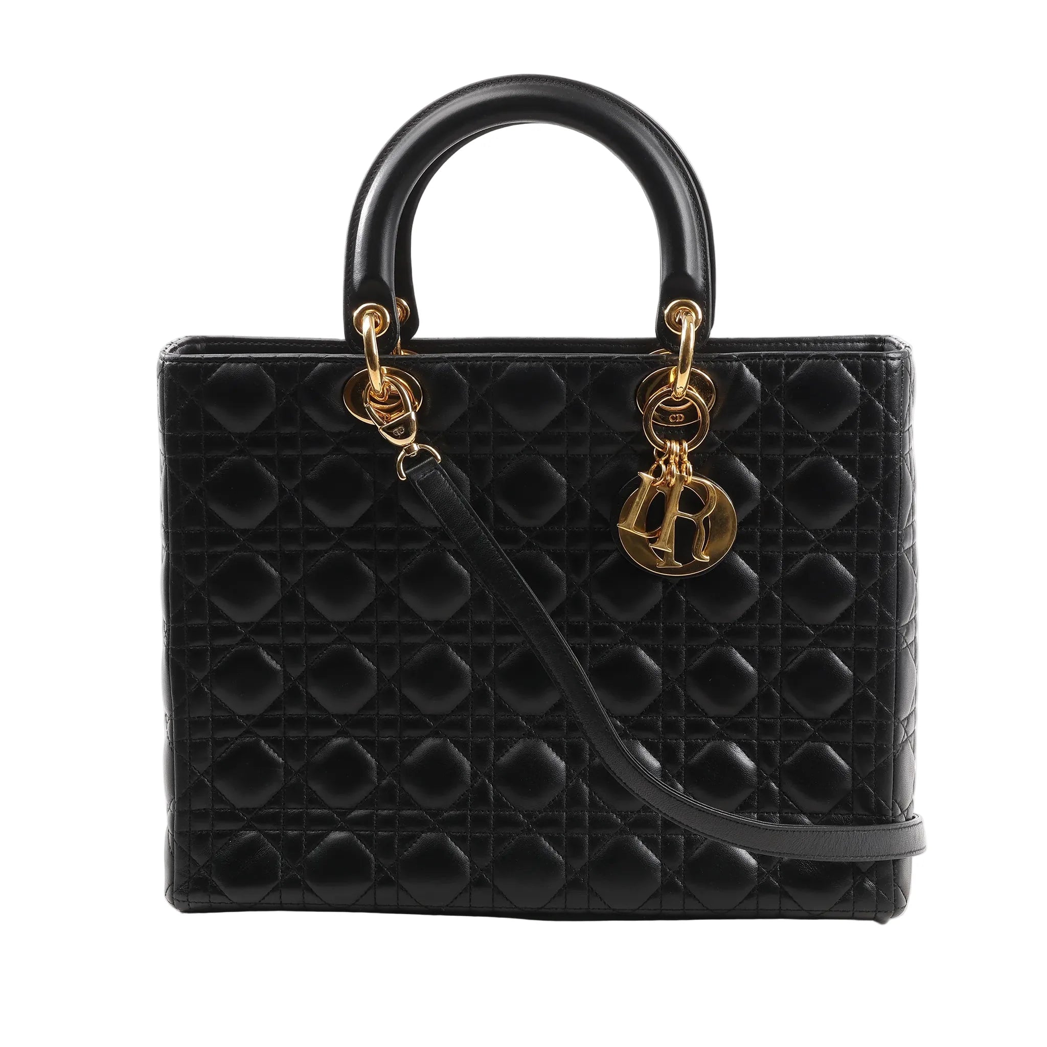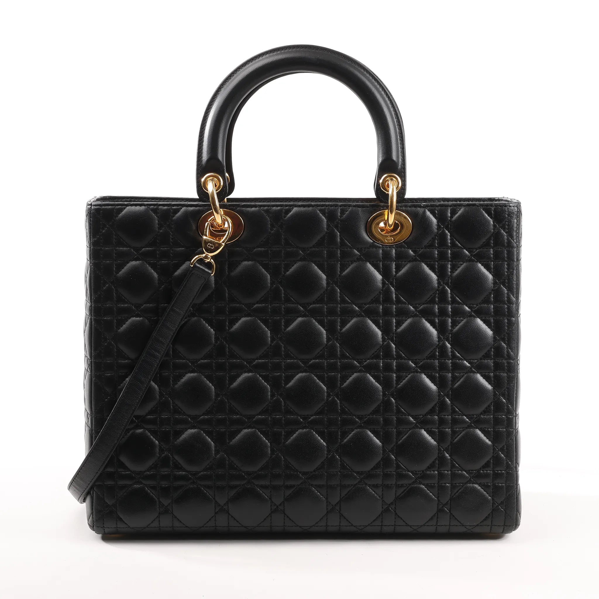 Elevate your style with the Dior Lady Dior Large Cannage 2Way Handbag in Black. Crafted from luxurious black lambskin leather, this iconic piece features gold-tone hardware and signature Cannage stitching—perfect for timeless elegance and versatility.