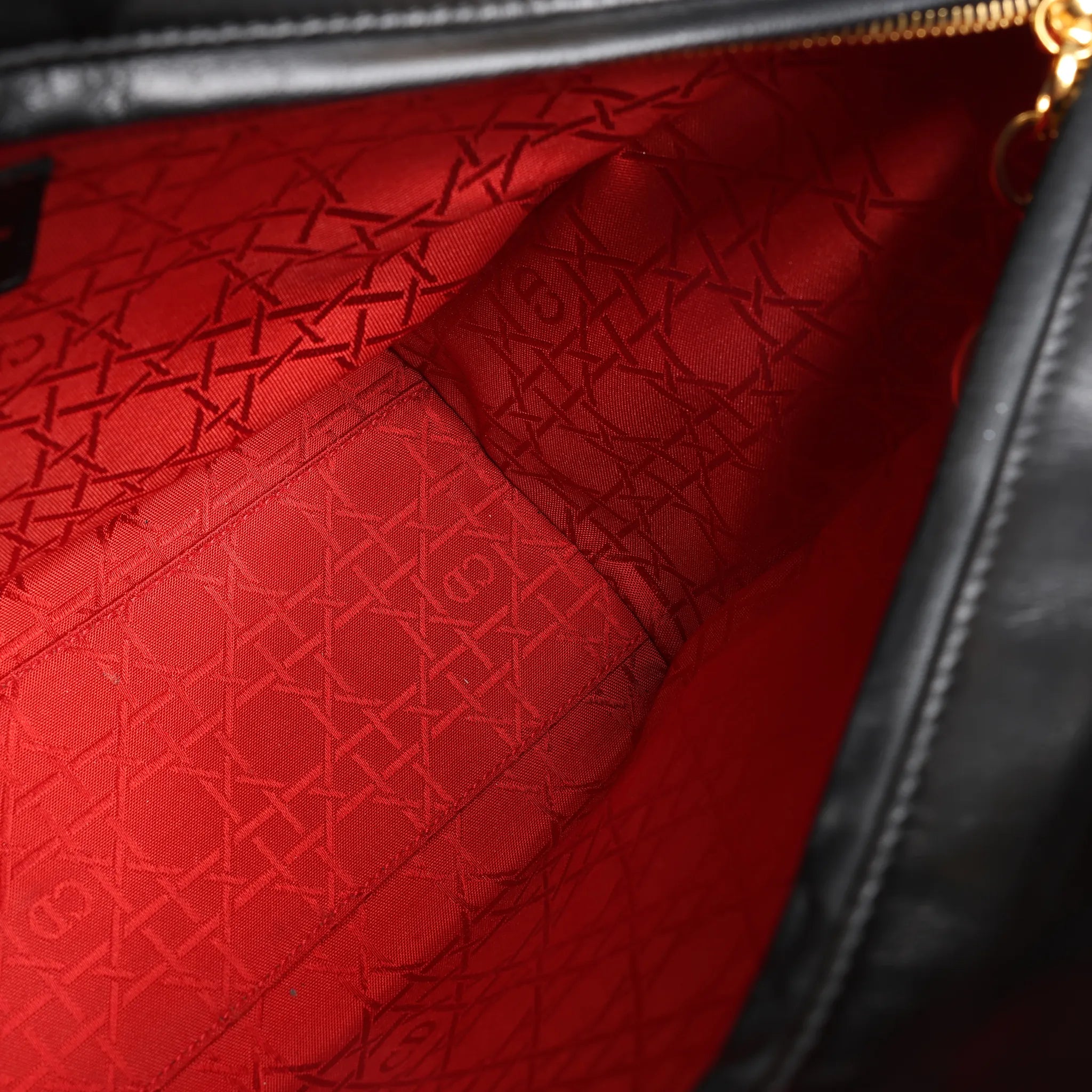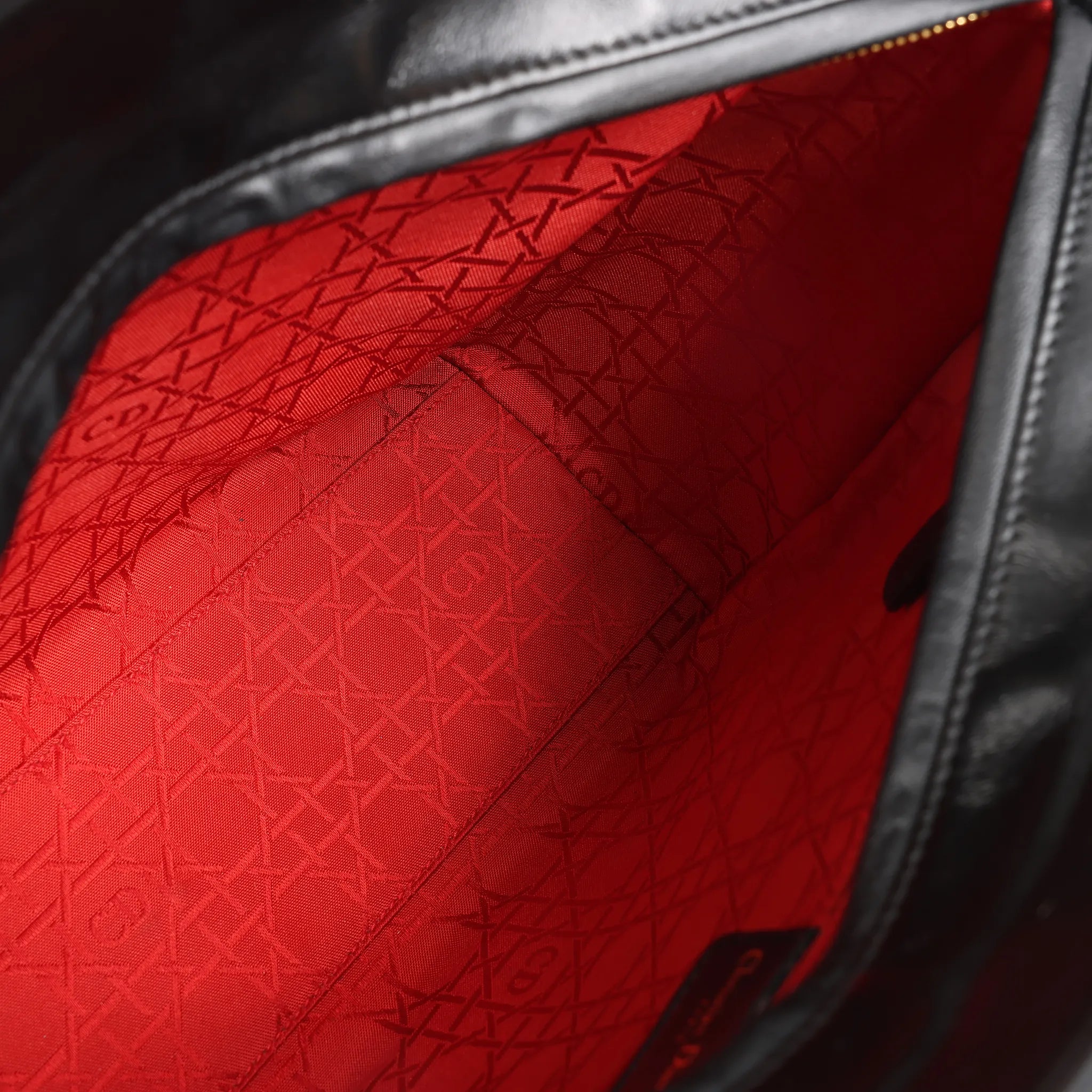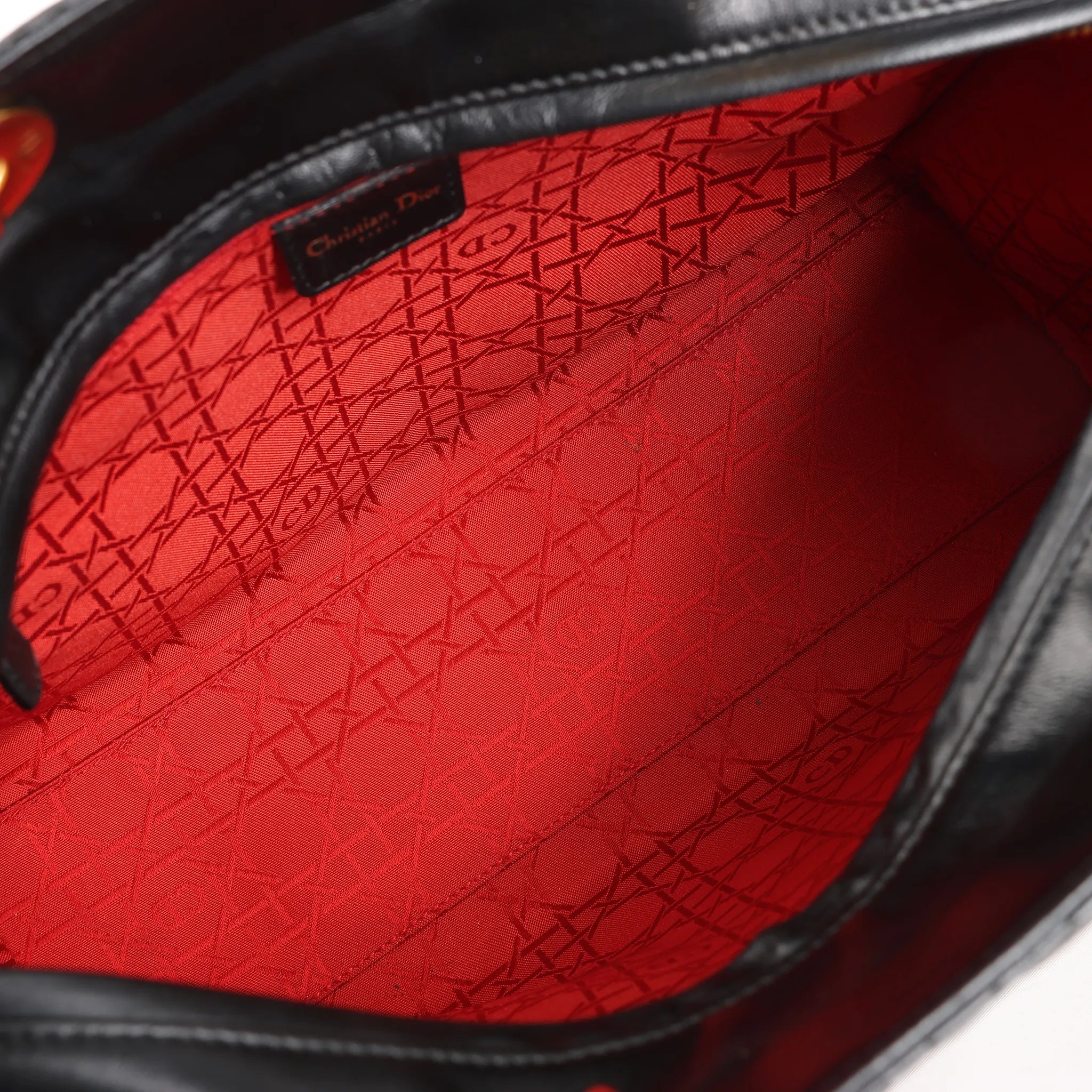 Brand: DiorModel: Lady DiorSize: LargeWidth: 32cmHeight: 26.5 cmExterior Condition: ExcellentInterior Condition: ExcellentCondition Details: Exterior leather is clean and beautiful in excellent condition. The handles are clean and firm in good condition. Hardware is shiny and crisp with surface scratches. The interior lining is clean and in excellent condition.Colour: BlackInterior Colour: RedHardware Colour: GoldMaterial: LeatherComes With: Entrupy authentication certificate, shoulder strap, dustbag