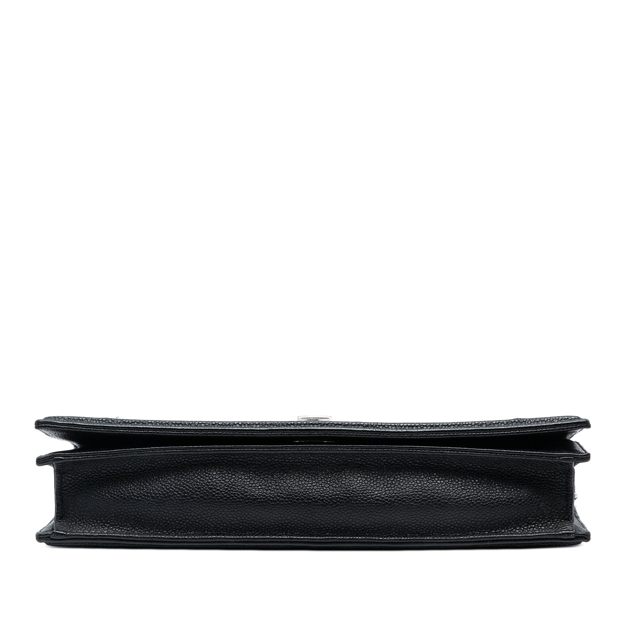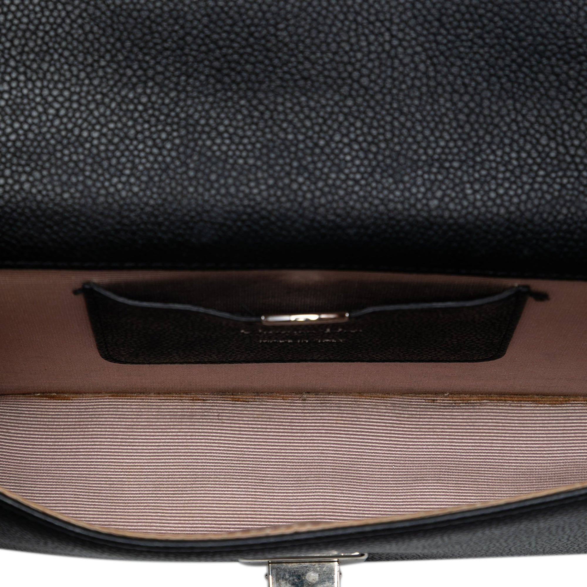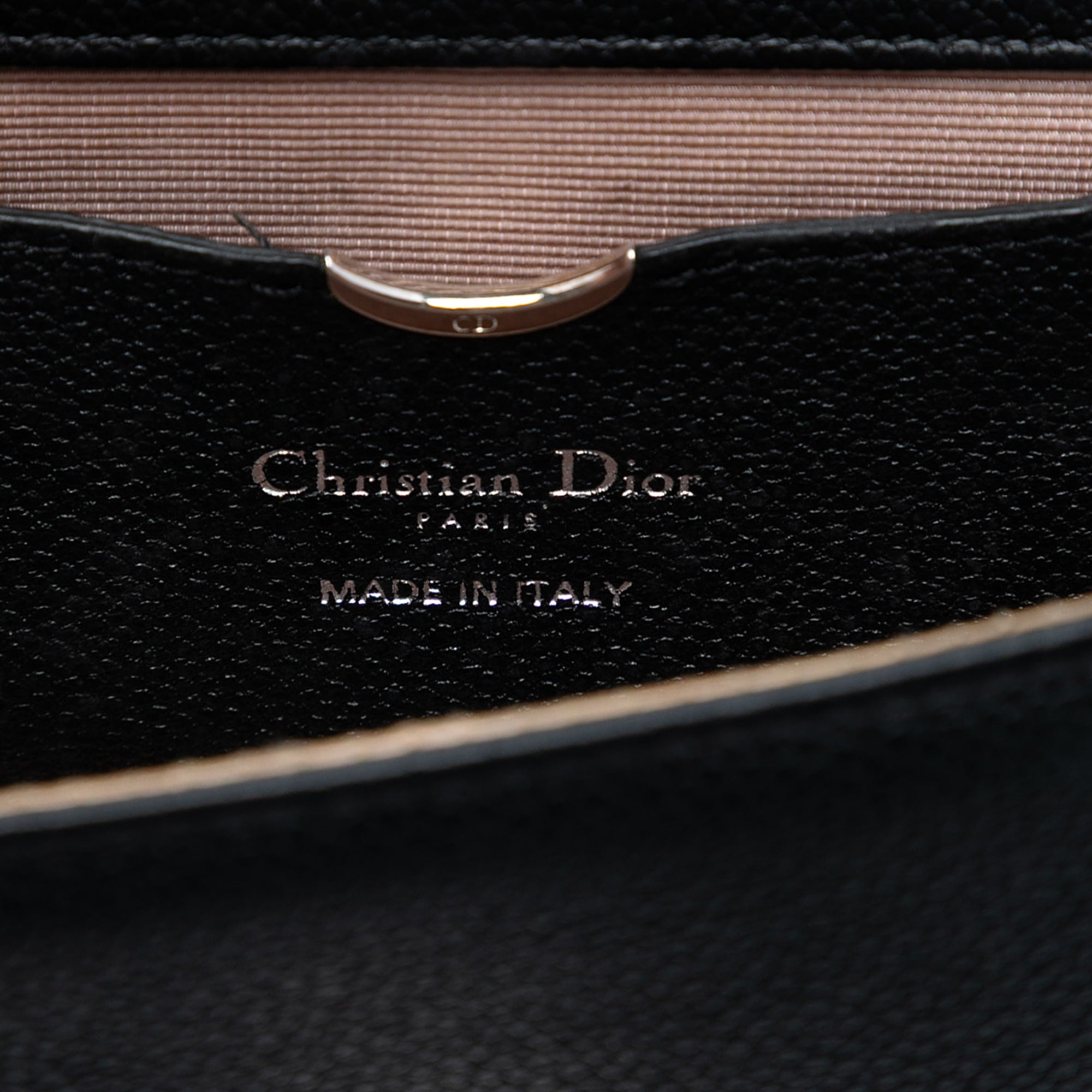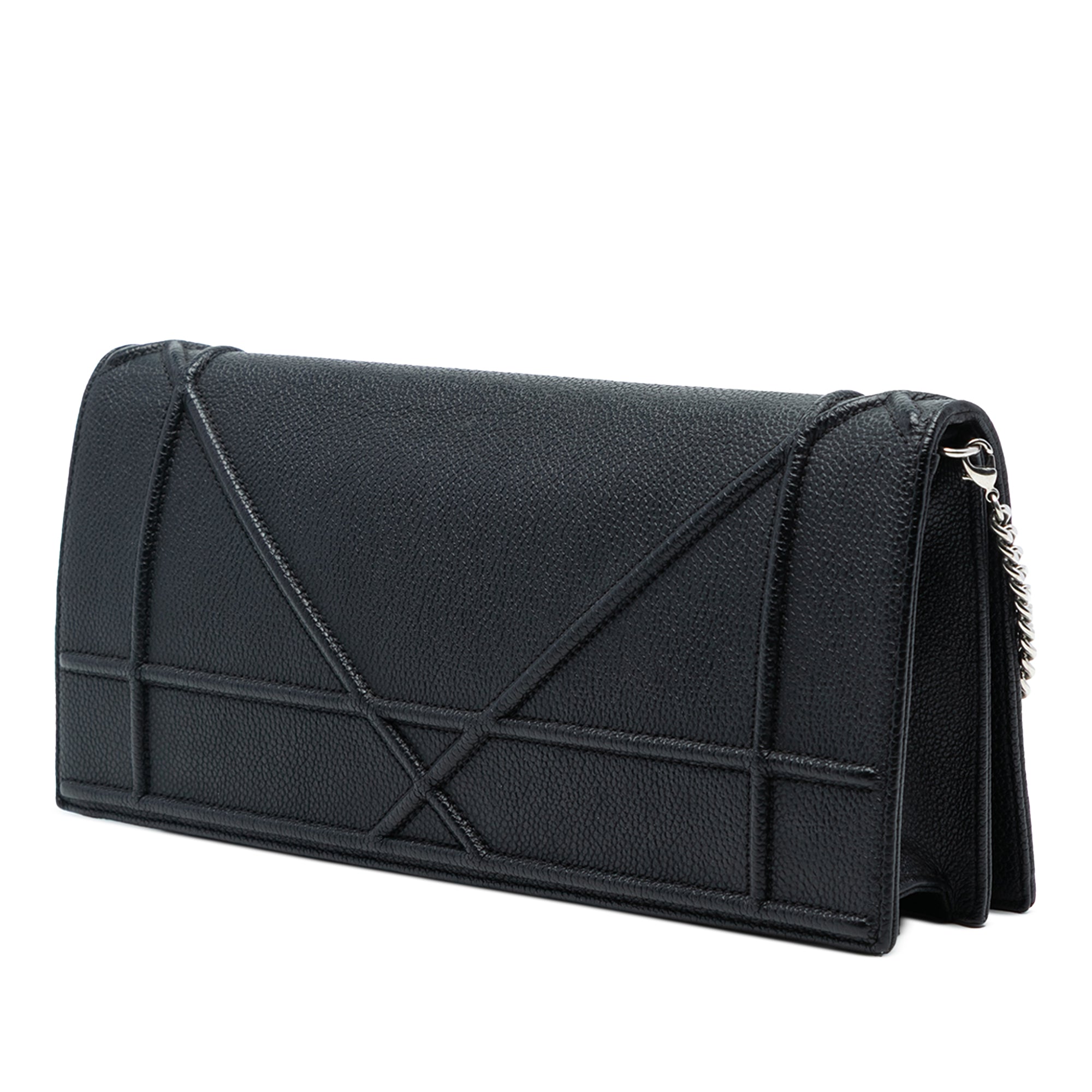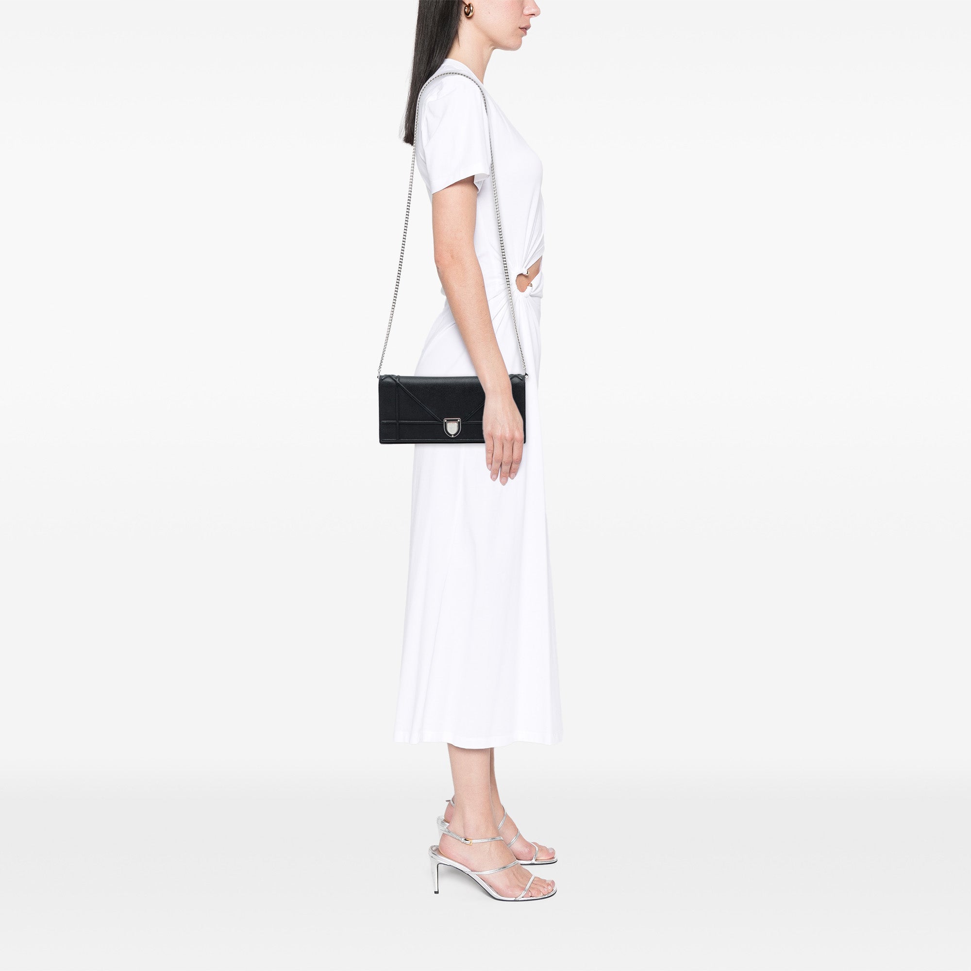 The Diorama Pochette features a grained leather body, a chain link strap, a front flap with push lock closure, and an interior slip pocket. Retail Price: 3240.00