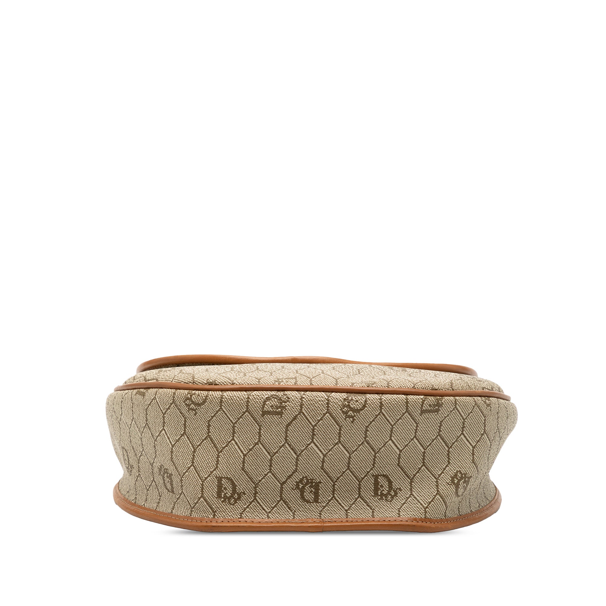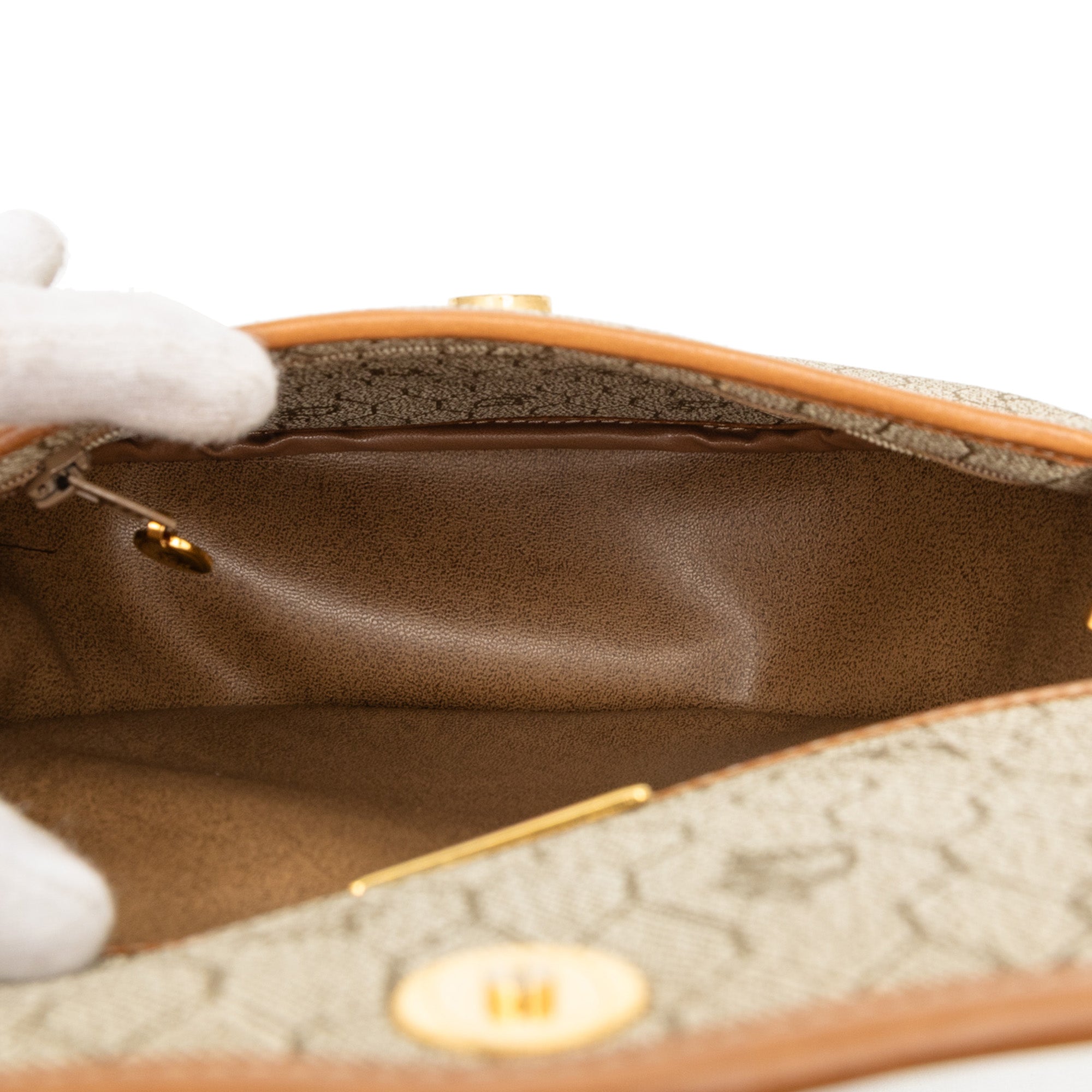 This crossbody bag features a canvas body with leather trim, a flat leather strap, a top flap with magnetic snap closure, and an interior zip pocket. Inclusion: box. Retail Price: 720.00