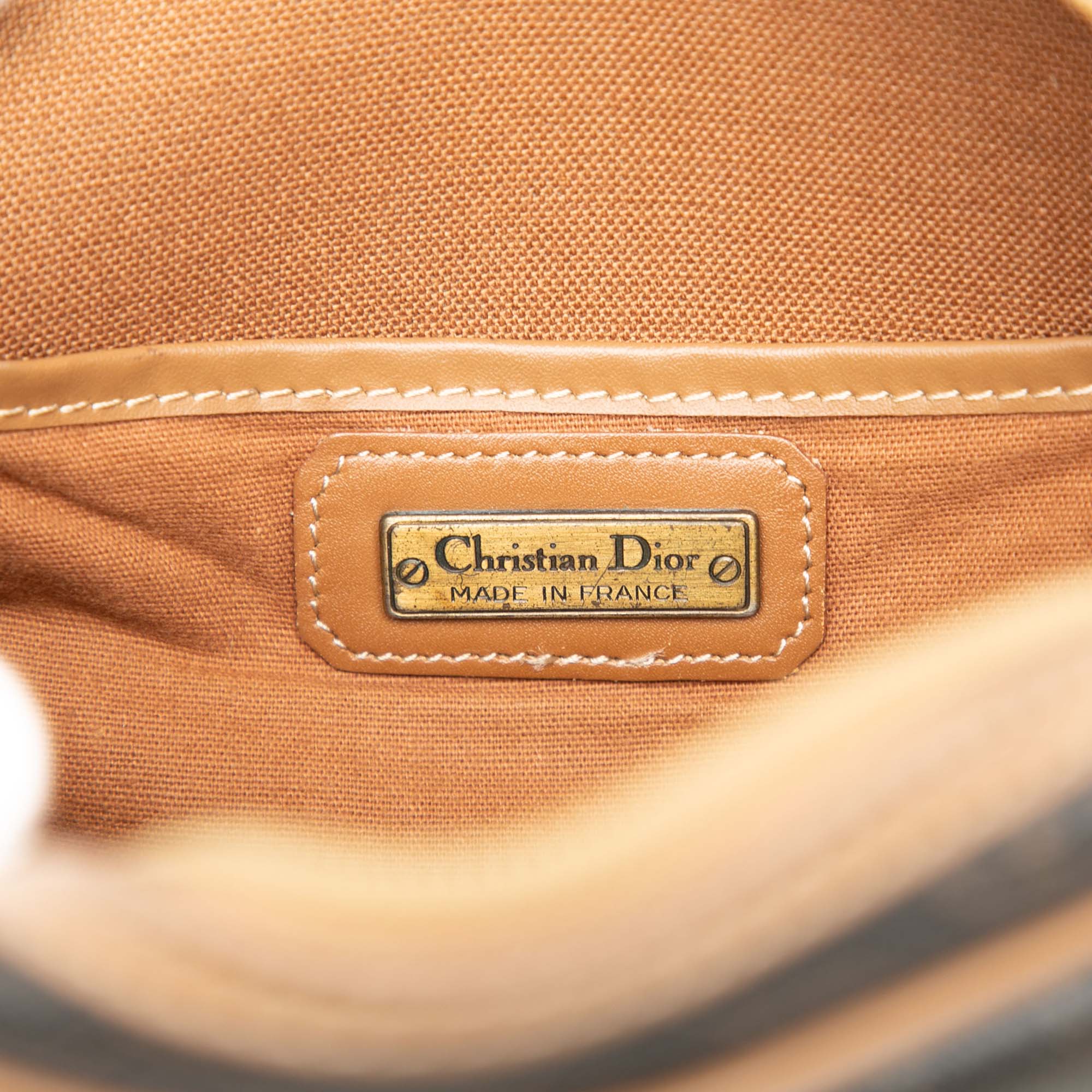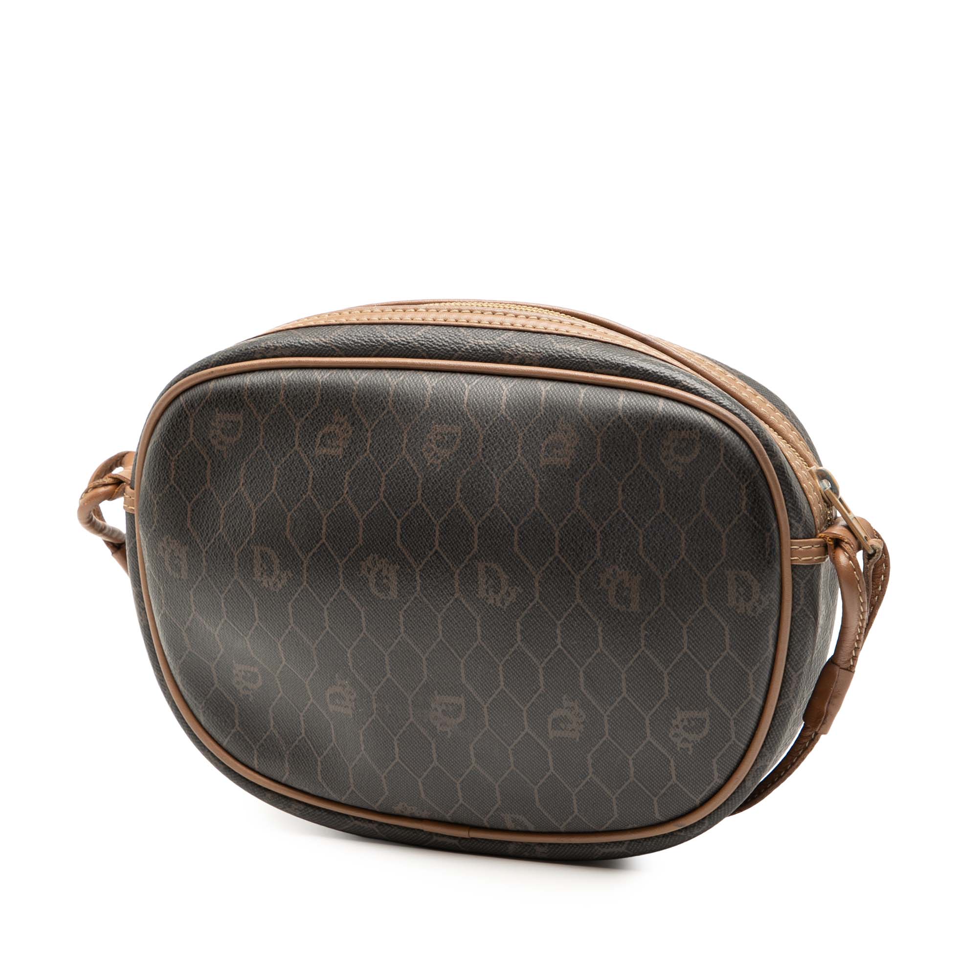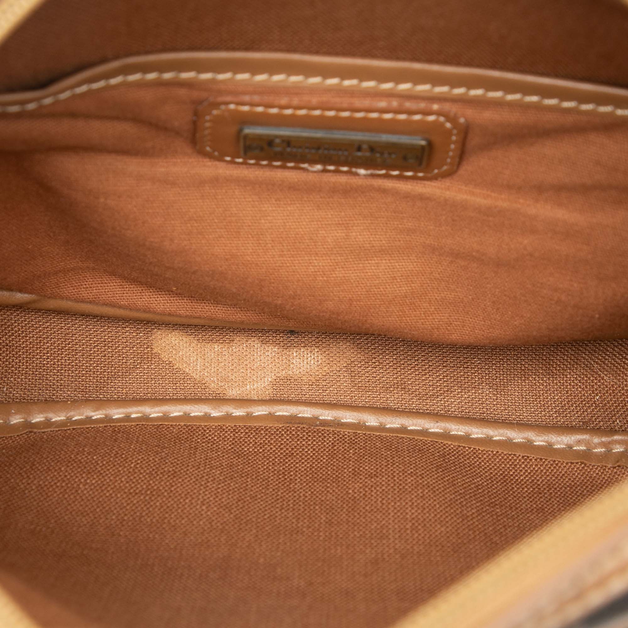 This crossbody bag features a coated canvas body with leather trim, a flat leather strap, a top zip closure, an exterior front slip pocket, and an interior pocket. Retail Price: 600.00