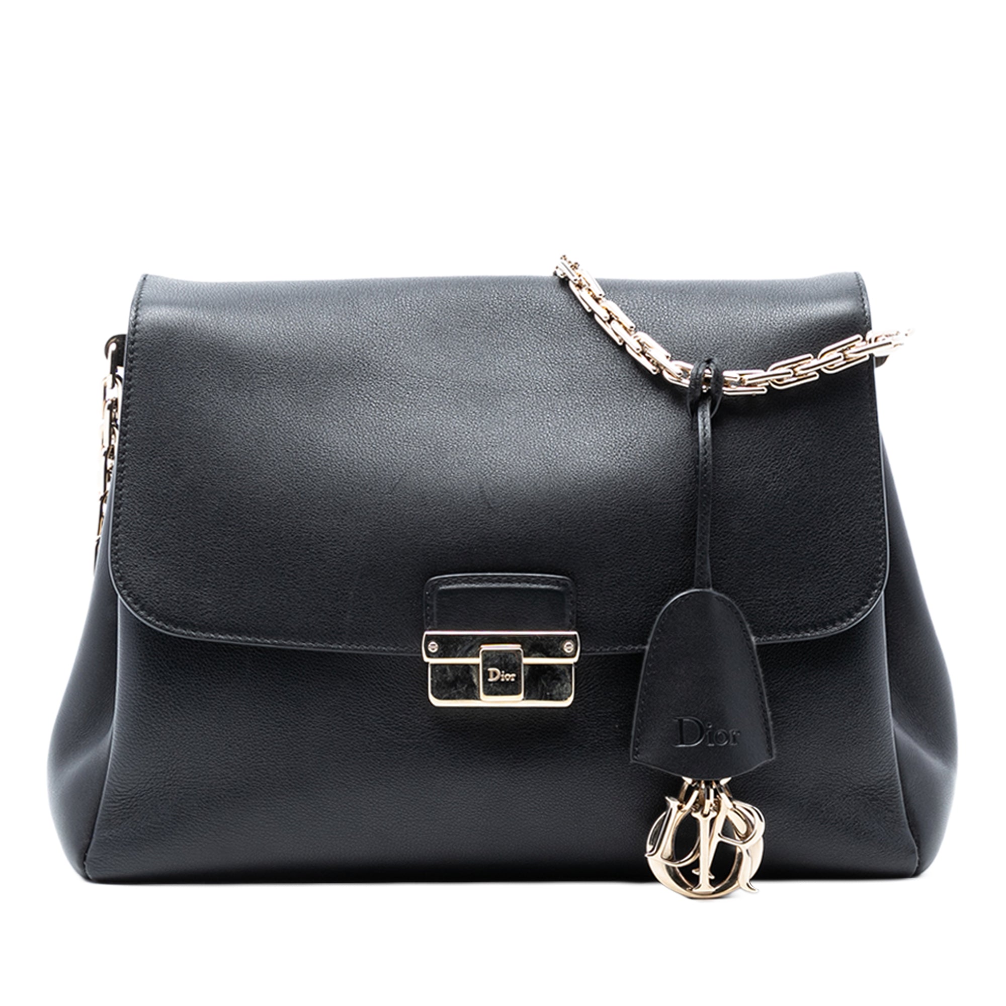 The Diorling features a calf leather body, a chain strap, a front flap with a metal push lock closure, and interior zip and slip pockets. Retail Price: 1960.00
