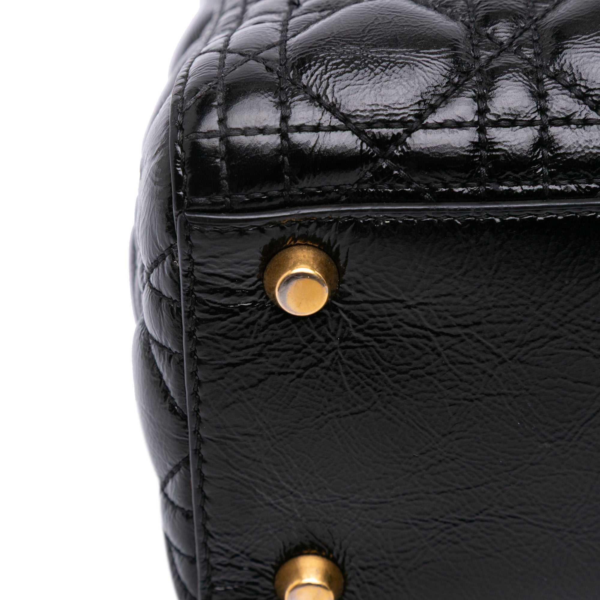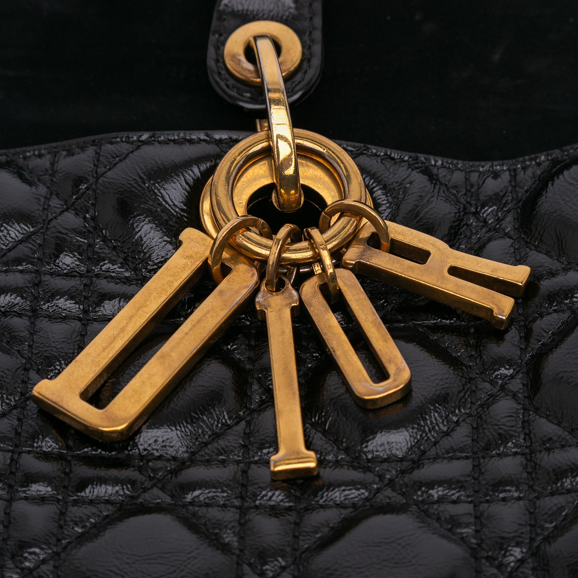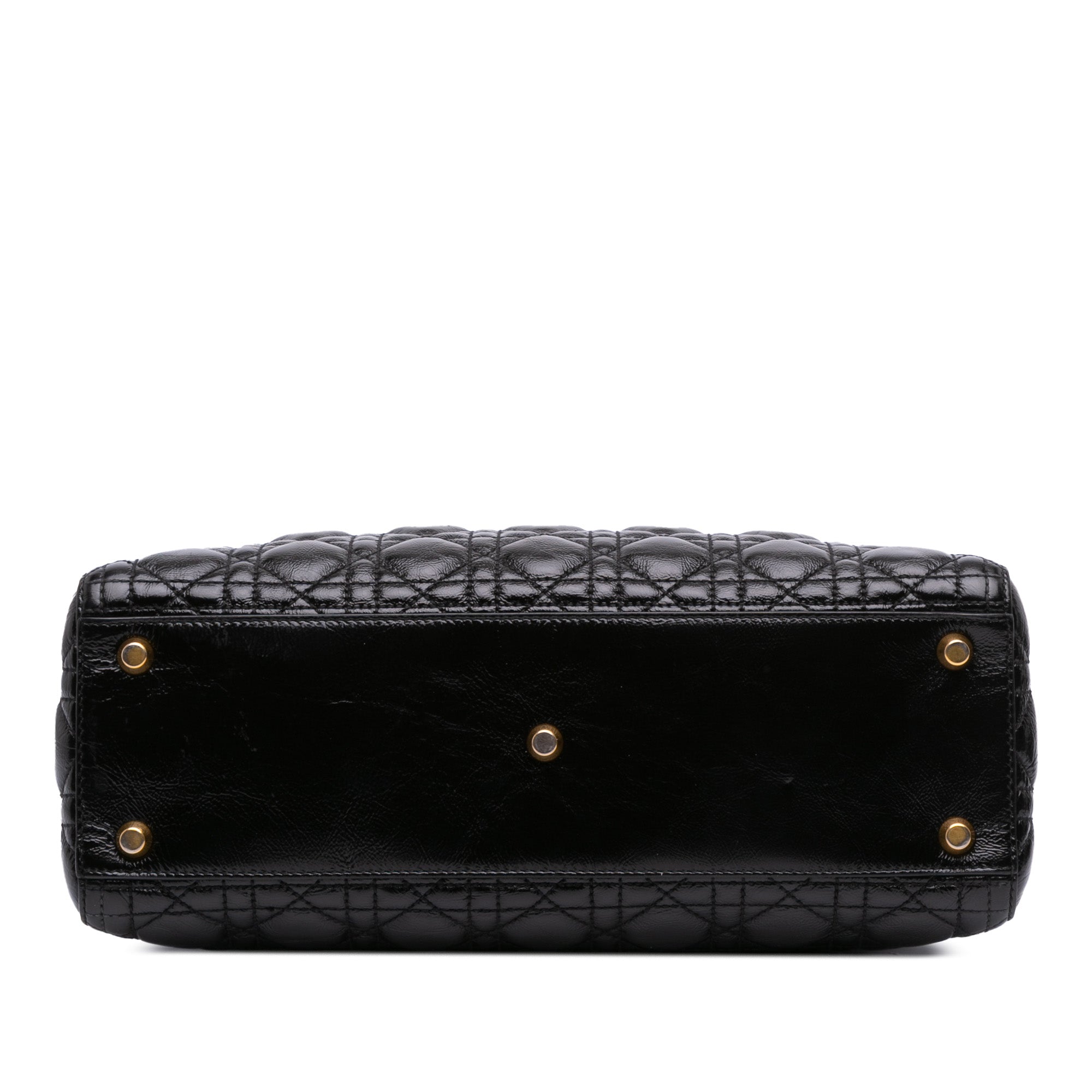 The Lady Dior features a quilted leather body, flat leather top handles, a detachable flat leather strap, a fold-in flap closure, and interior zip and slip pockets. Retail Price: 4400.00