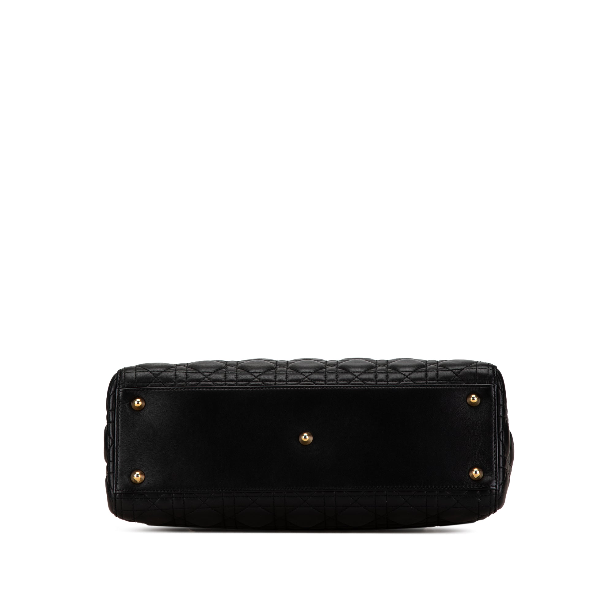The Lady Dior features a quilted lambskin leather body, flat top handles, a detachable flat leather strap, a top zip closure, and an interior zip pocket. Retail Price: 4500.00