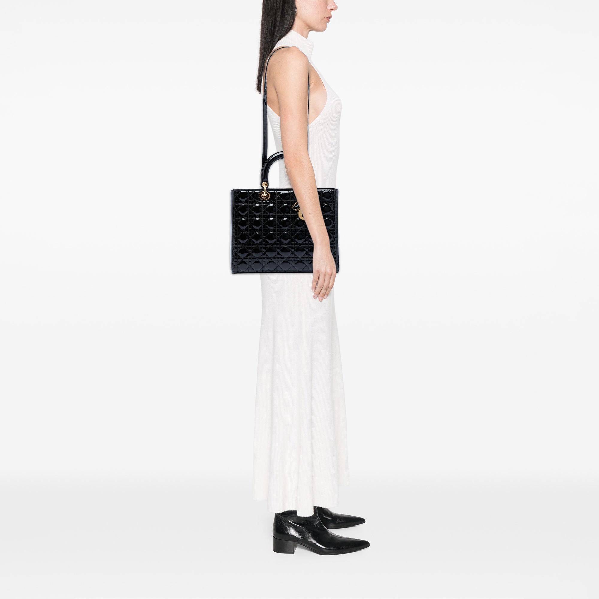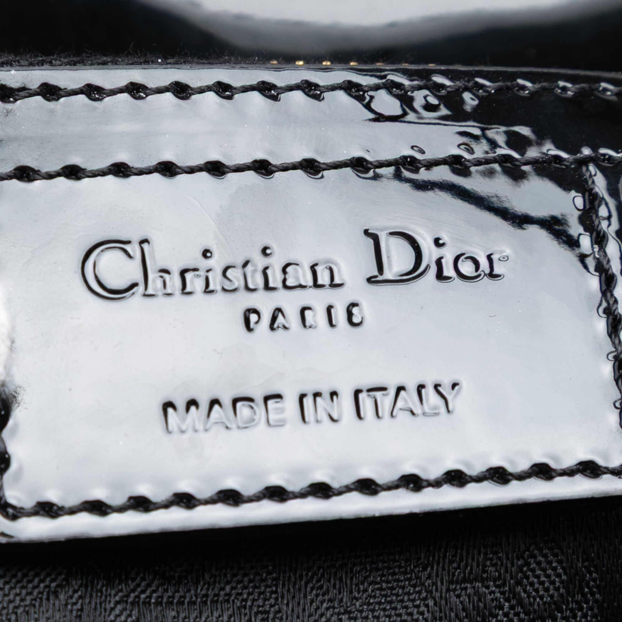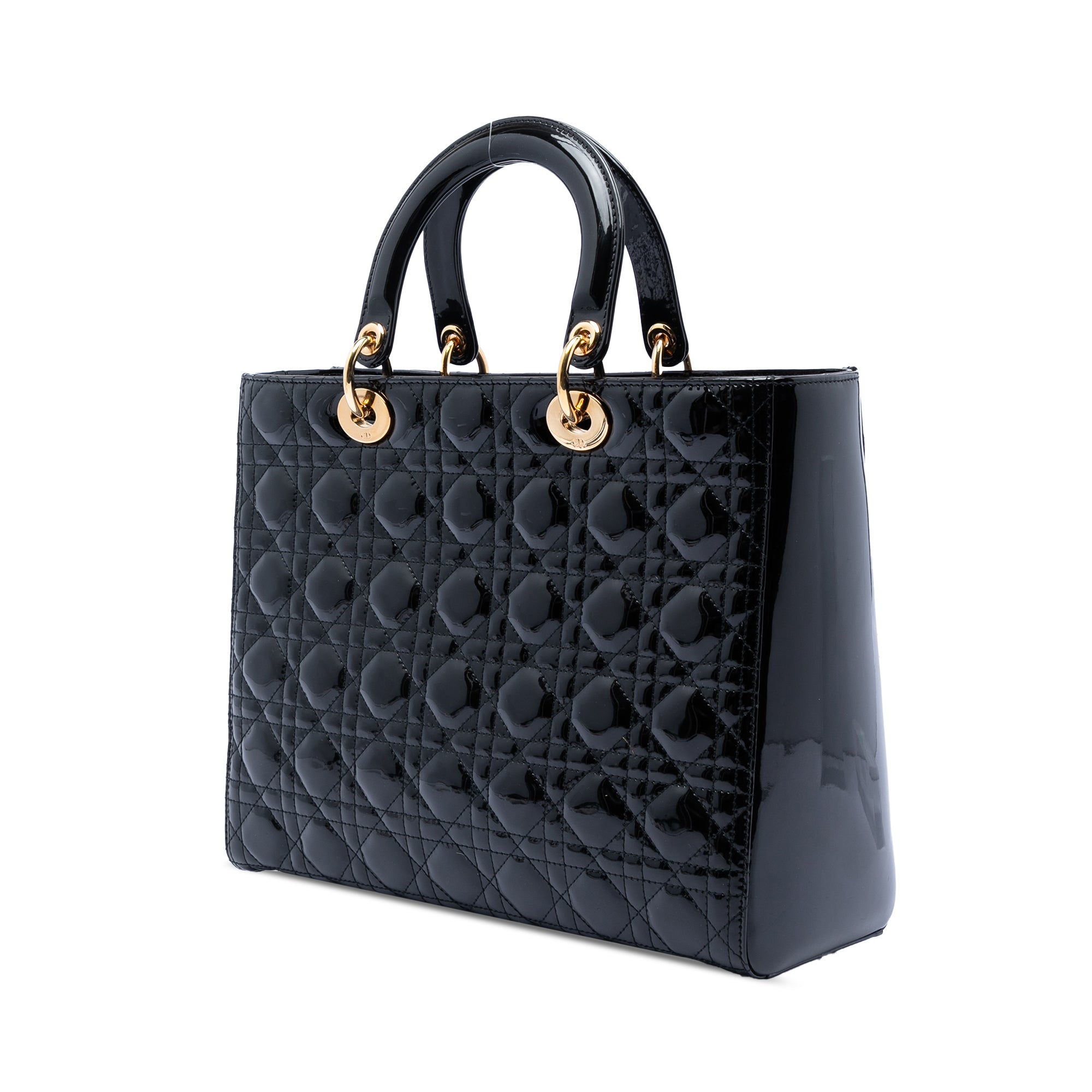 The Lady Dior features a quilted patent leather body, flat leather top handles, a detachable flat strap, a top zip closure, and an interior zip pocket. Retail Price: 6283.00