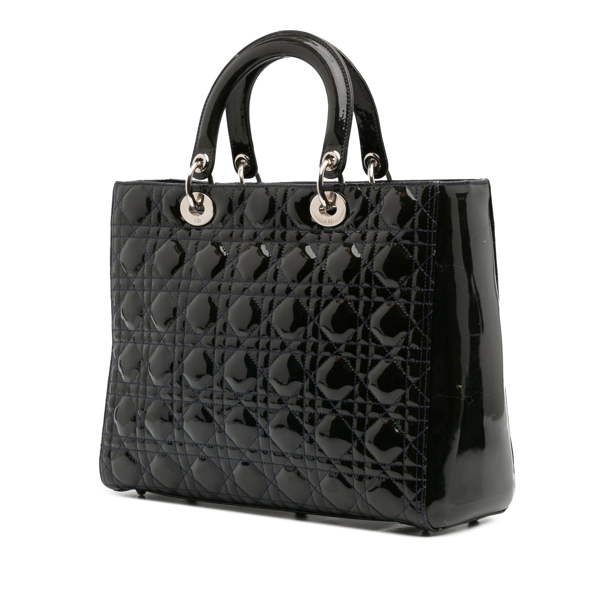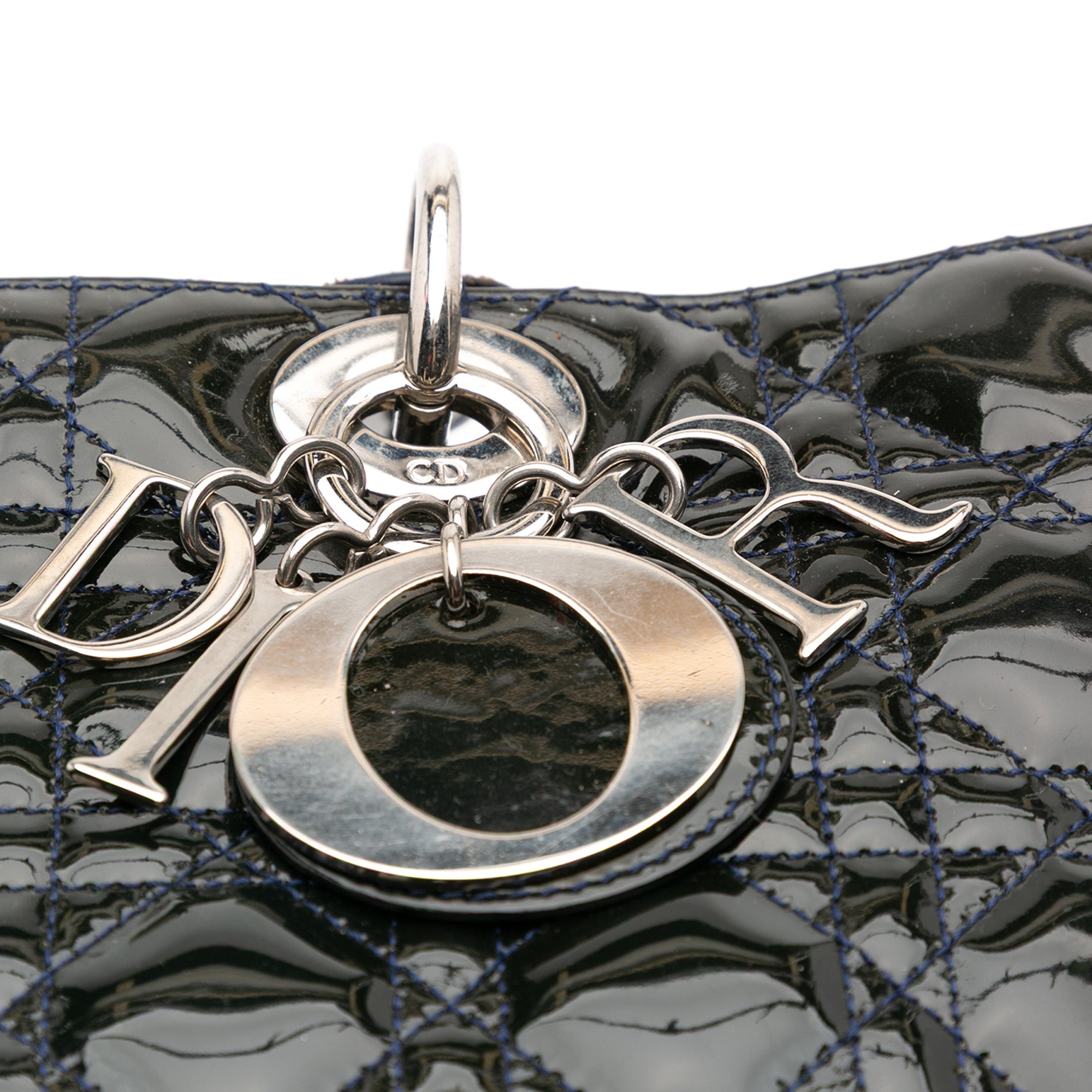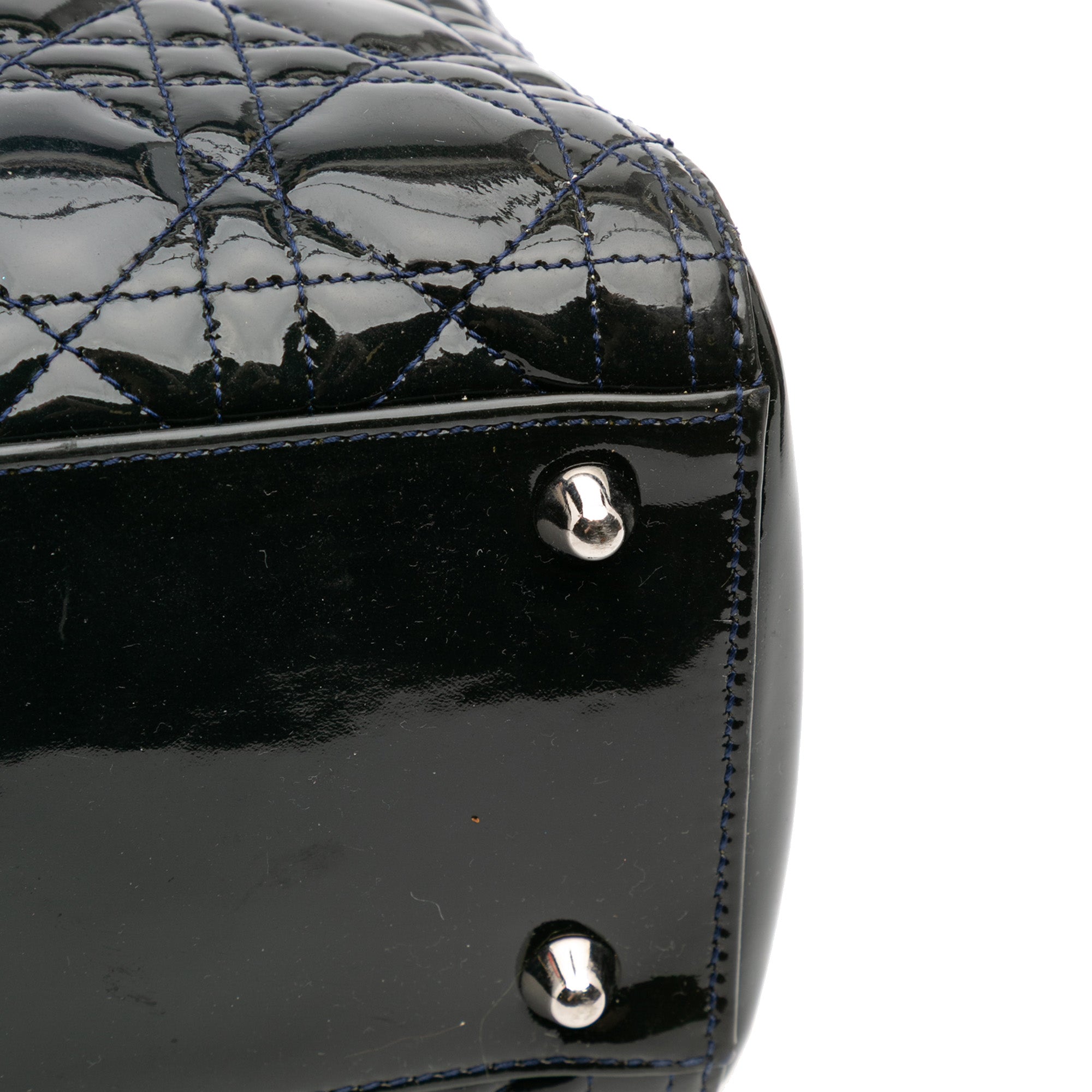 The Lady Dior features a quilted patent leather body, flat leather top handles, a detachable flat strap, a top zip closure, and an interior zip pocket. Retail Price: 6184.00