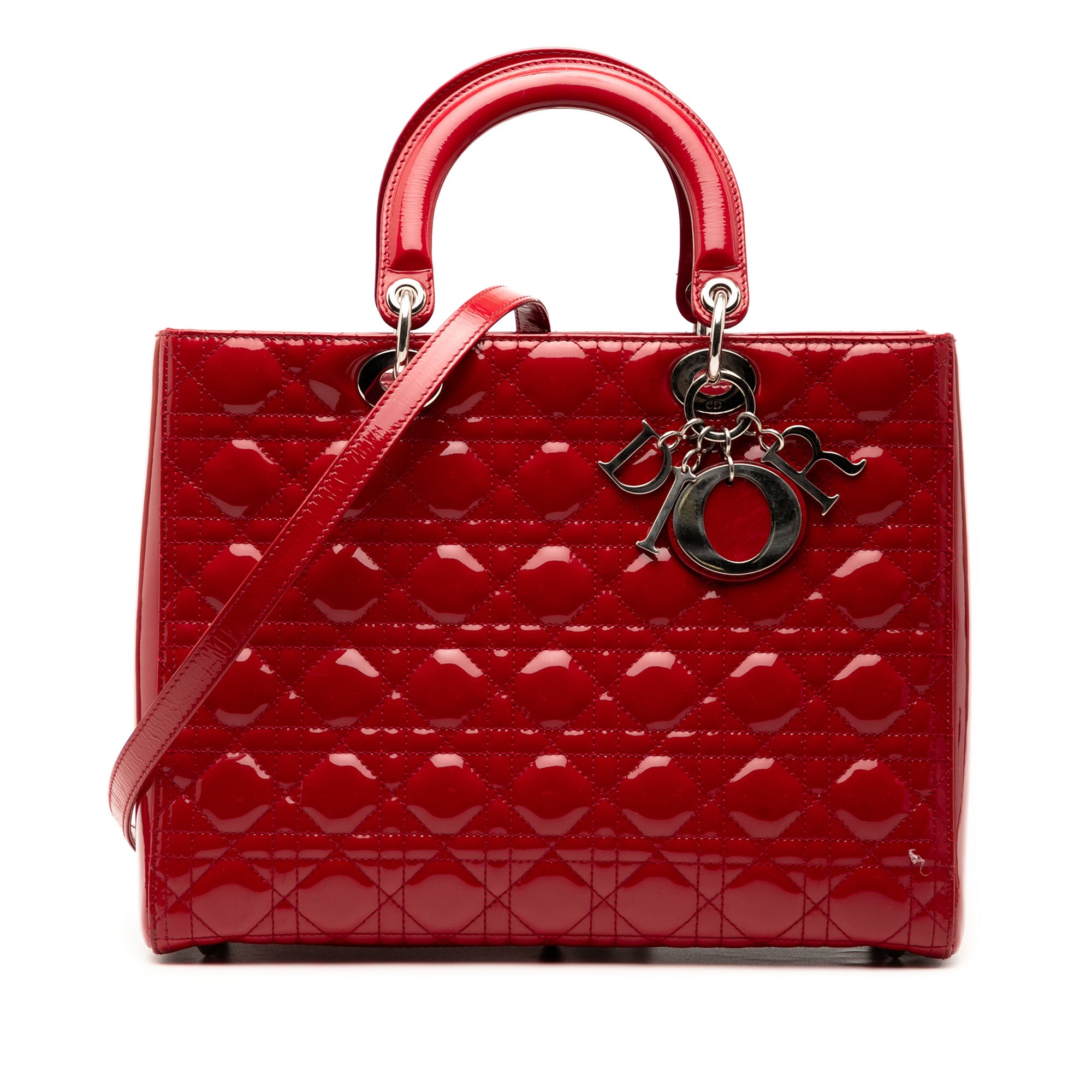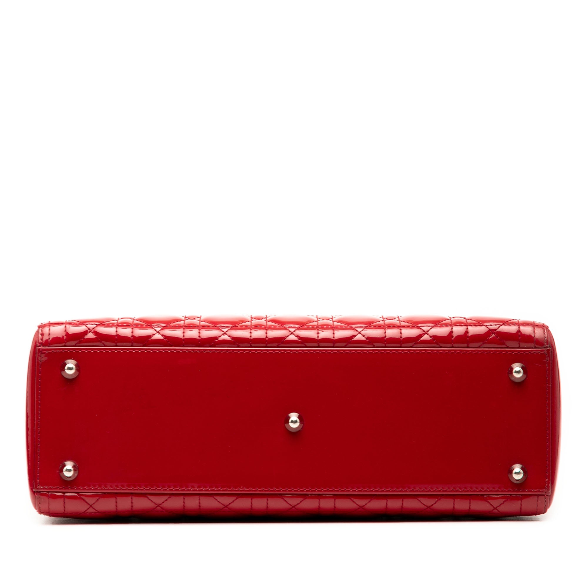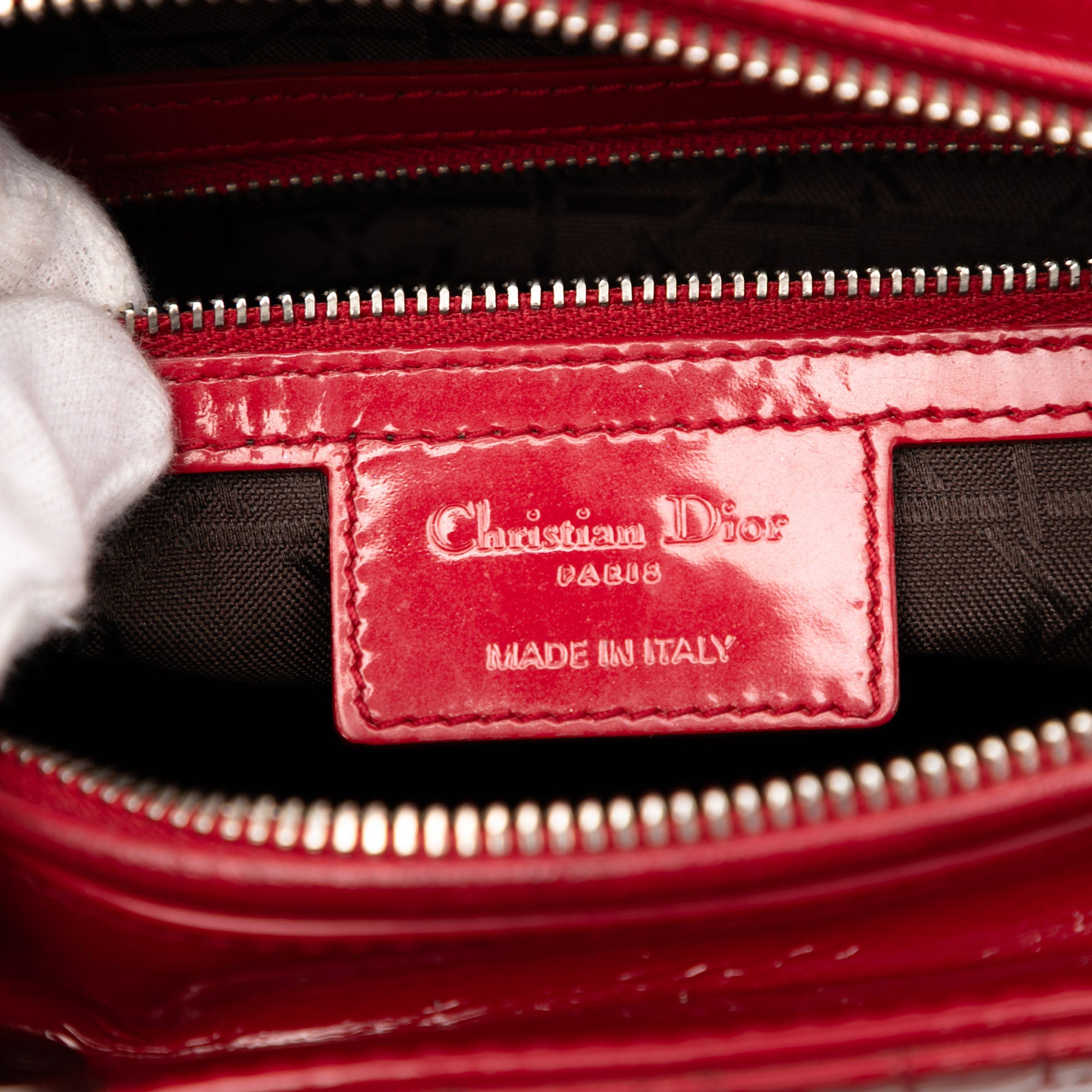 The Lady Dior features a quilted patent leather body, rolled top handles, a detachable flat leather strap, a top zip closure, and an interior zip pocket. Retail Price: 6500.00