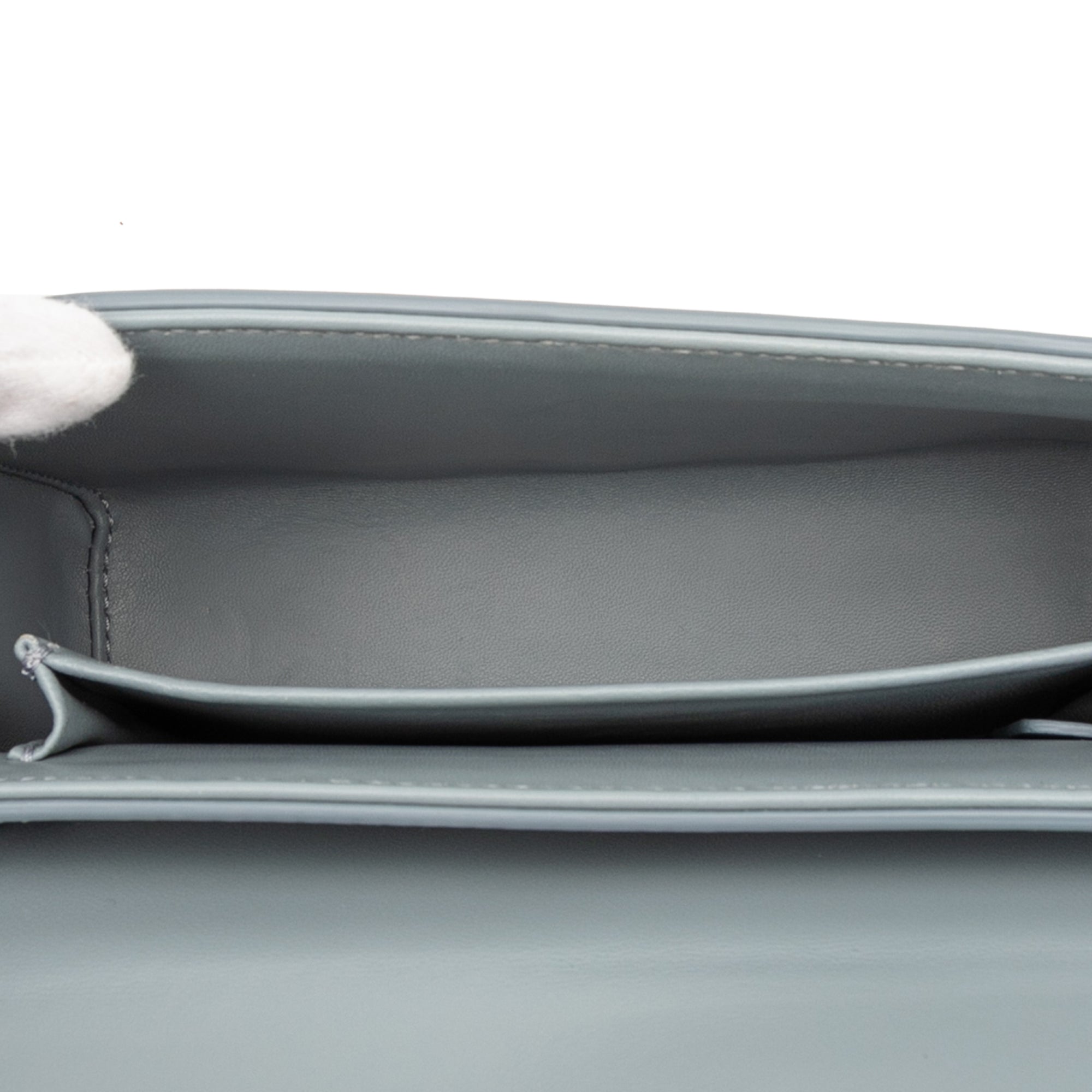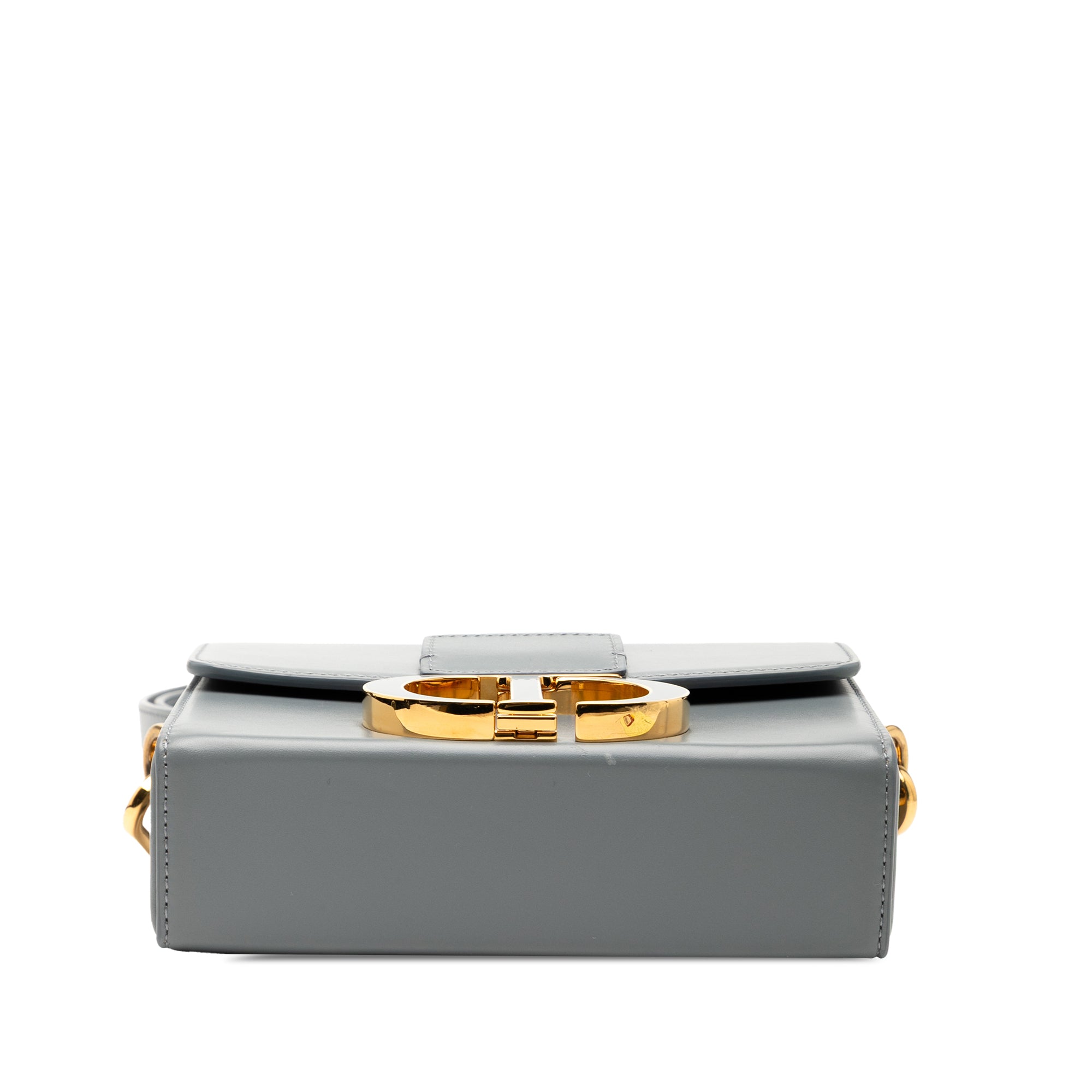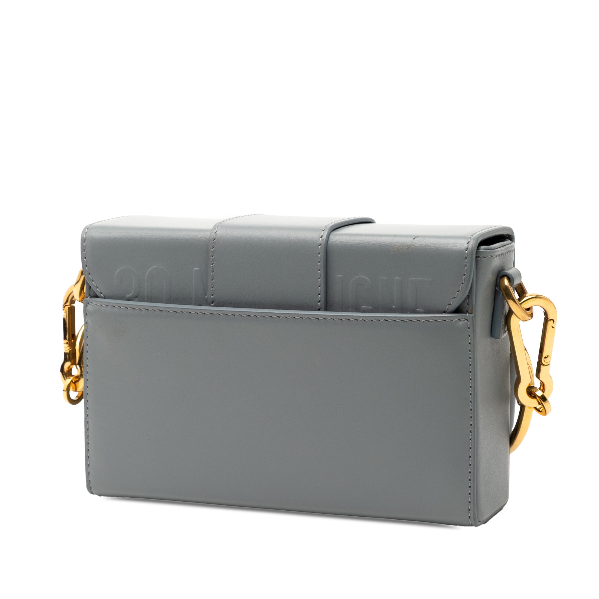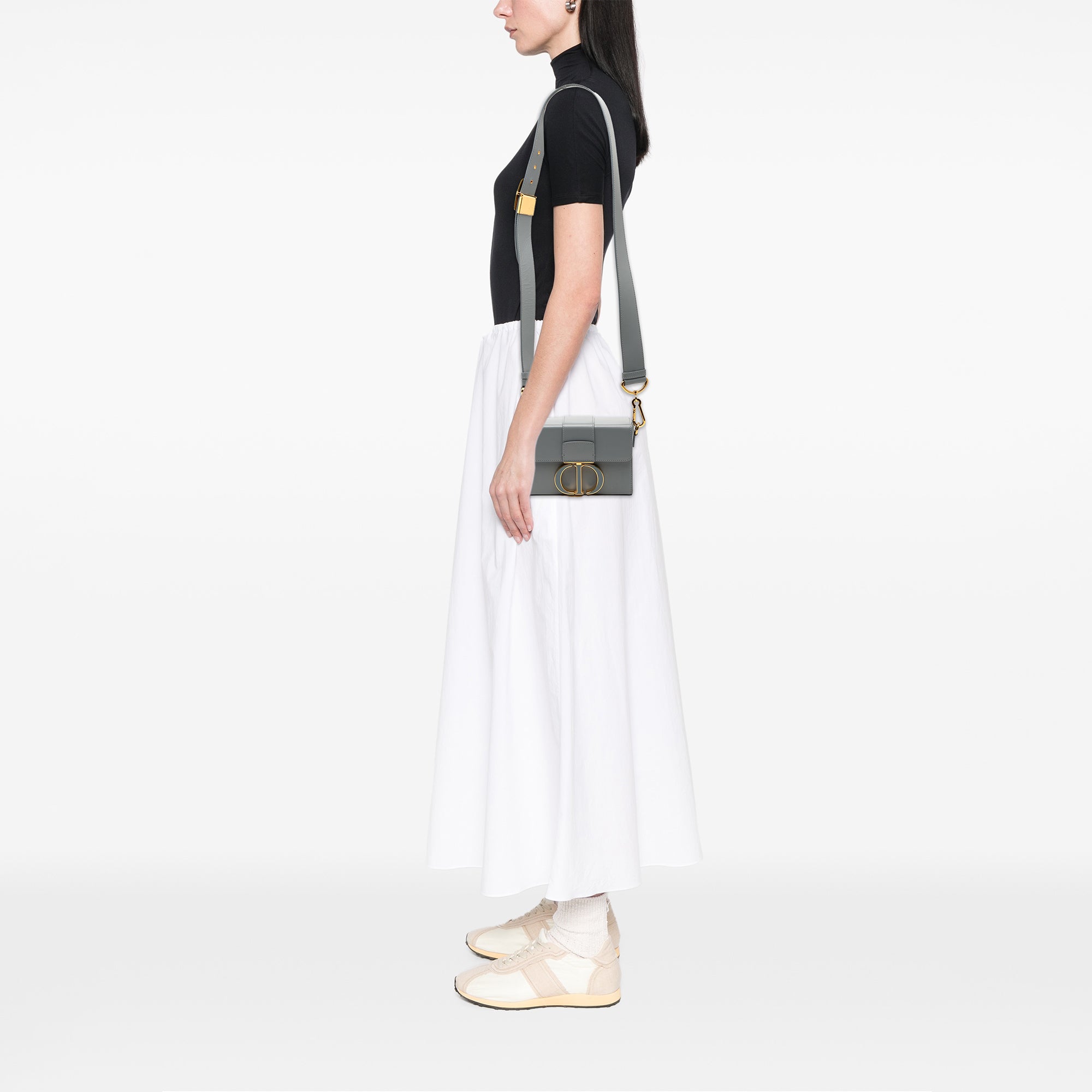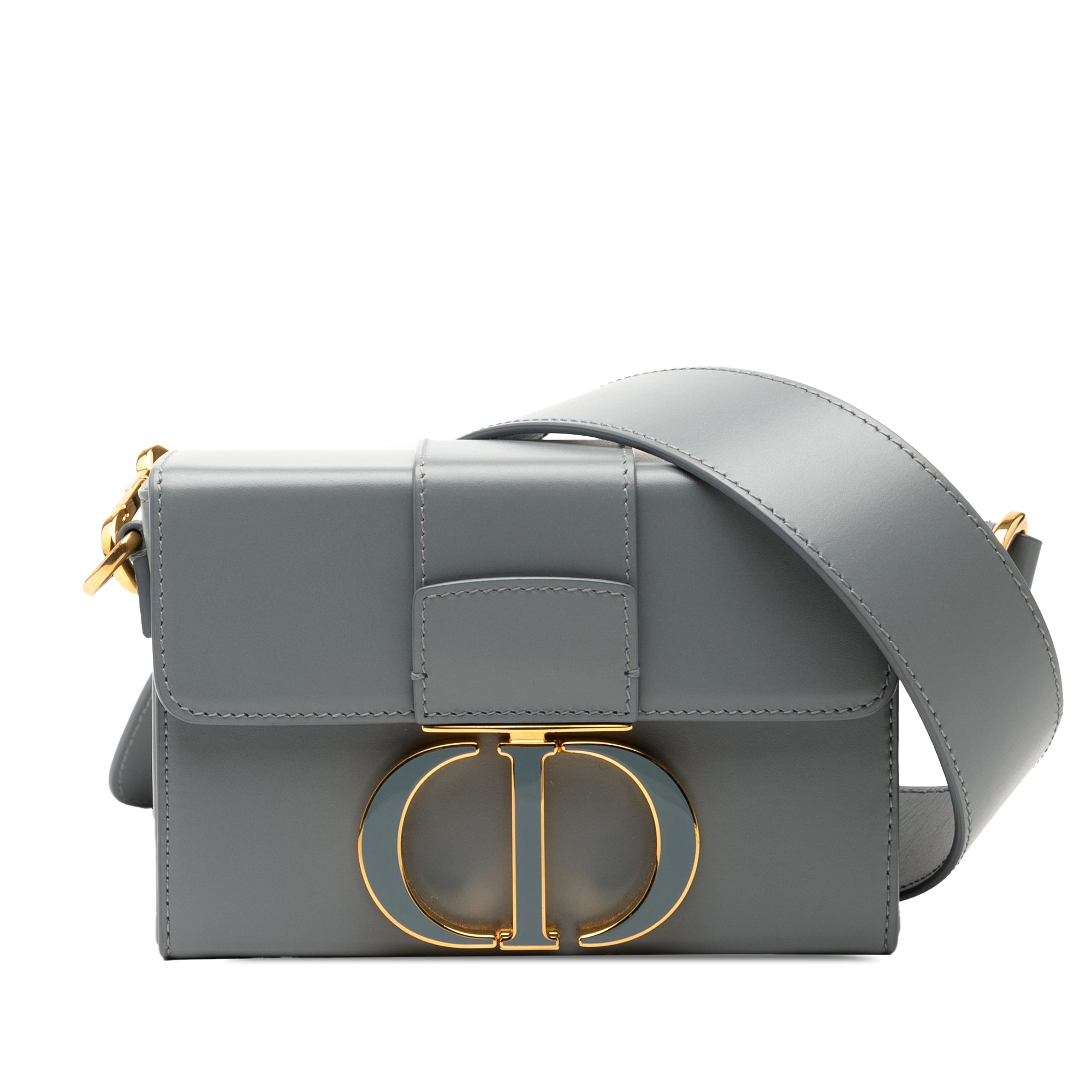The 30 Montaigne features a leather body, a flat leather shoulder strap, a push lock closure, an exterior back slip pocket, and an interior slip pocket. Retail Price: 3870.00