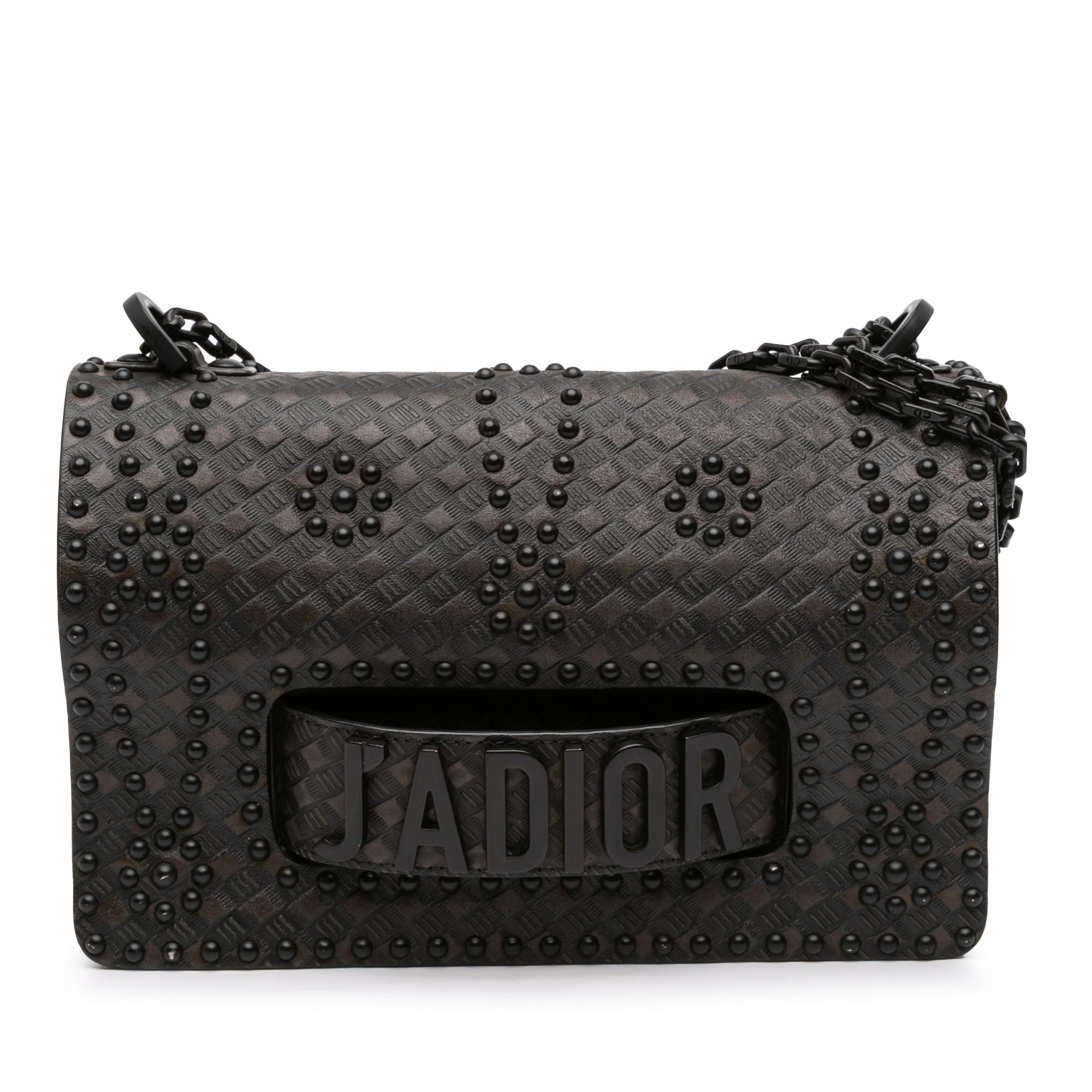 The J'adior Chain Flap bag features a studded leather body, chain link straps, a front flap with a magnetic snap button closure, and interior slip pockets. Retail Price: 3800.00