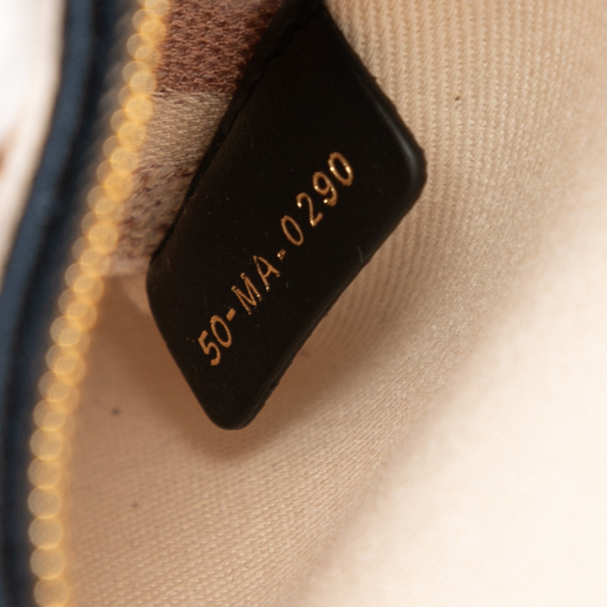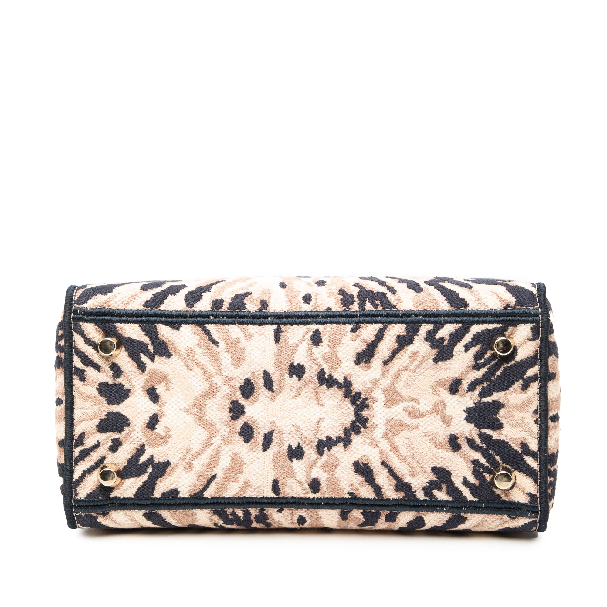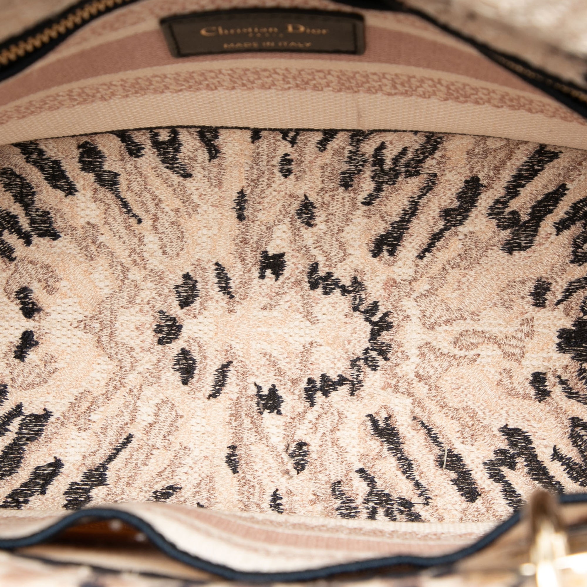 The Lady D-Lite features an embroidered canvas body, flat handles, a detachable flat shoulder strap, a fold-in flap closure, and interior zip and slip pockets. Retail Price: 5300.00