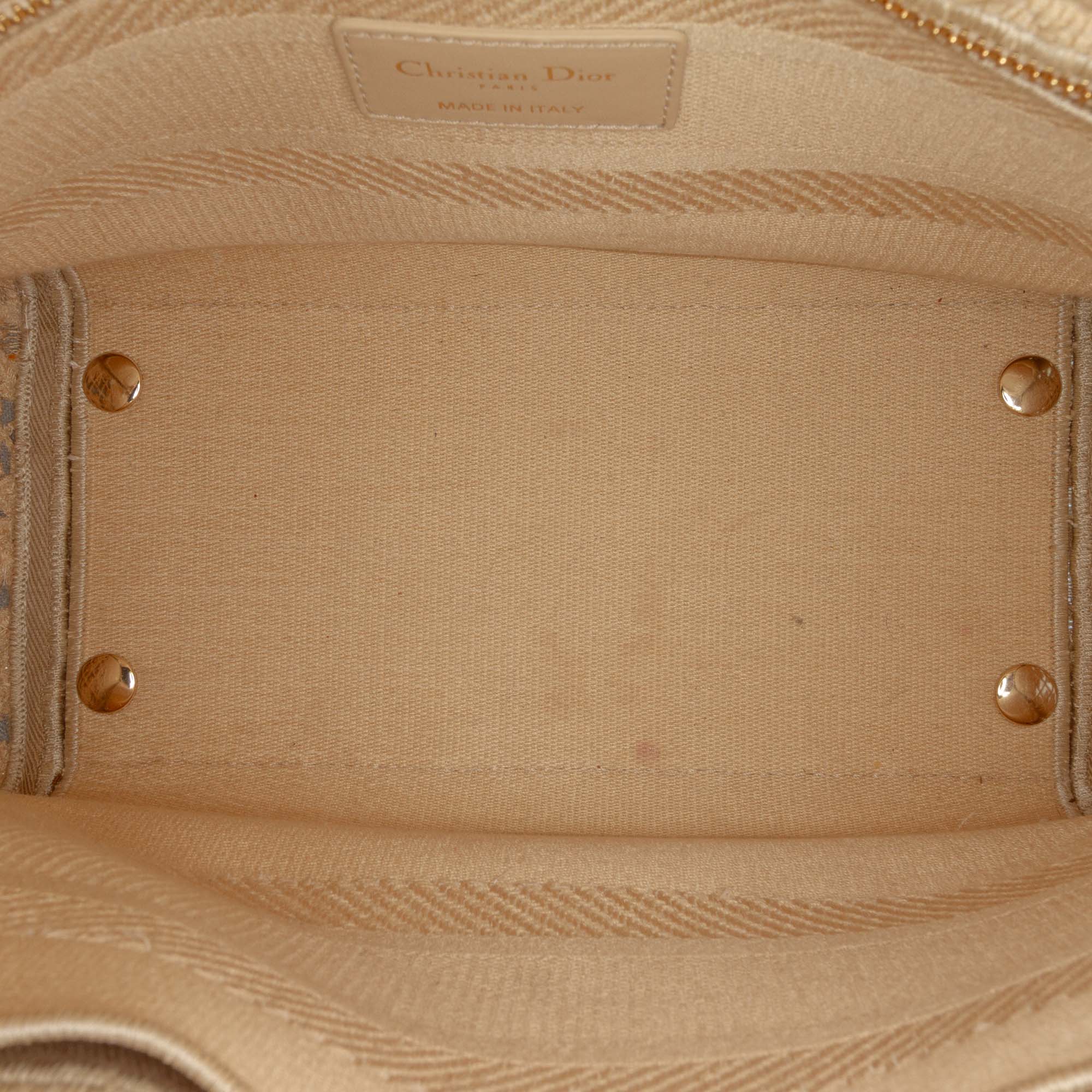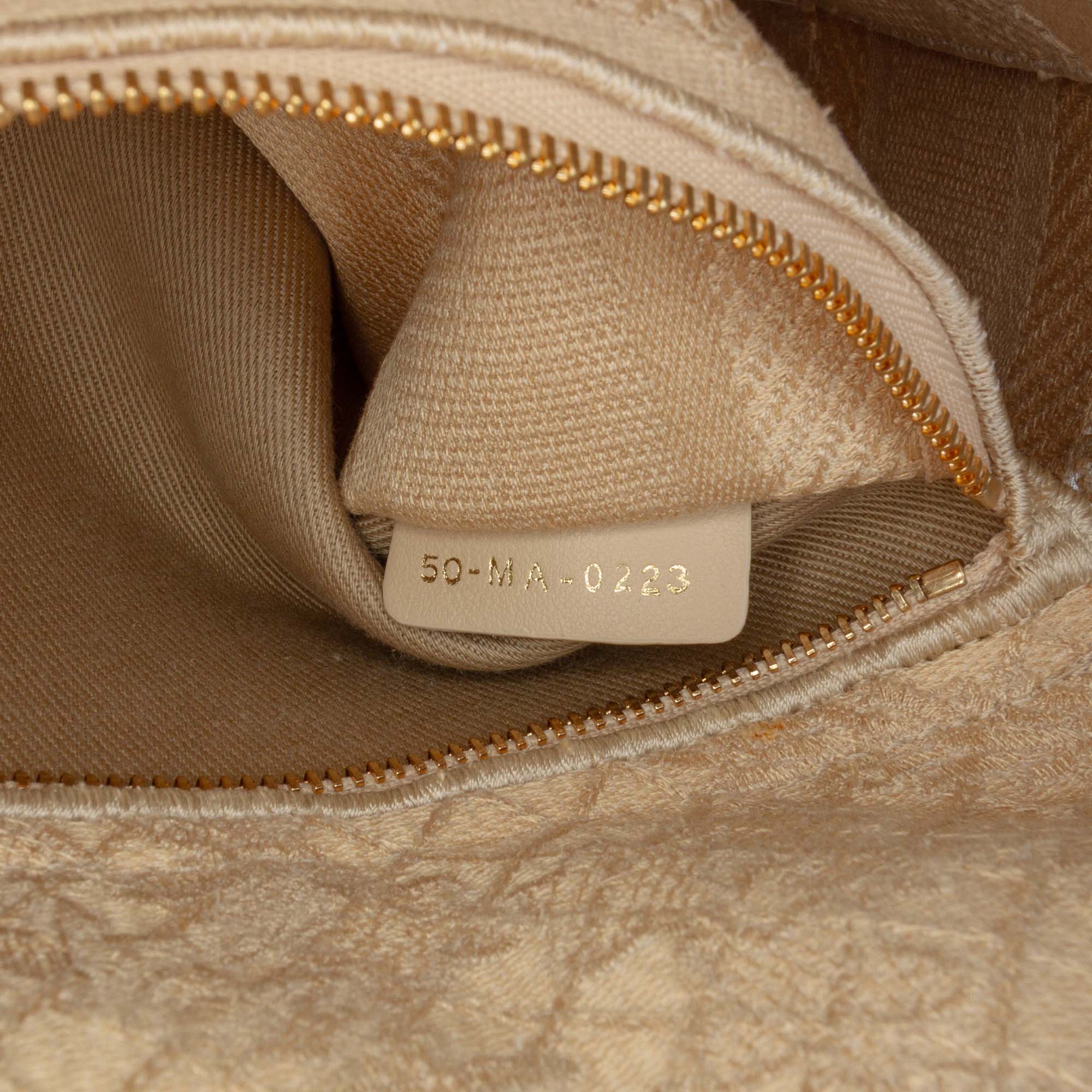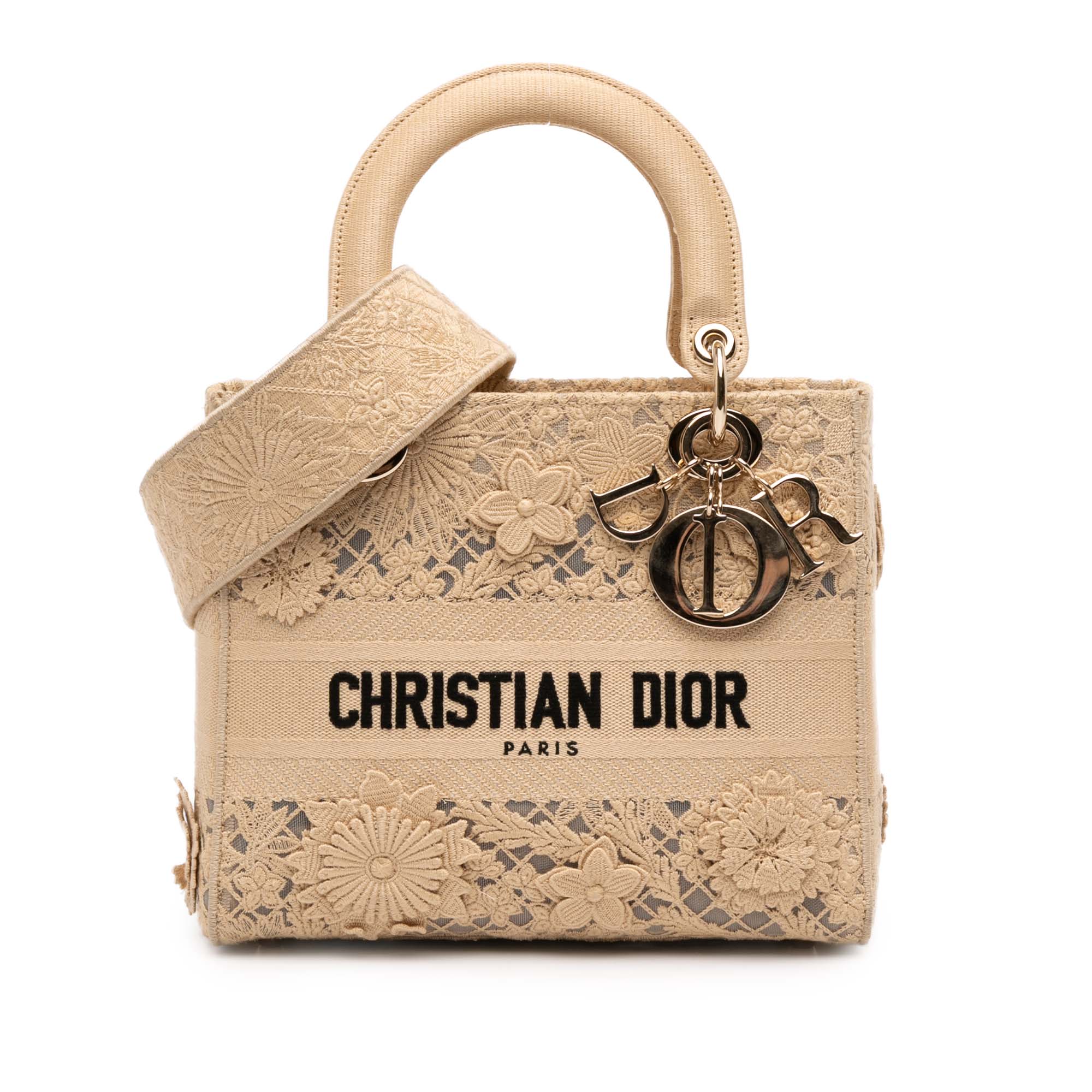 The Lady D-Lite features an embroidered lace body, structured top handles, a detachable flat strap, a top fold in flap closure, and interior zip and slip pockets. Inclusion: Dust bag, authenticity card. Retail Price: 5000.00