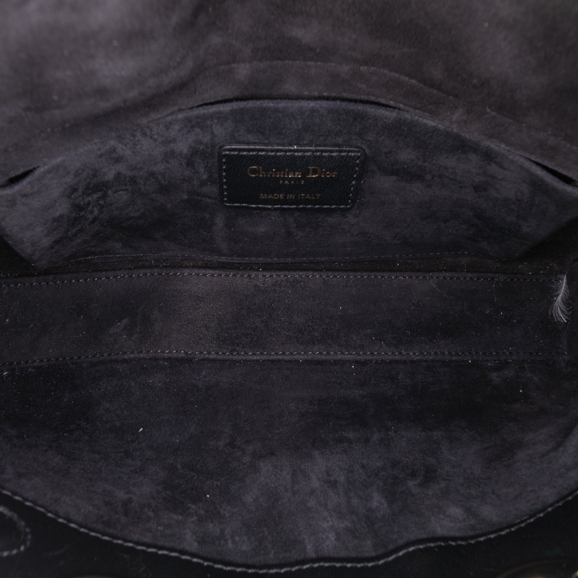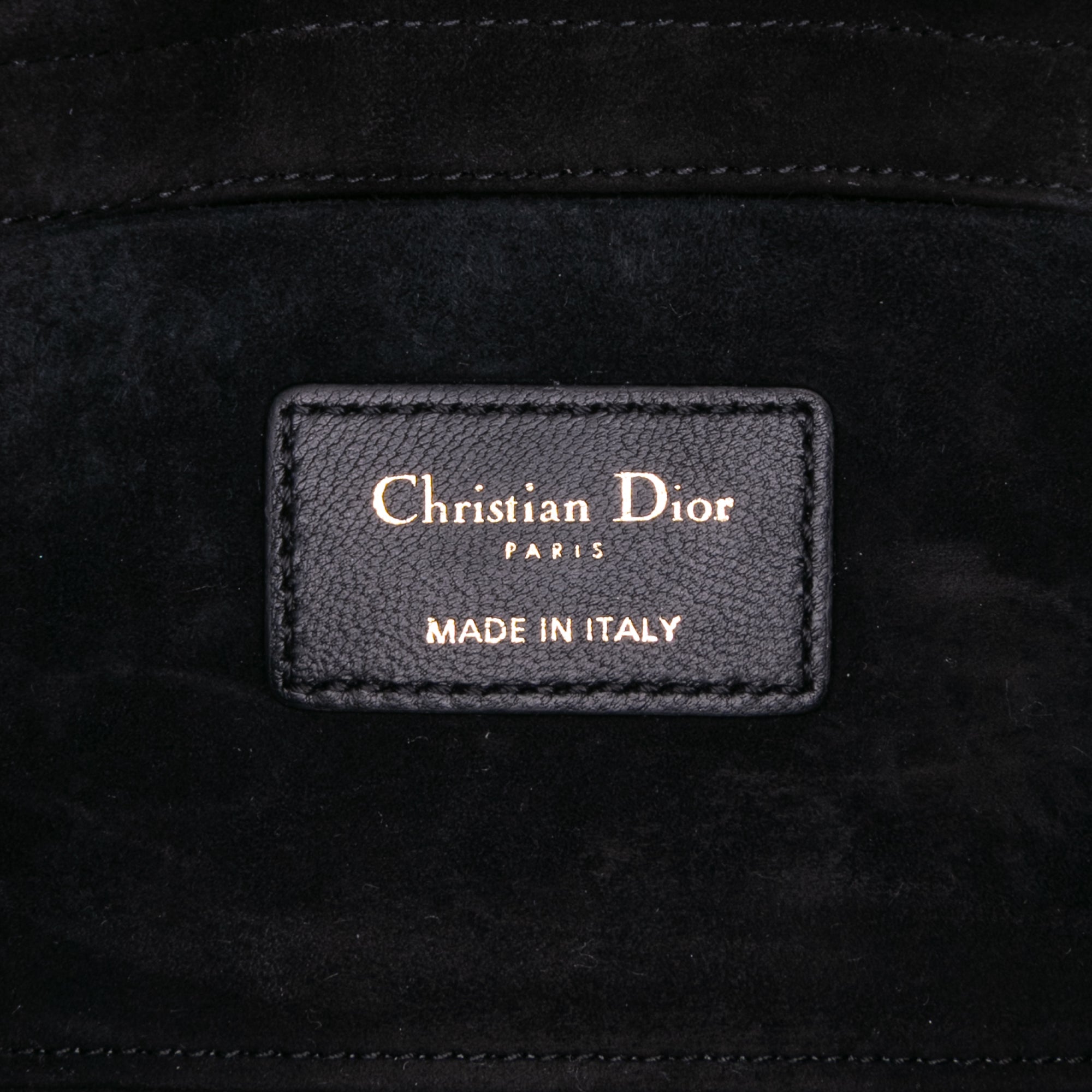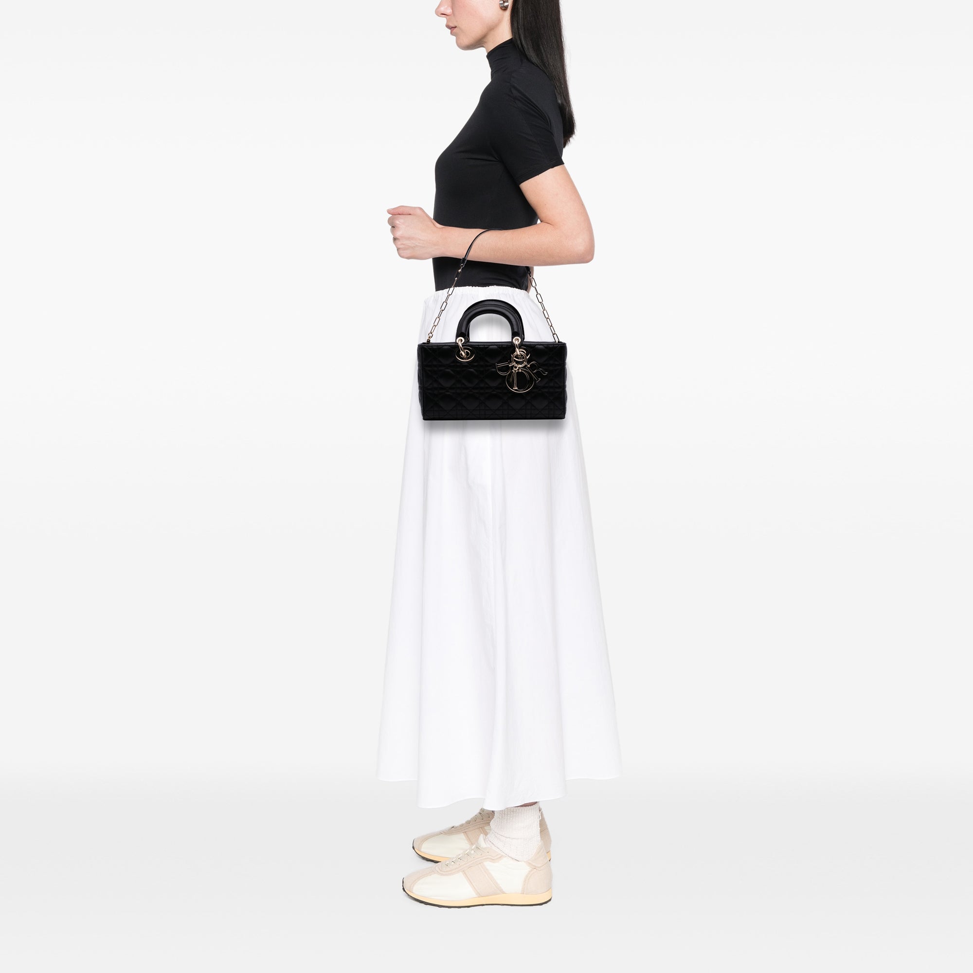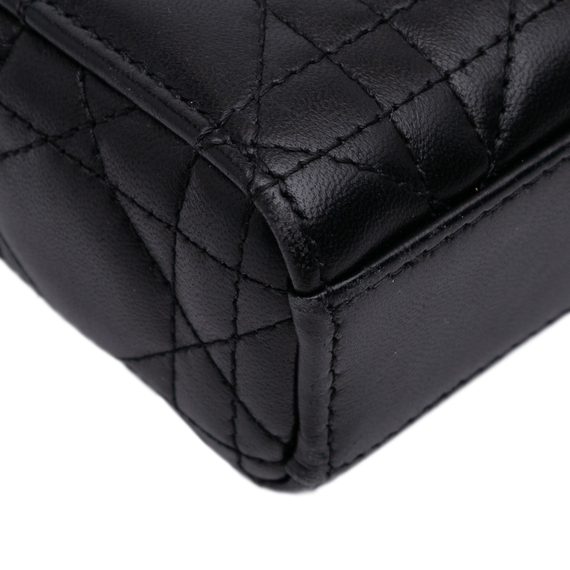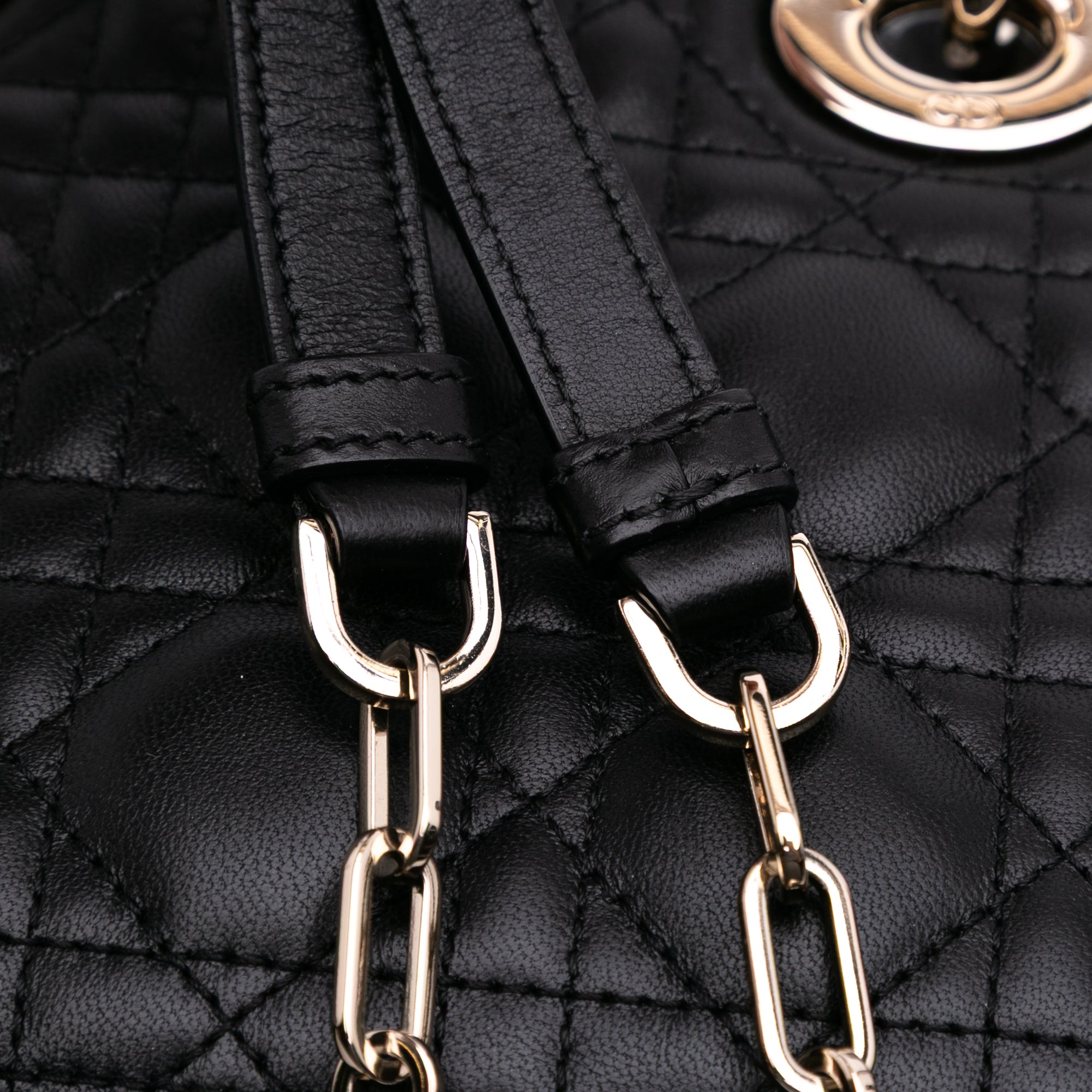 The Lady D-Joy features a quilted lambskin leather body, flat leather top handles, a detachable chain and leather strap, a top flap closure, and an interior slip pocket. Inclusion: authenticity card. Retail Price: 5600.00