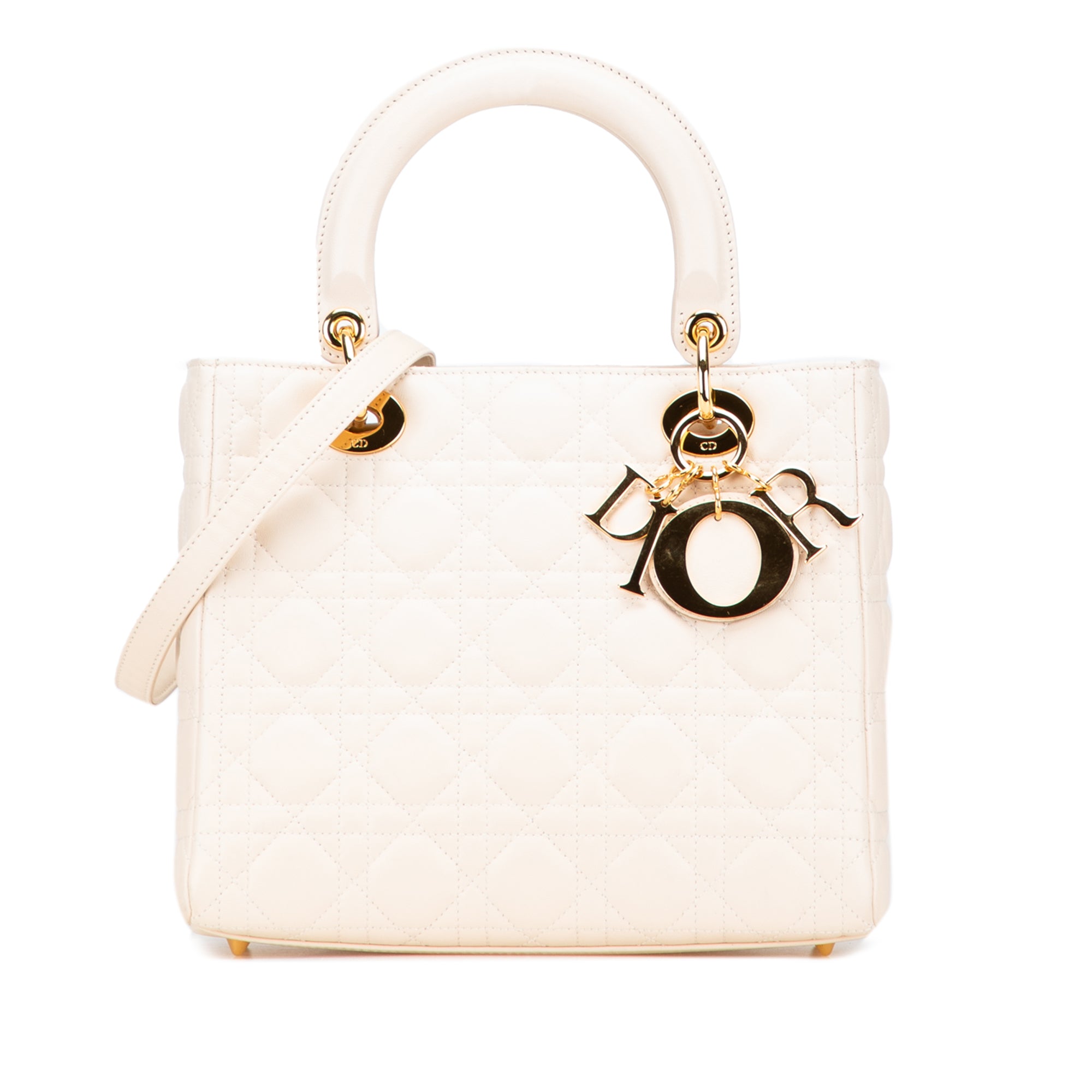 The Lady Dior features a quilted leather body, flat top handles, a detachable flat leather strap, a top zip closure, and an interior zip pocket. Inclusion: Dust bag. Retail Price: 3780.00