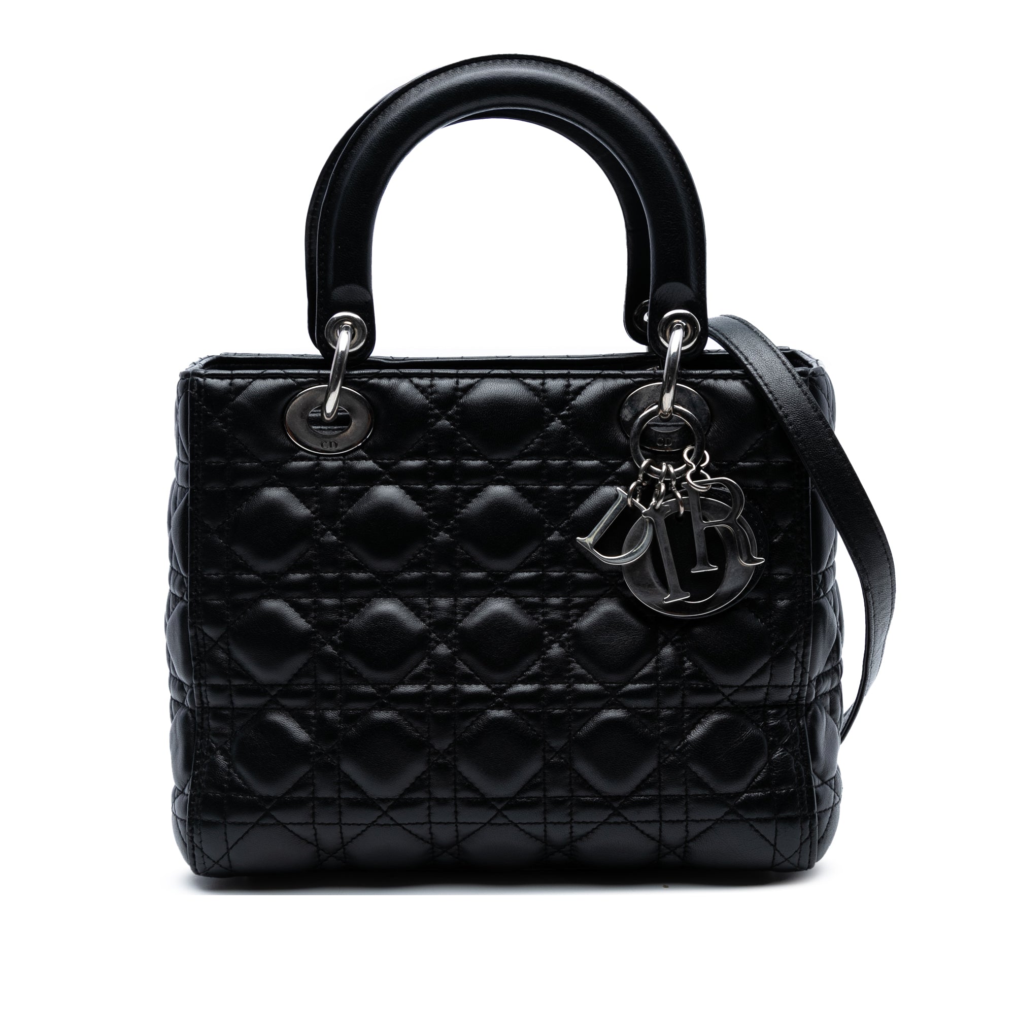 The Lady Dior features a quilted lambskin leather body, flat leather top handles, a detachable strap, a top zip closure, and an interior zip pocket. Retail Price: 6066.00