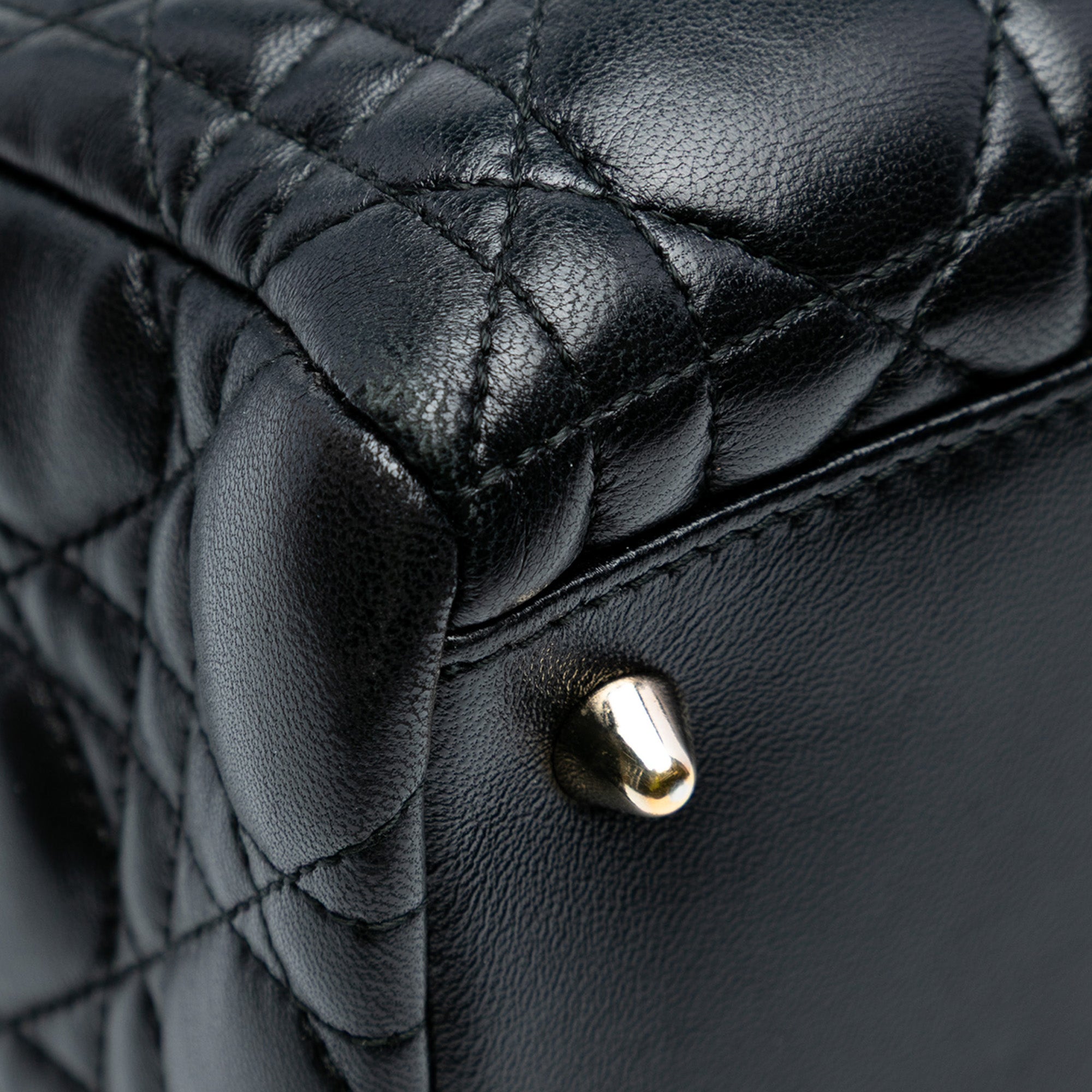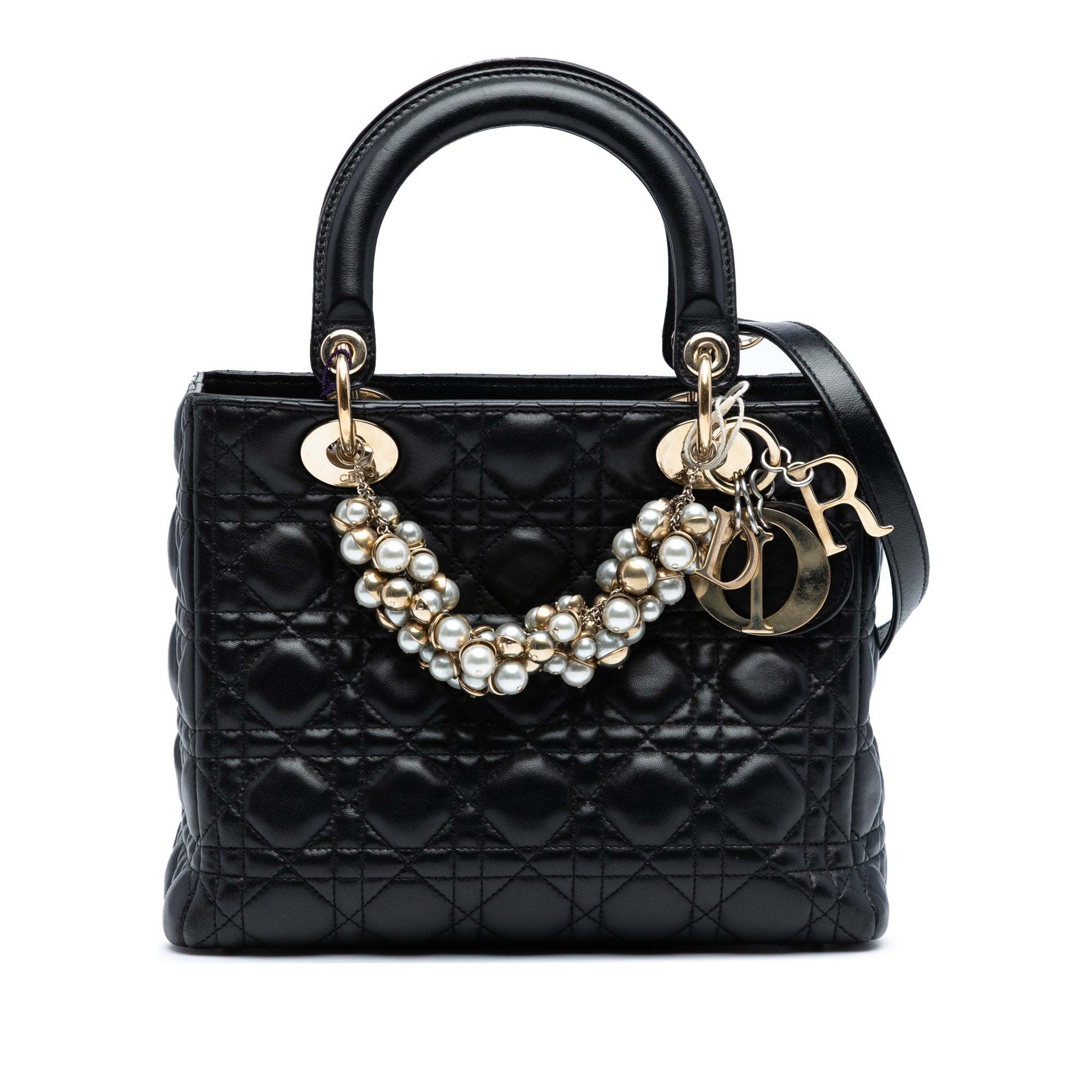 The Lady Dior features a quilted lambskin leather body with pearl embellishment, a flat leather top handles, a detachable flat leather shoulder strap, a top zip closure, and an interior zip pocket. Retail Price: 4100.00