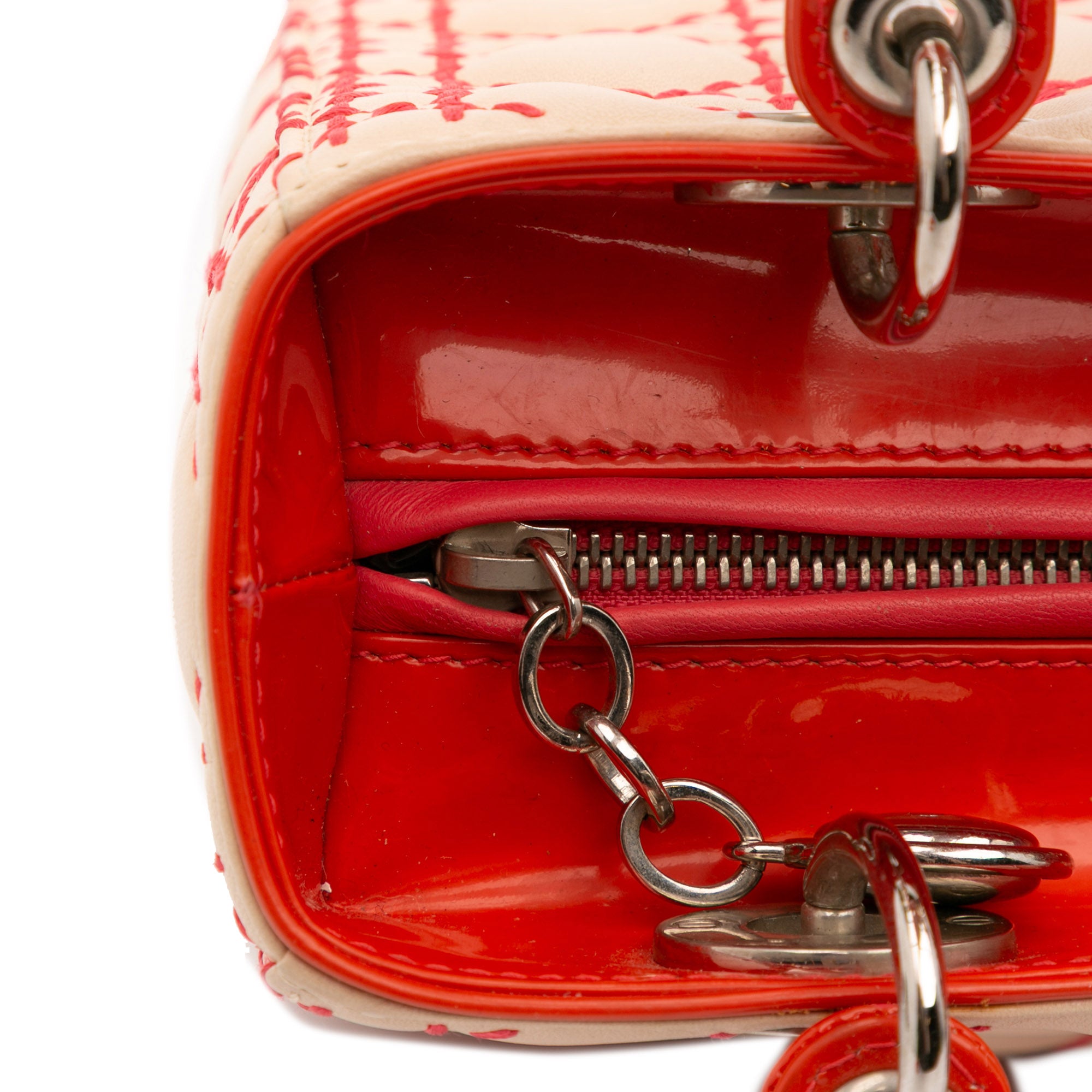 The Lady Dior features a stitched lambskin leather body, flat leather top handles, a detachable flat strap, a top zip closure, and an interior zip pocket. Retail Price: 6150.00
