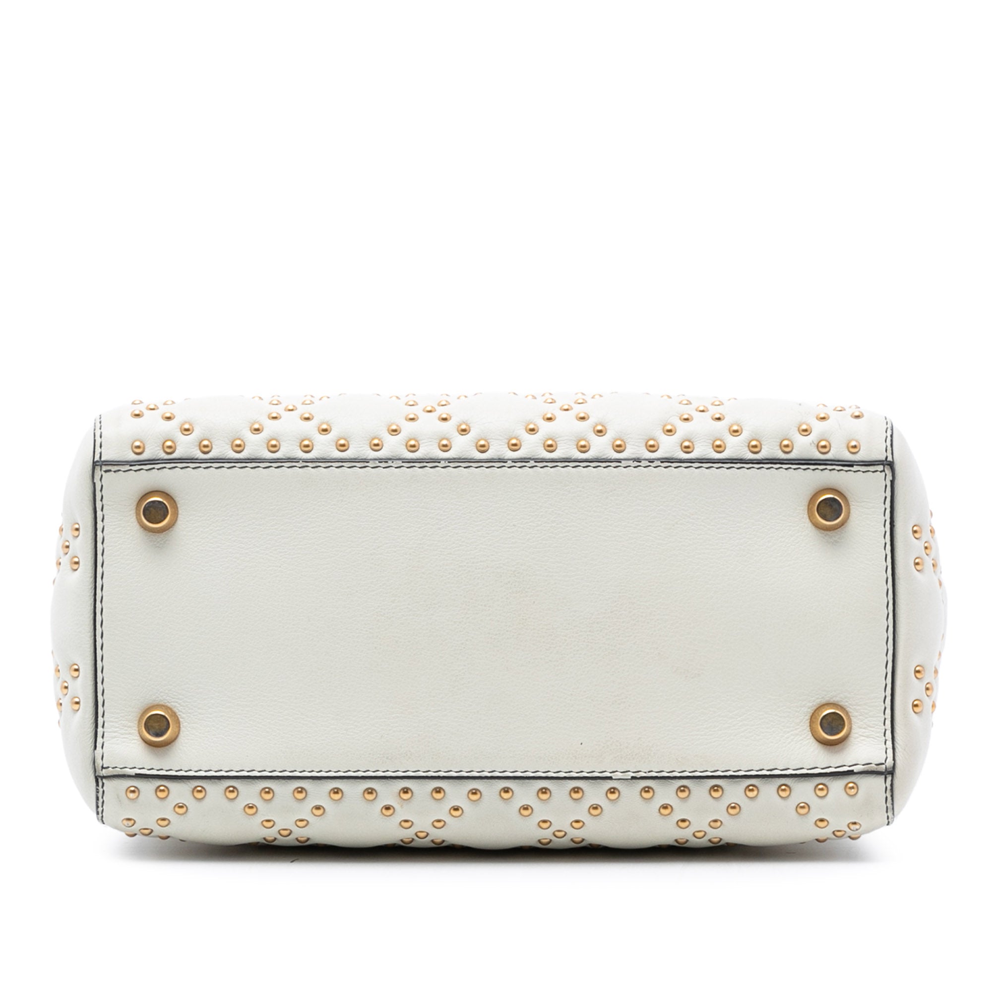 This satchel features a studded leather body, flat handles, a detachable flat strap, a fold-in flap closure, and an interior zip pocket. Inclusion: authenticity card. Retail Price: 5050.00