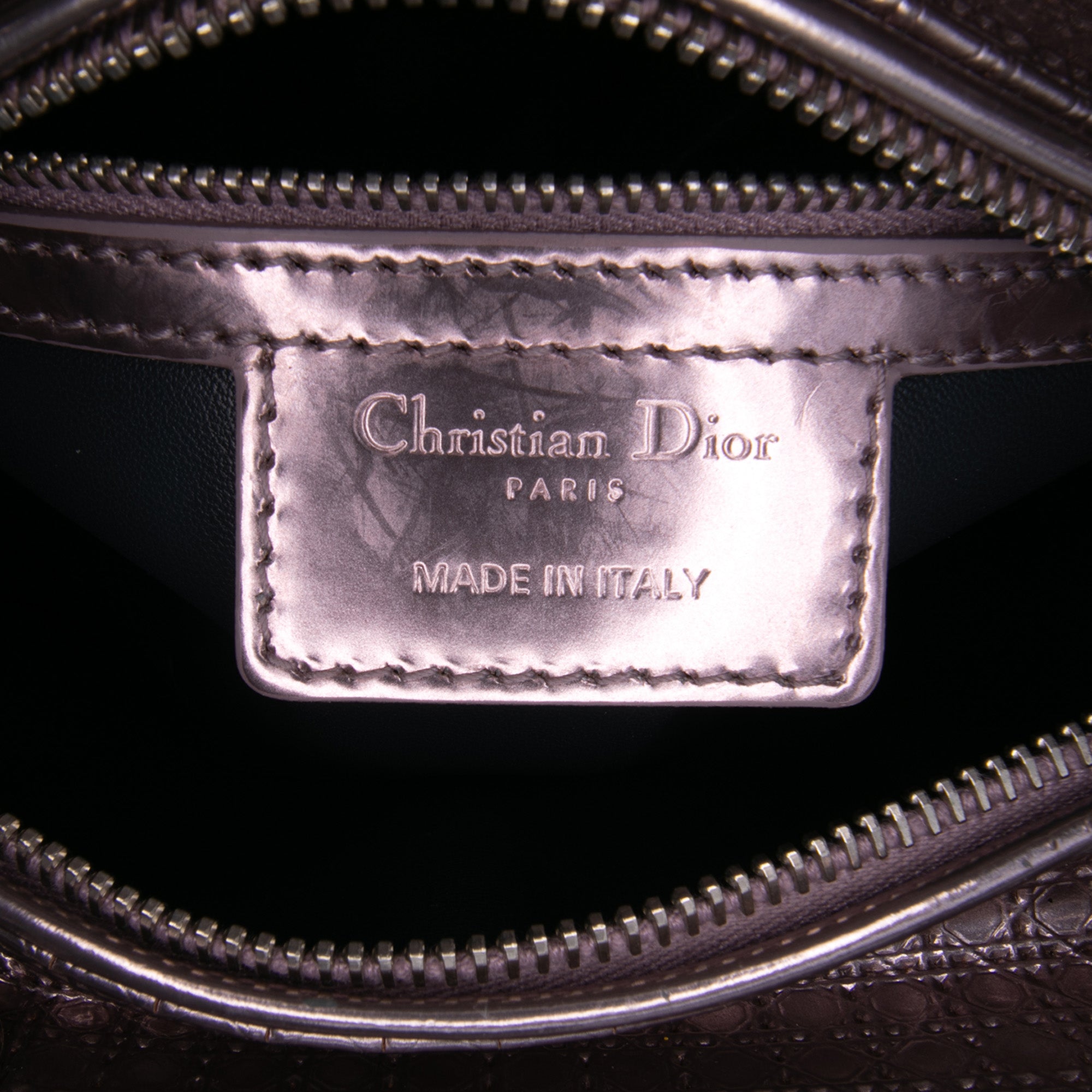 The Lady Dior features a quilted metallic patent leather body, flat leather handles, a detachable strap, a top zip closure, and an interior zip pocket. Inclusion: authenticity card. Retail Price: 6100.00