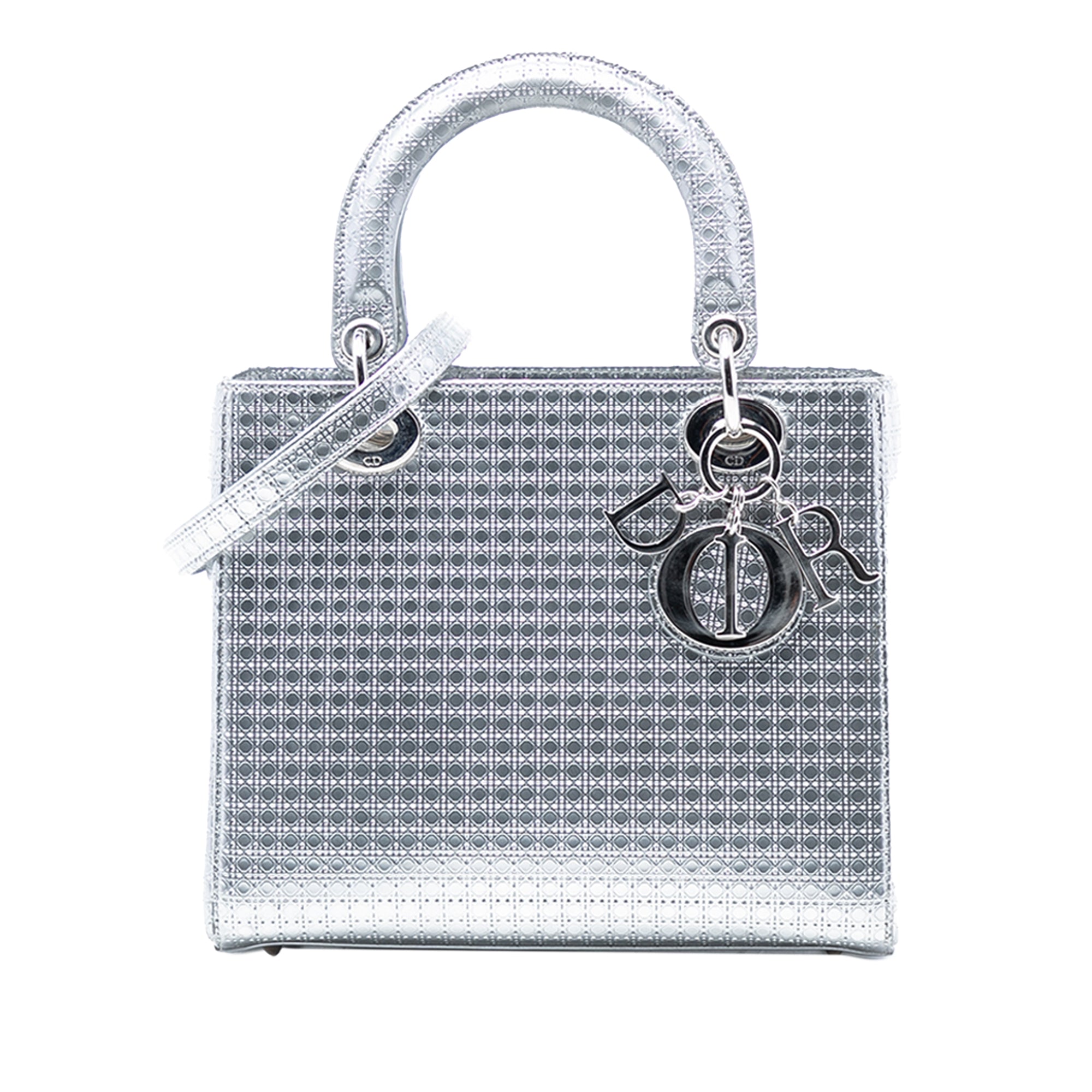 The Microcannage Medium Lady Dior features a quilted leather body, flat leather handles, a detachable strap, a top zip closure, and an interior zip pocket. Inclusion: authenticity card. Retail Price: 5775.00