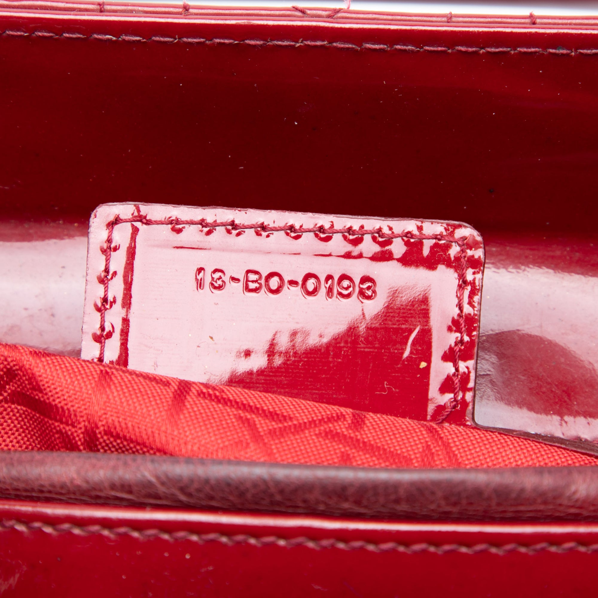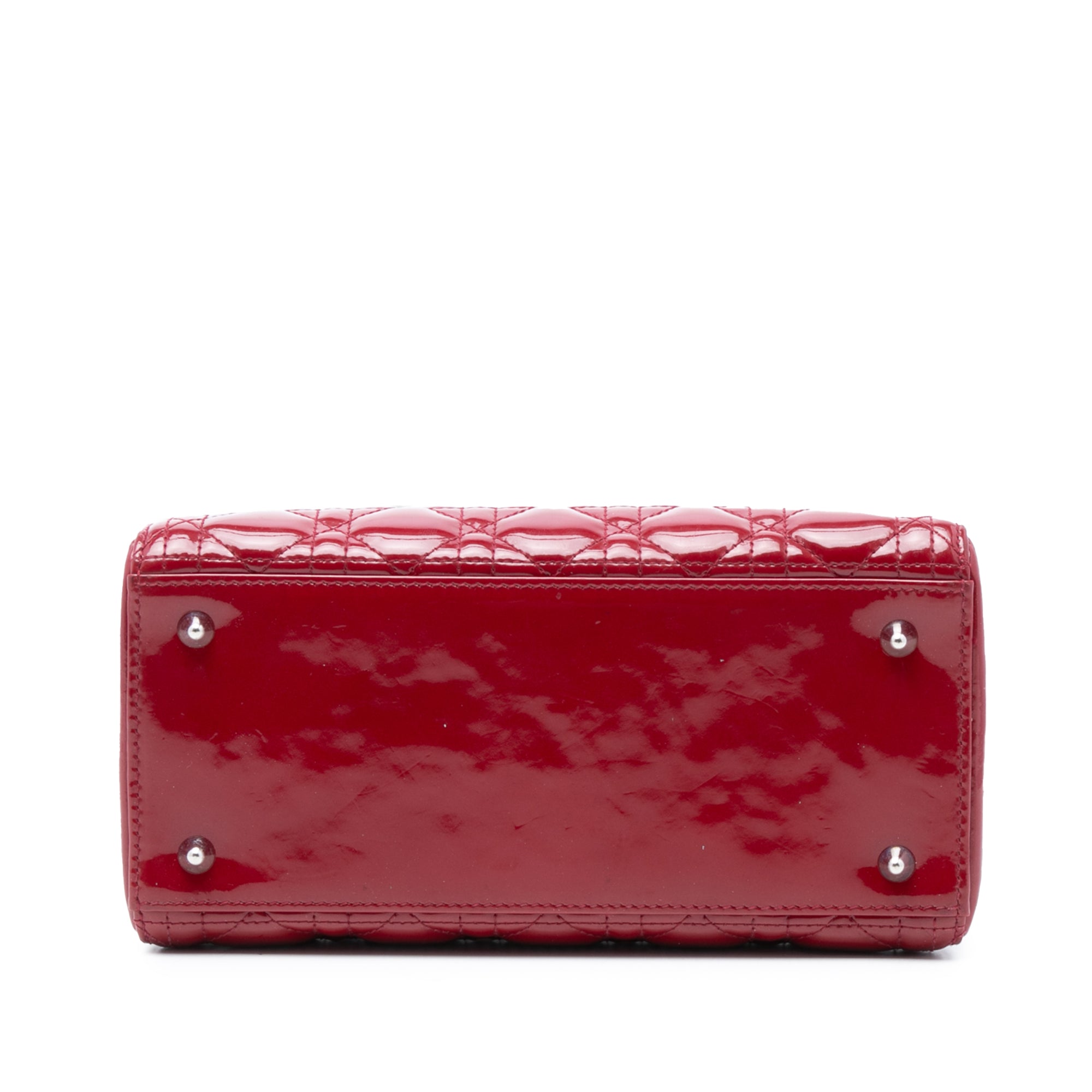 The Lady Dior features a quilted patent leather body, flat leather top handles, a detachable flat leather strap, a top zip closure, and an interior zip pocket. Retail Price: 5500.00