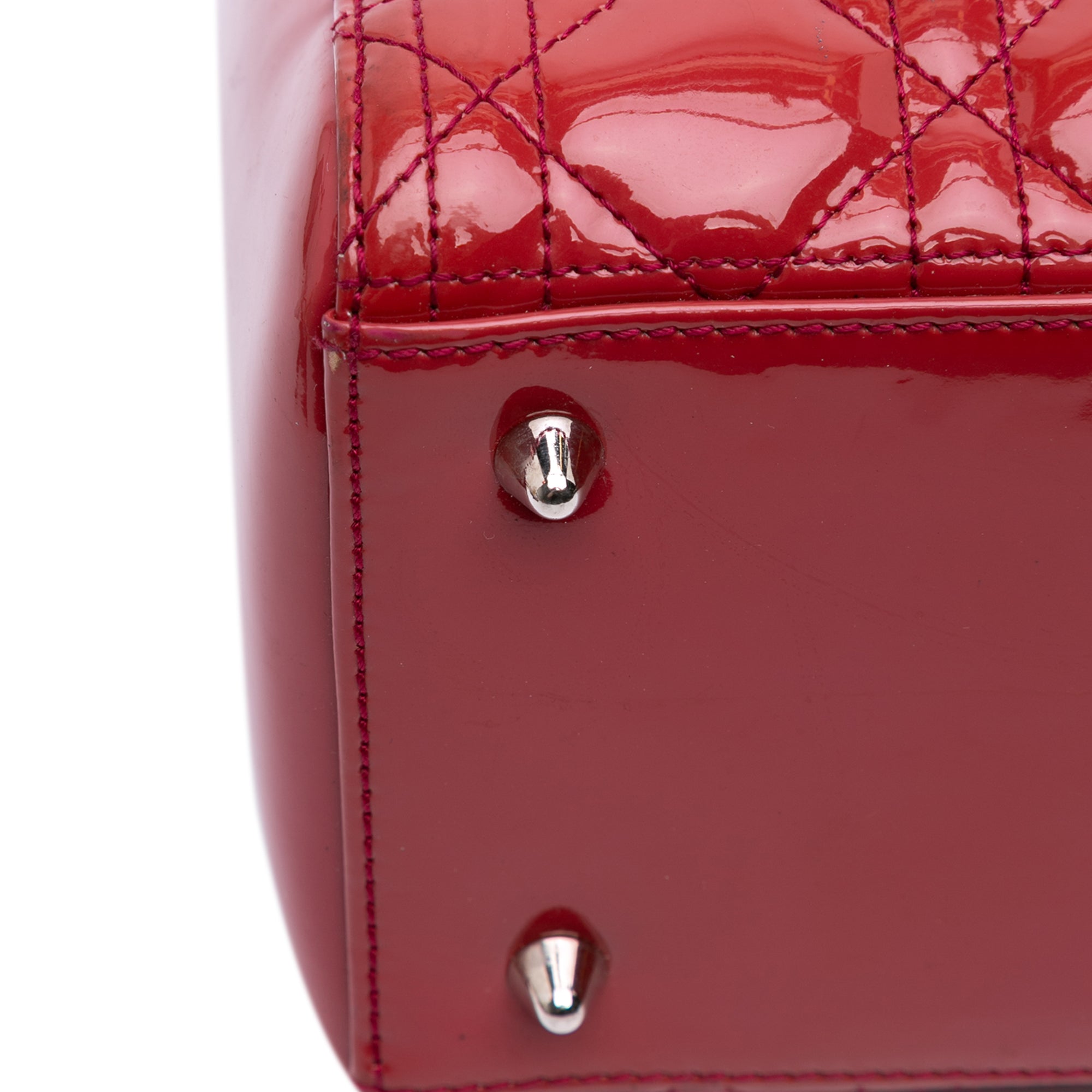 The Lady Dior features a patent leather body, flat leather top handles, a detachable flat leather strap, a top zip closure, and an interior zip pocket. Inclusion: authenticity card. Retail Price: 5500.00