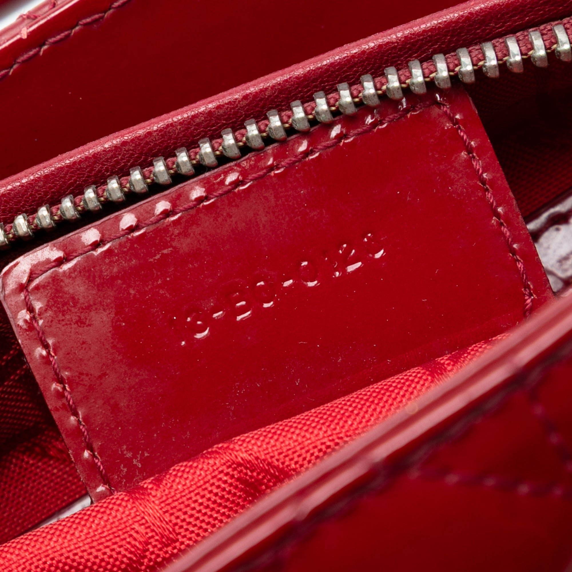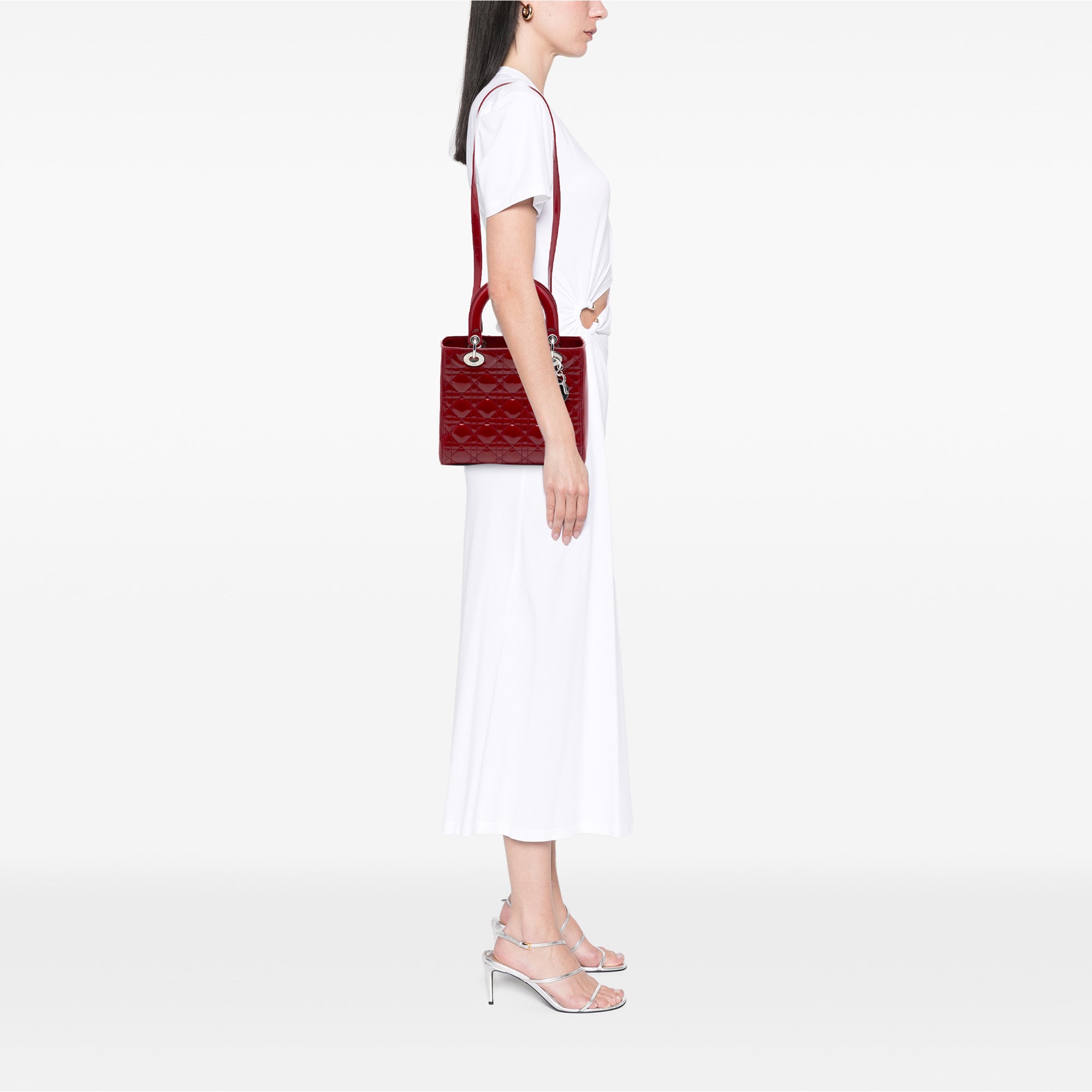 The Lady Dior features a quilted patent leather body, flat leather top handles, a detachable flat leather strap, a top zip closure, and an interior zip pocket. Retail Price: 5360.00