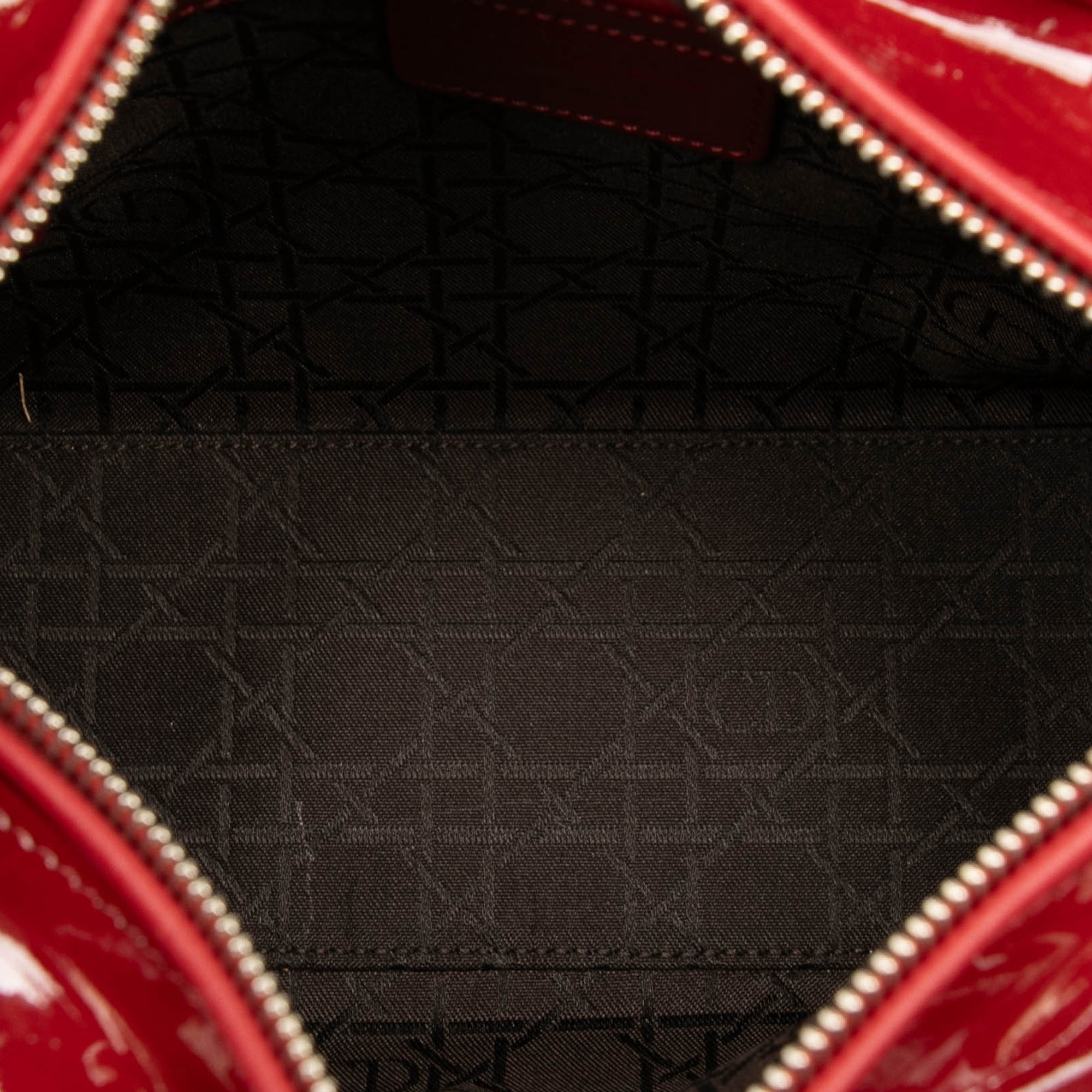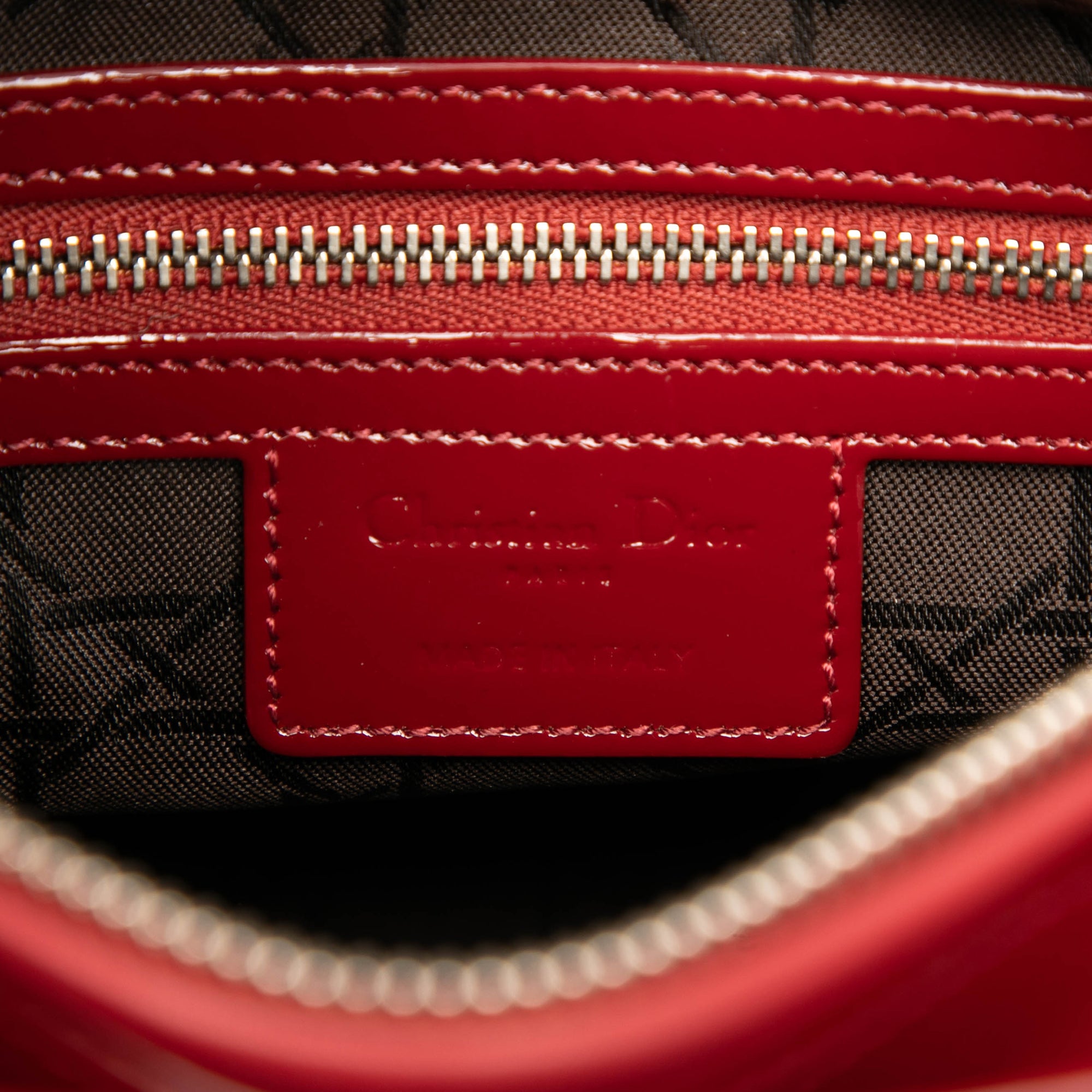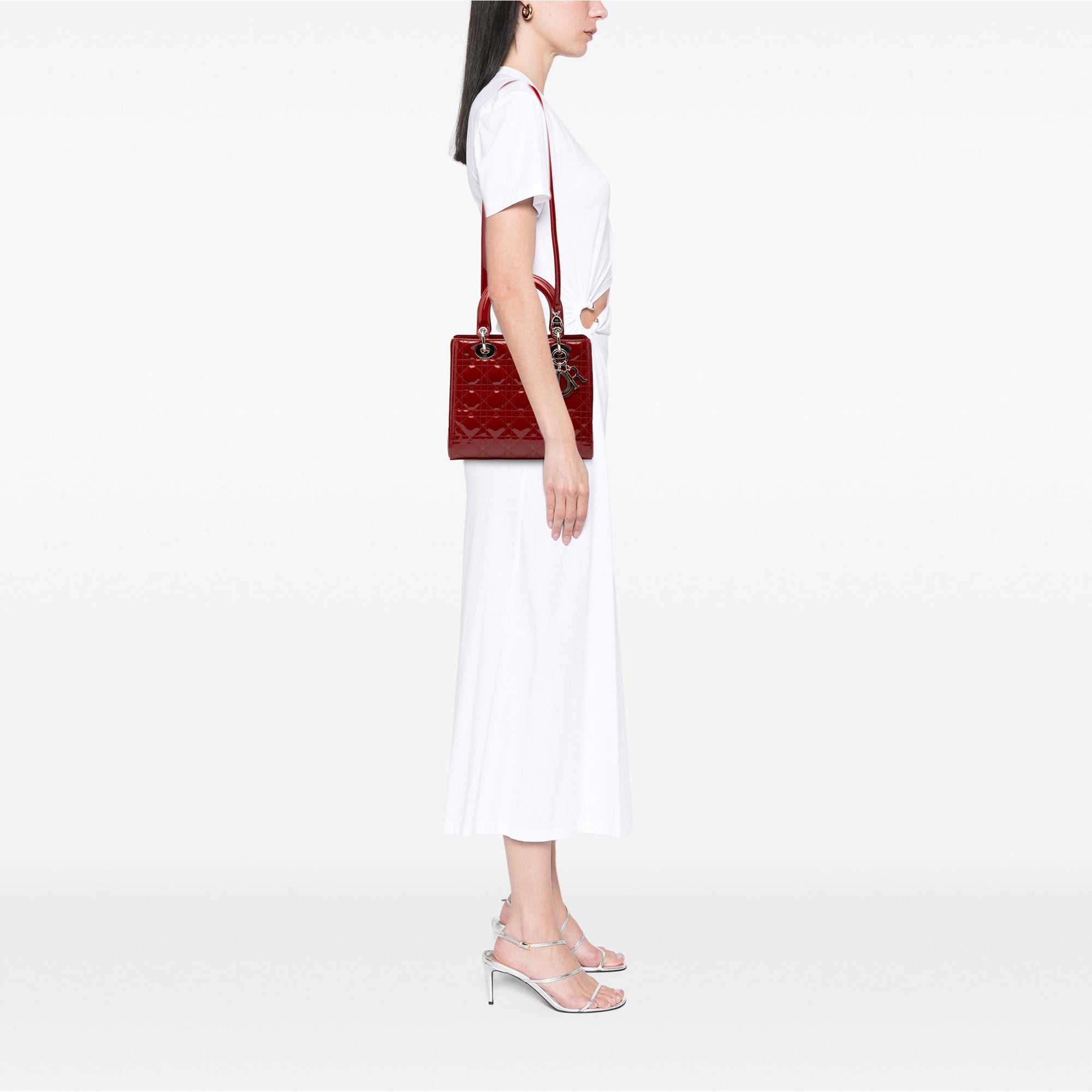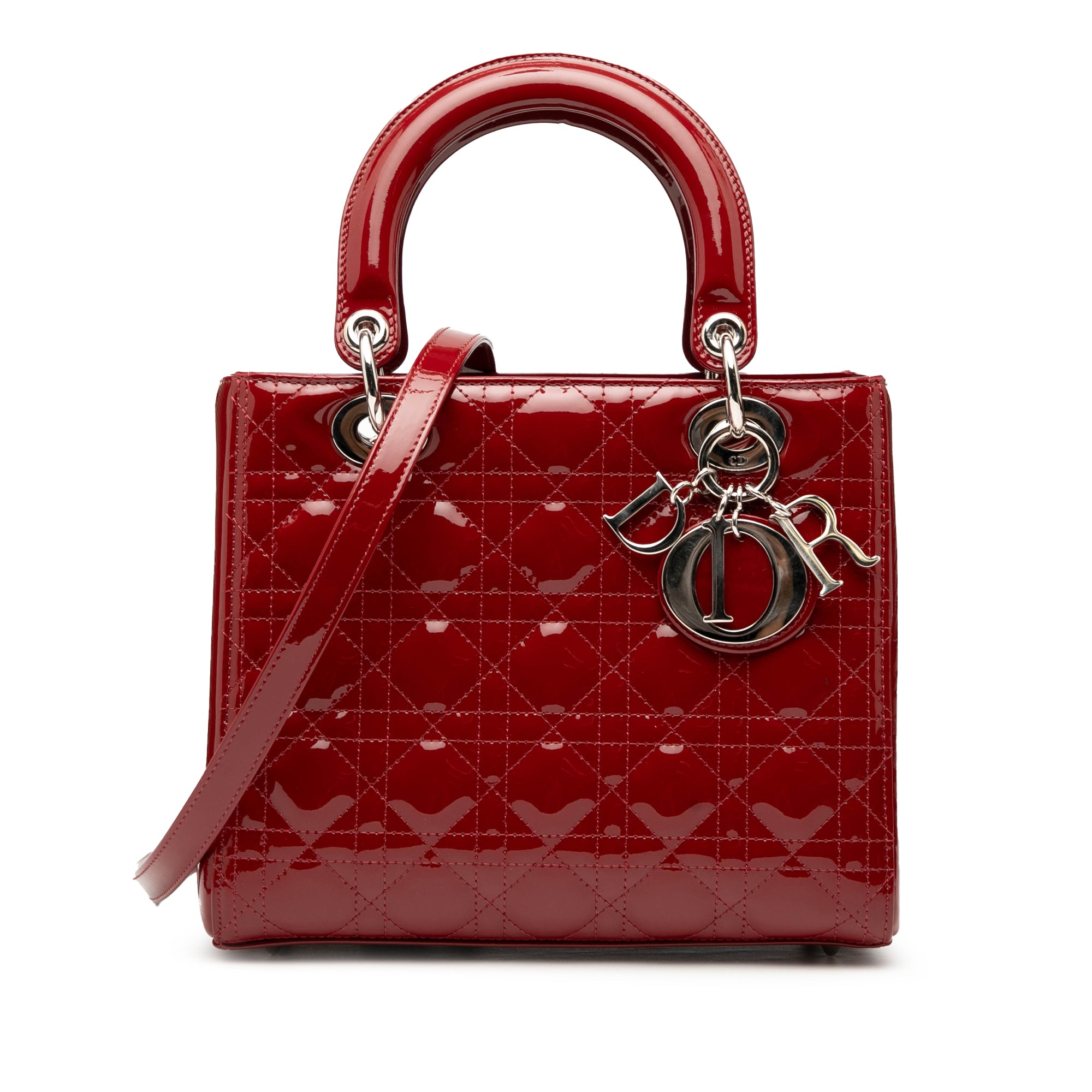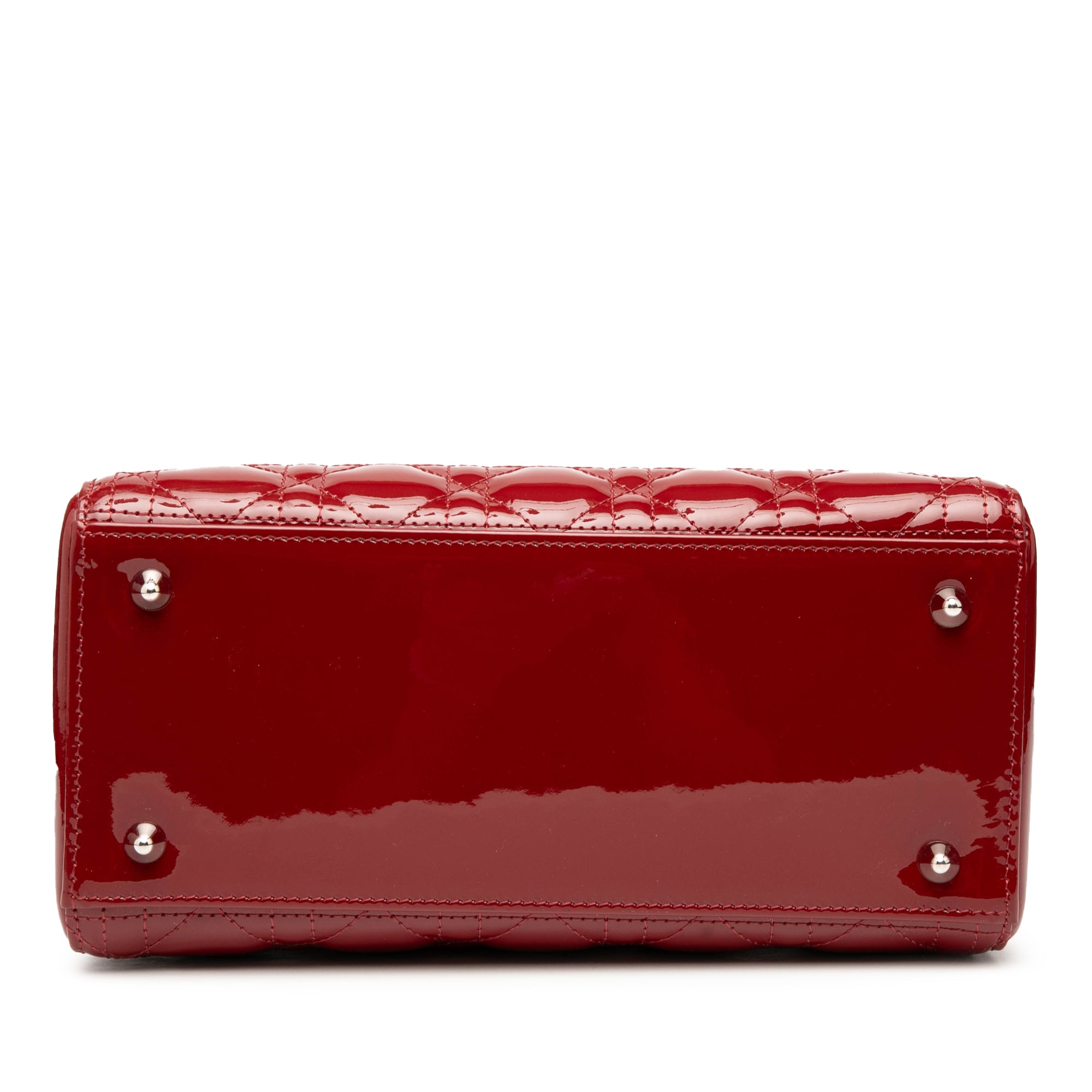 The Lady Dior features a quilted patent leather body, flat leather top handles, a detachable flat leather strap, a top zip closure, and an interior zip pocket. Retail Price: 5407.00