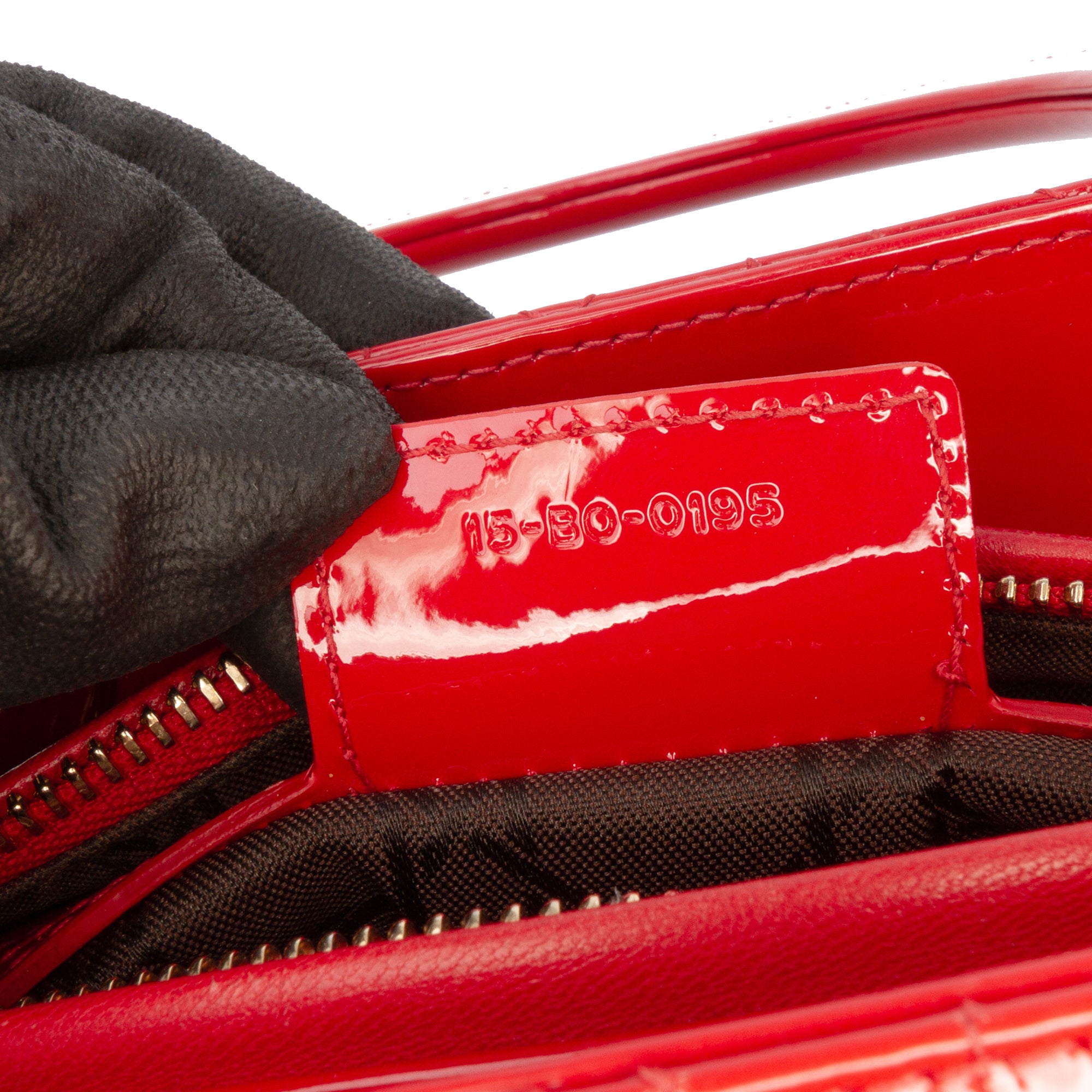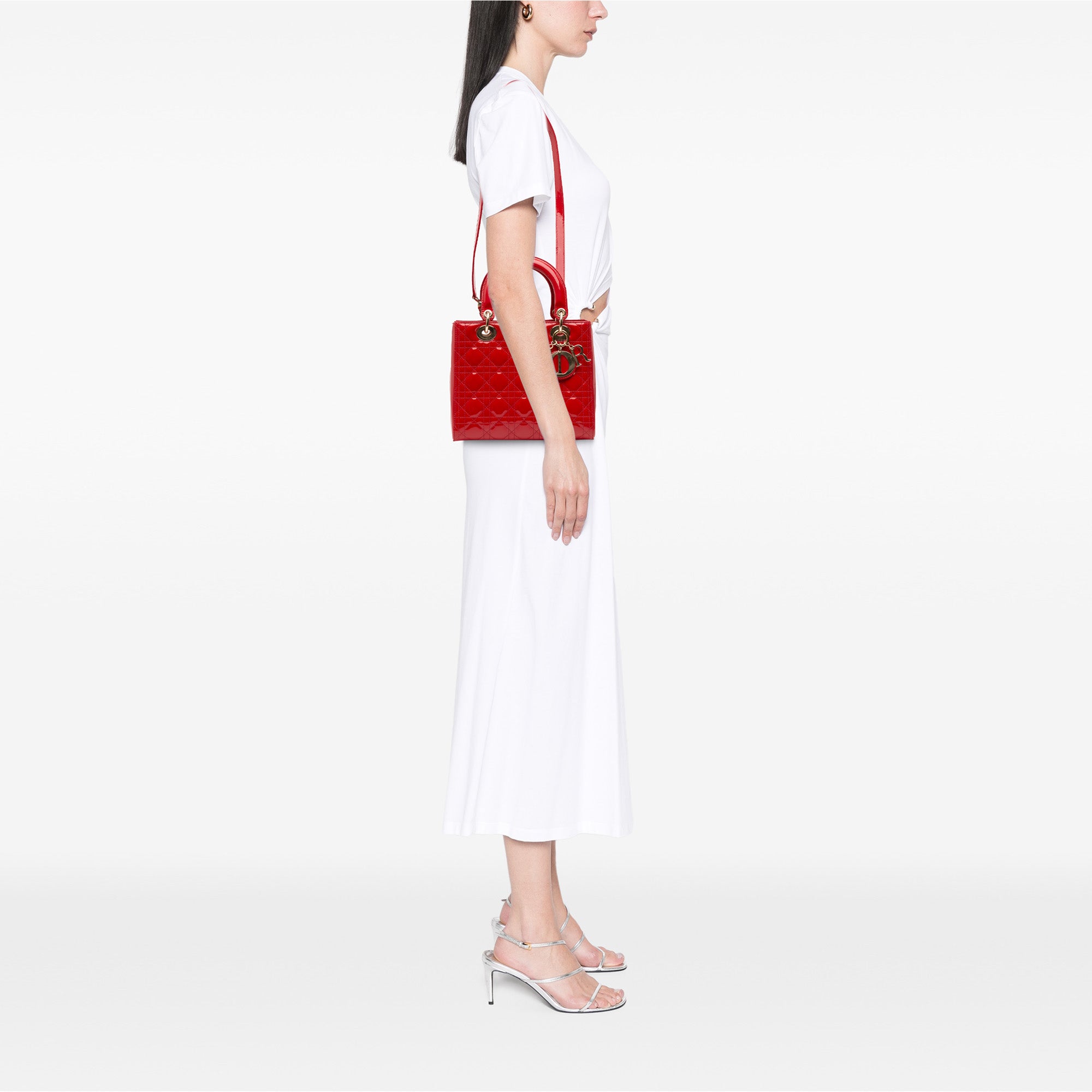 The Lady Dior features a patent leather body, flat leather top handles, a detachable flat leather strap, a top zip closure, and an interior zip pocket. Retail Price: 5500.00