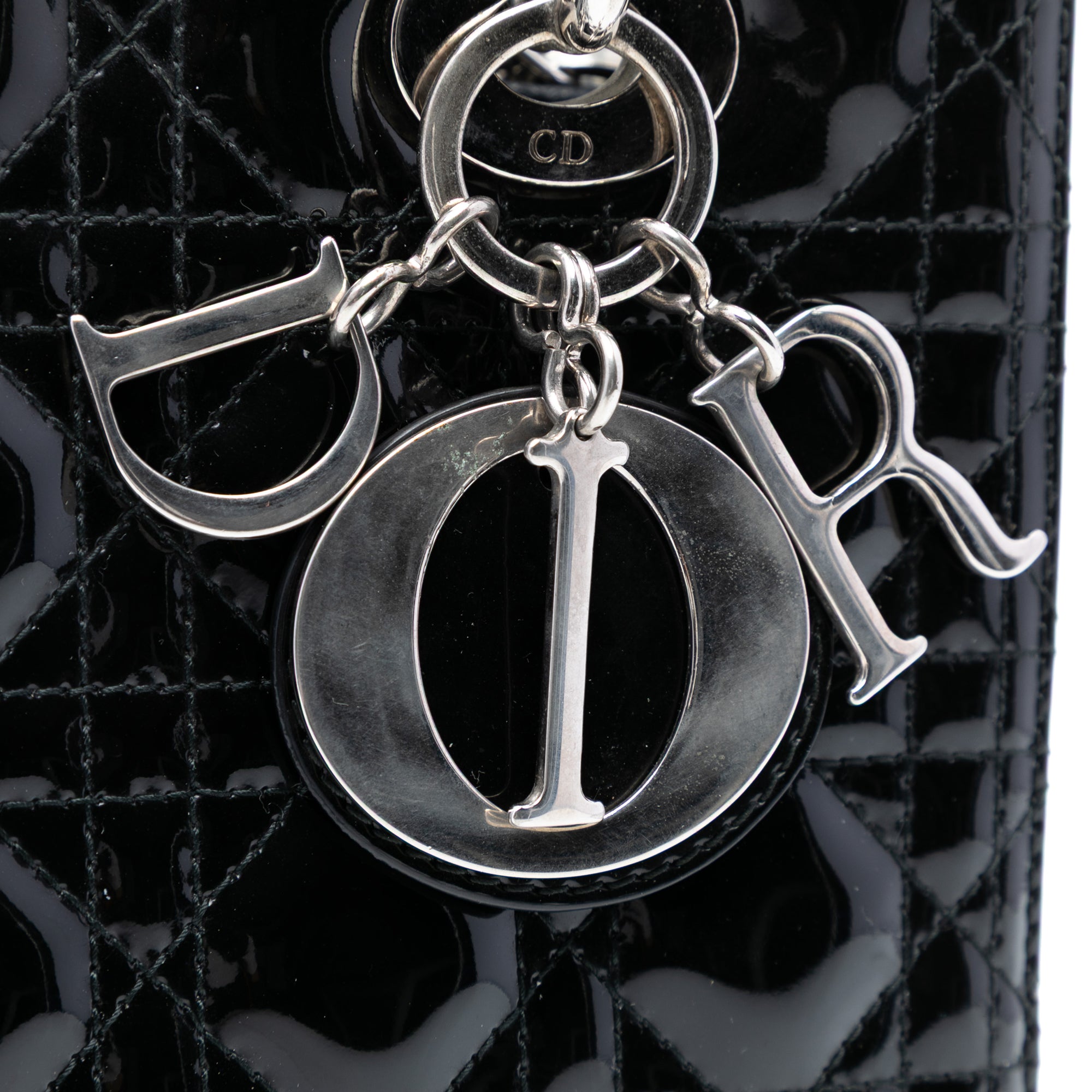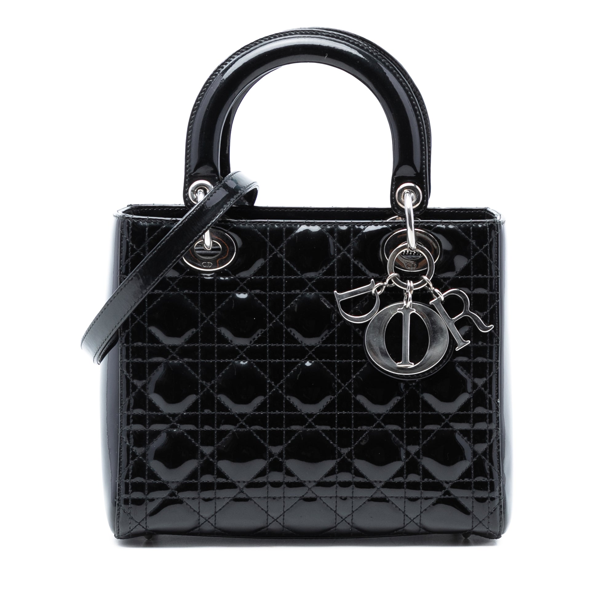 The Lady Dior features a quilted patent leather body, flat leather top handles, a detachable flat leather strap, a top zip closure, and an interior zip pocket. Retail Price: 6100.00