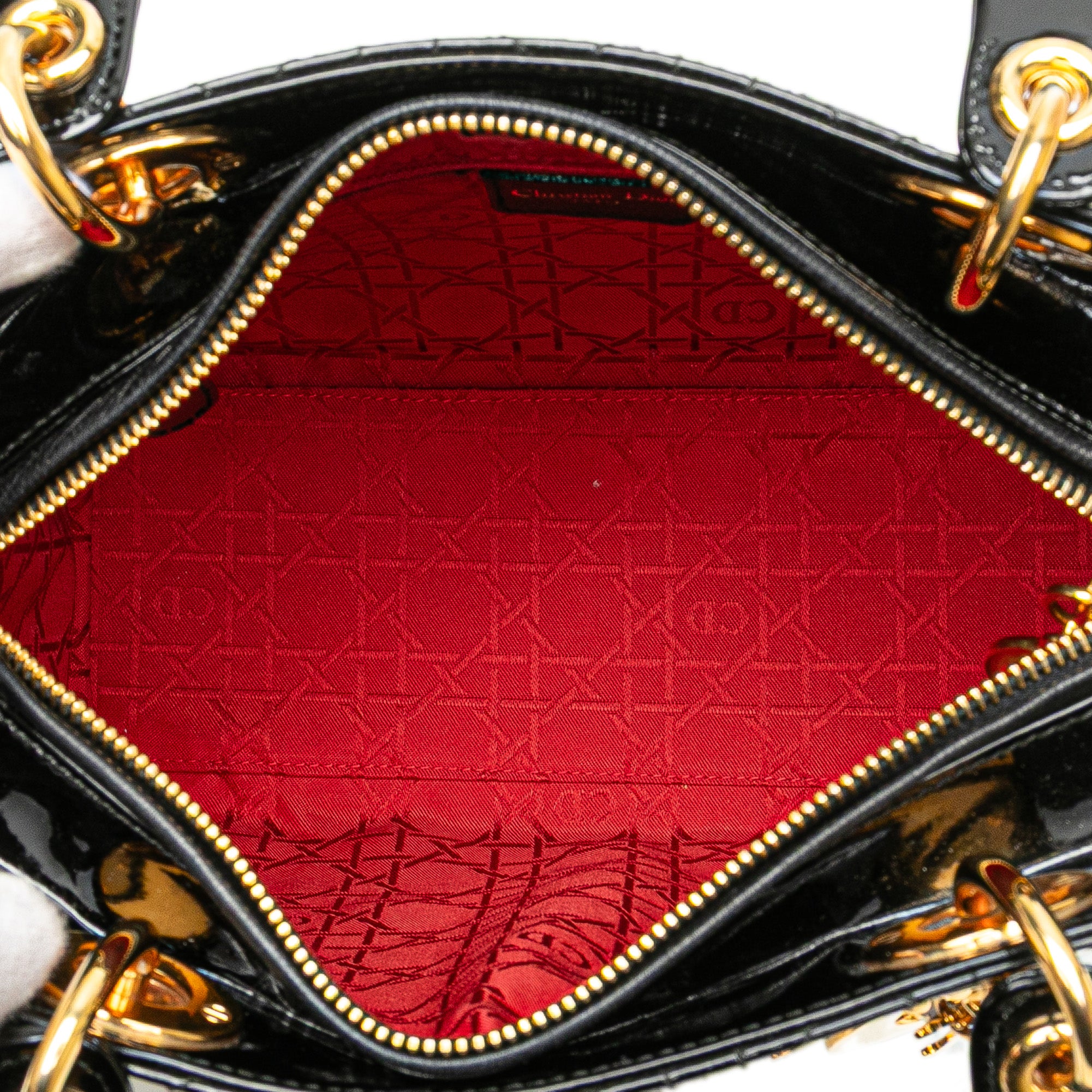 The Lady Dior features a quilted patent leather body, flat leather top handles, a detachable flat leather strap, a top zip closure, and an interior zip pocket. Inclusion: Dust bag. Retail Price: 6100.00