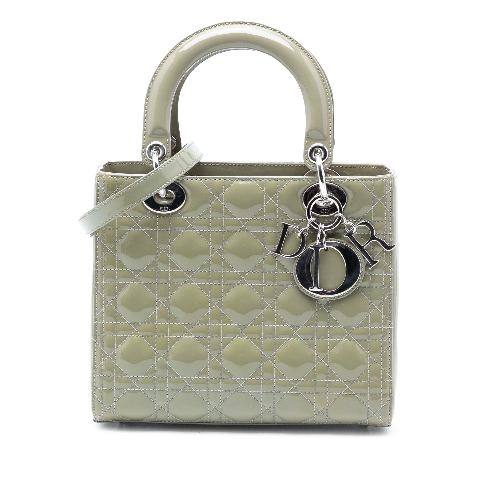 The Lady Dior features a quilted patent leather body, flat leather top handles, a detachable flat leather shoulder strap, a top zip closure, and an interior zip pocket. Retail Price: 3890.00
