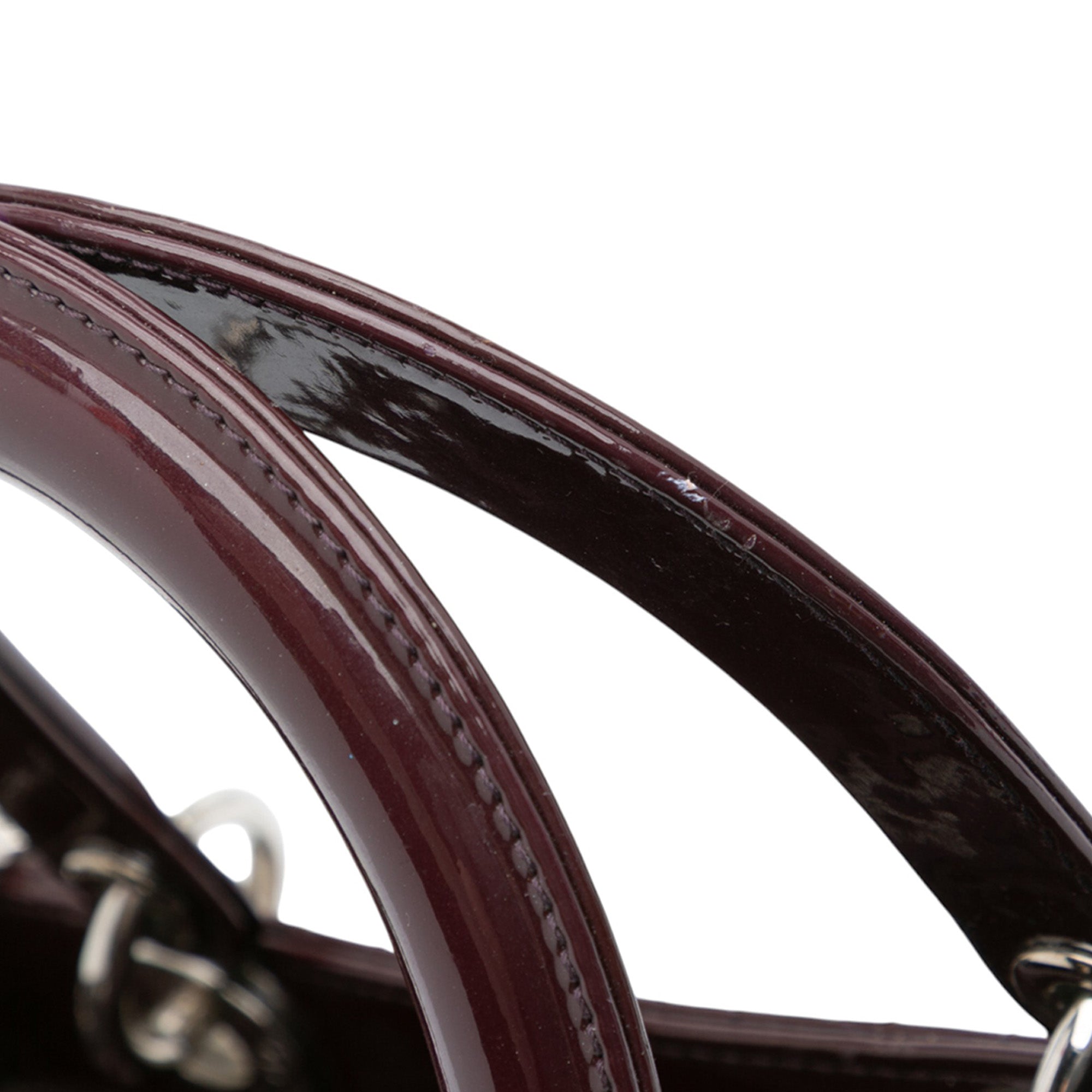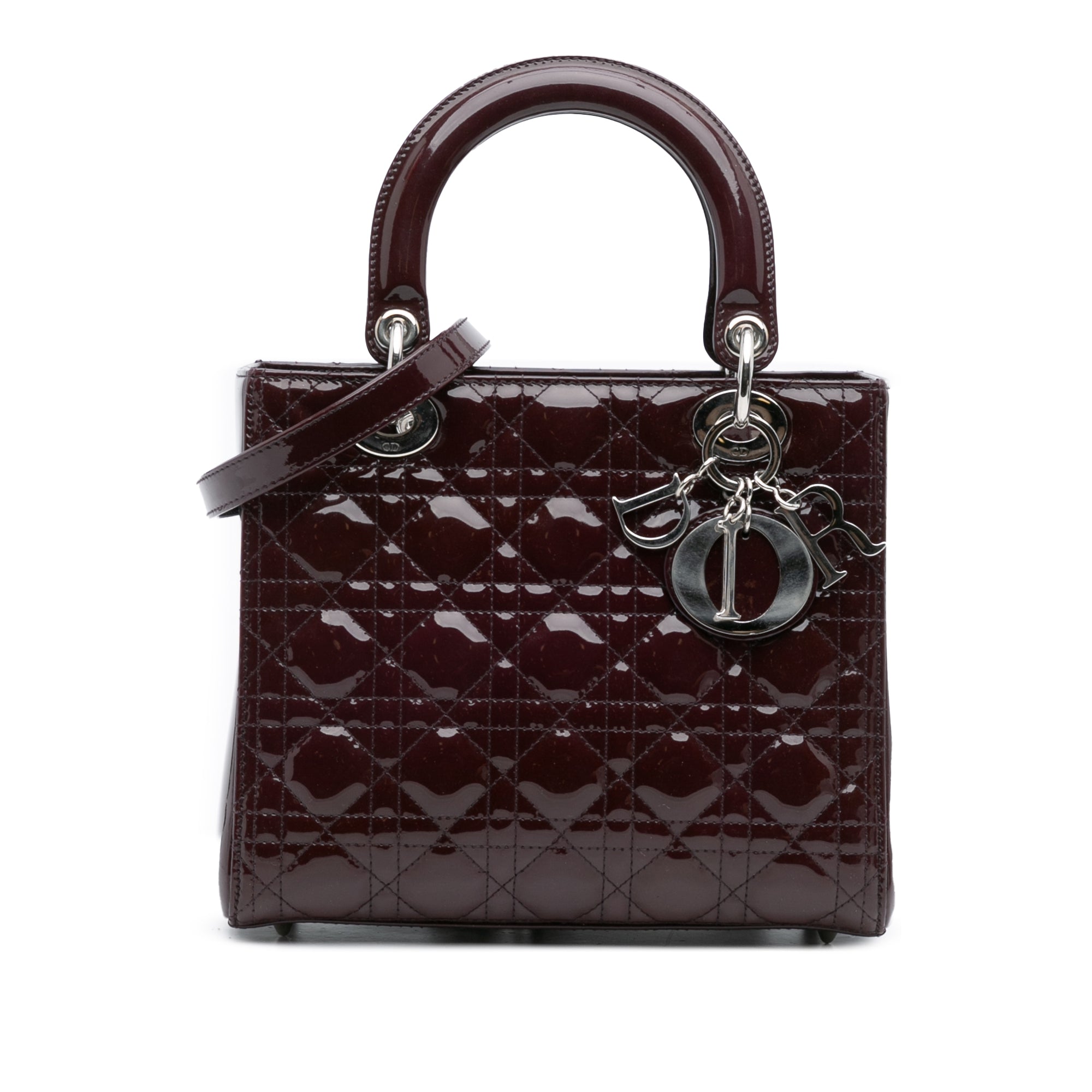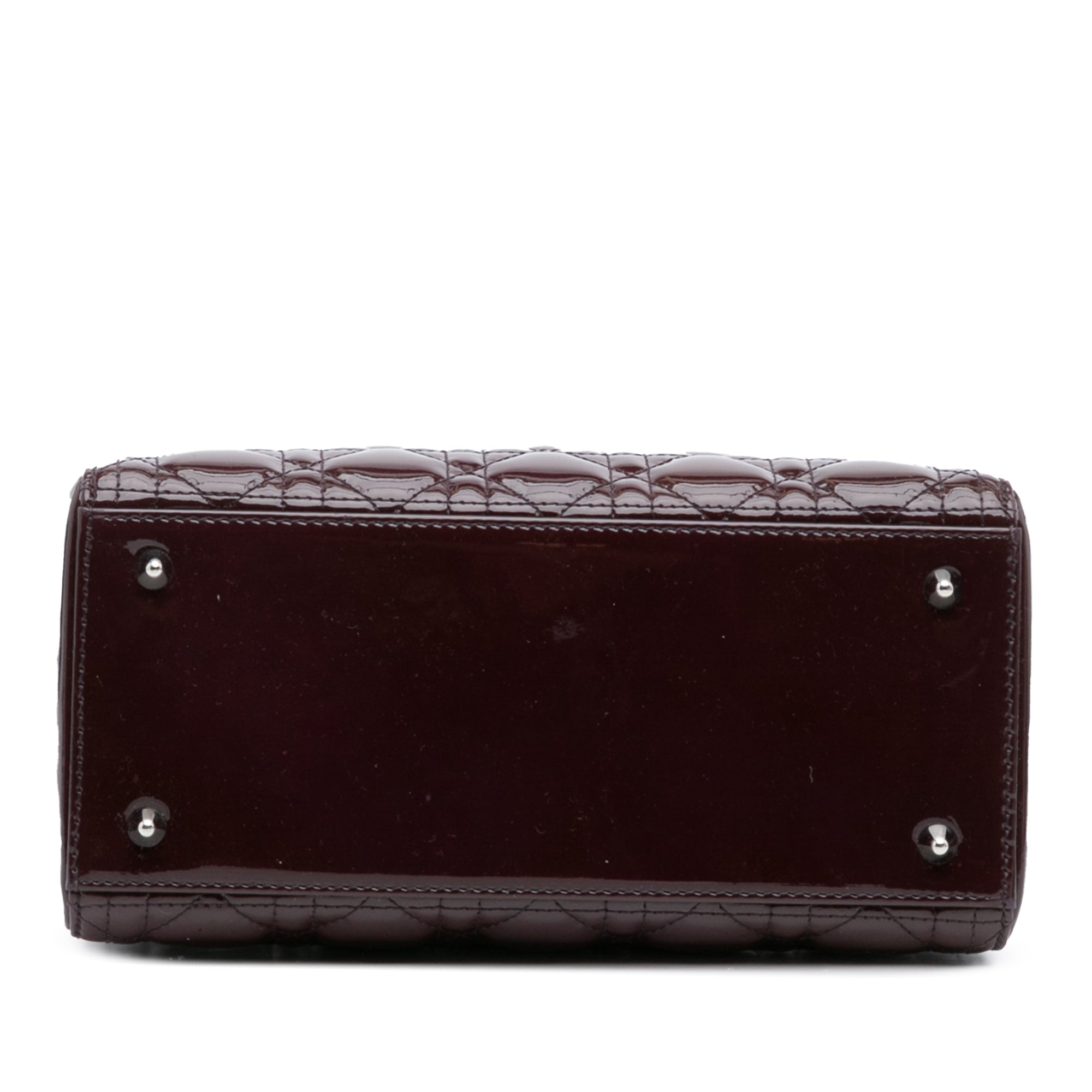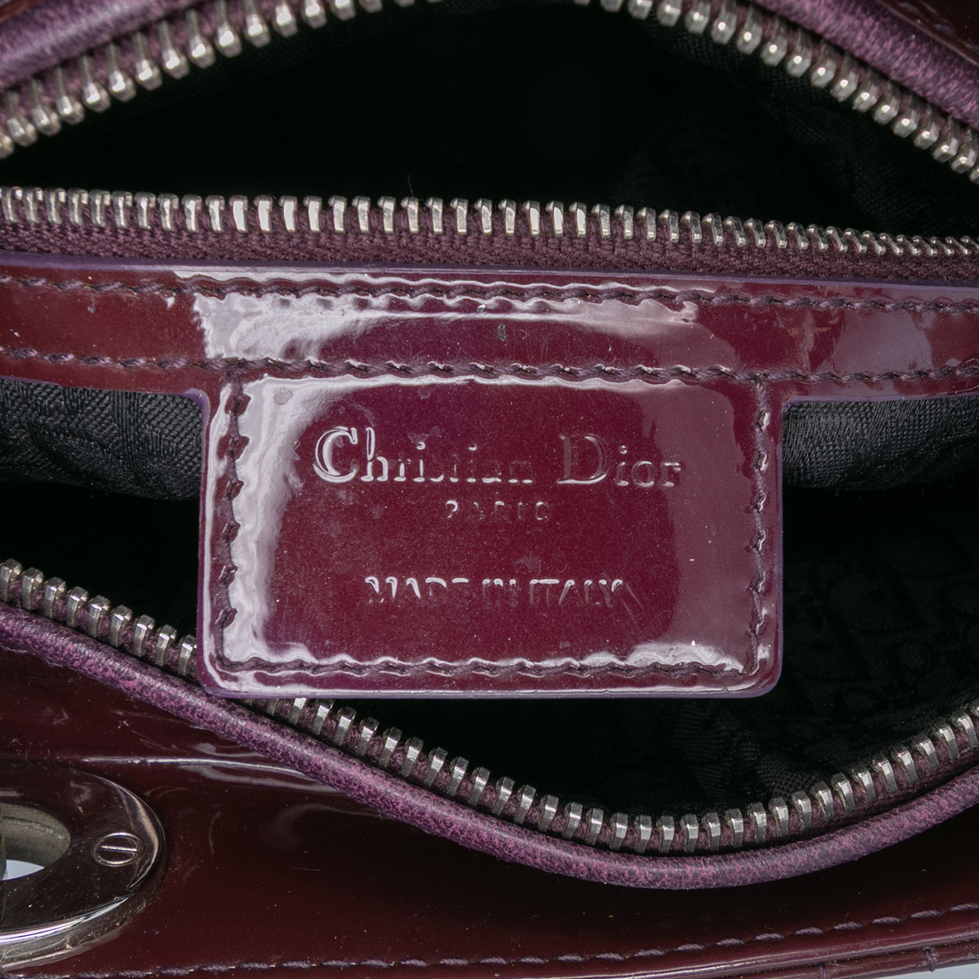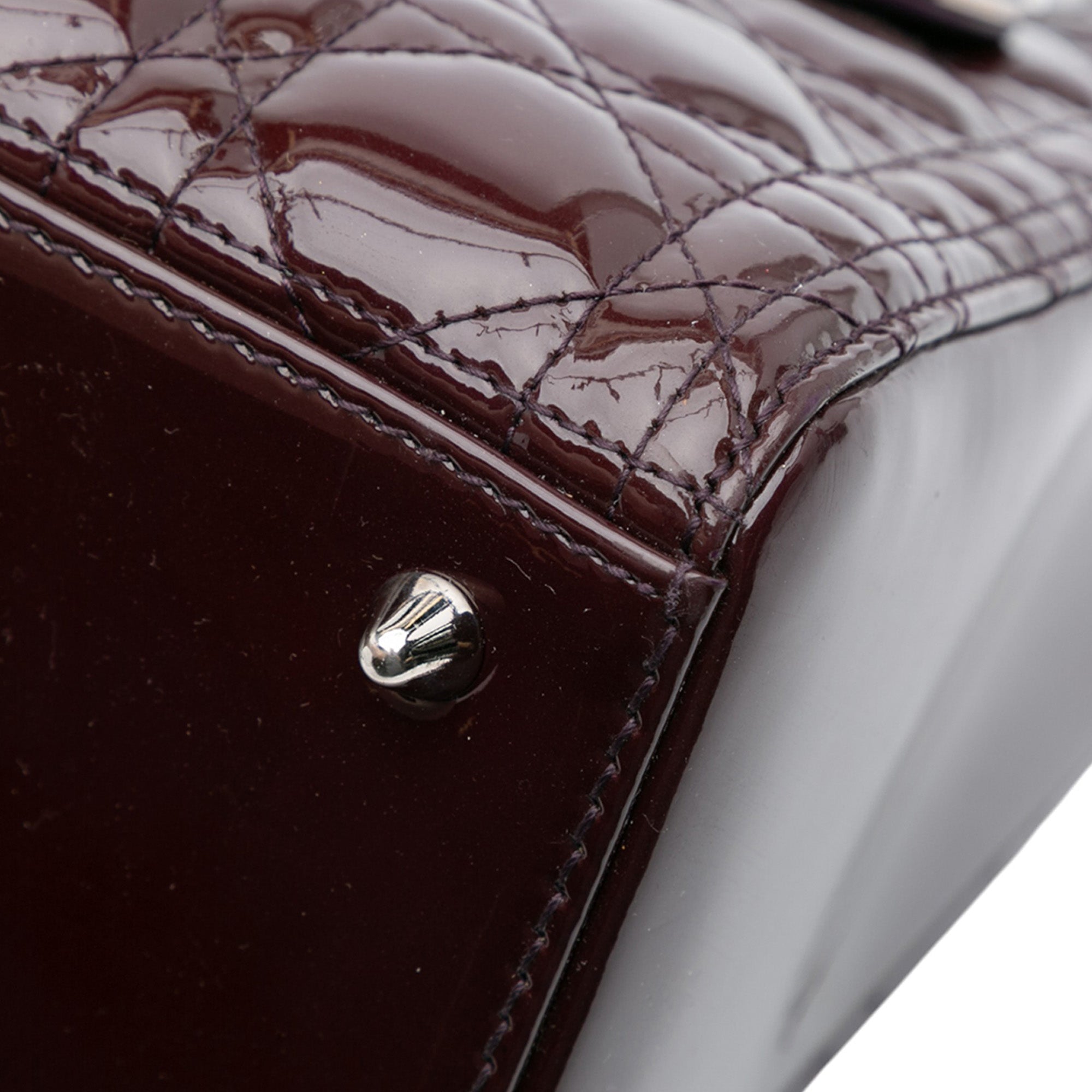 The Lady Dior features a quilted patent leather body, flat leather top handles, a detachable flat leather strap, a top zip closure, and an interior zip pocket. Retail Price: 6000.00