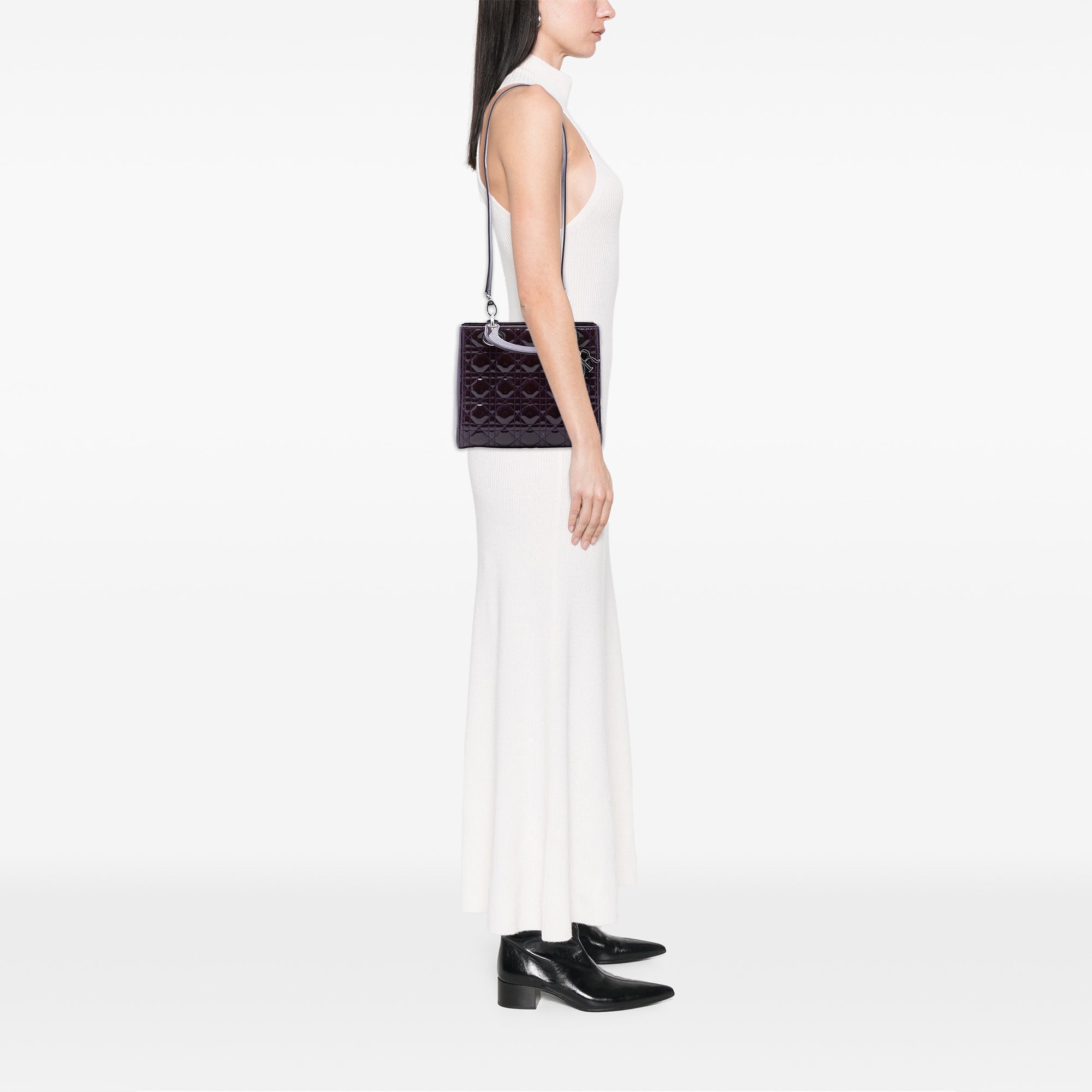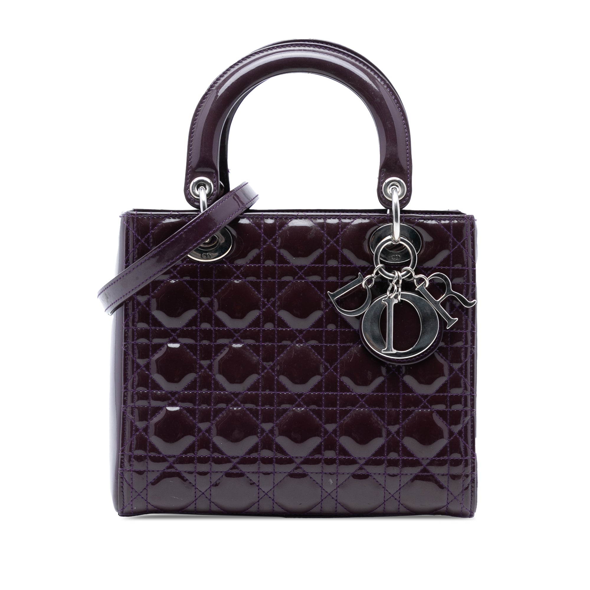 The Lady Dior features a quilted patent leather body, flat leather top handles, a detachable flat leather strap, a top zip closure, and an interior zip pocket. Inclusion: authenticity card. Retail Price: 6100.00