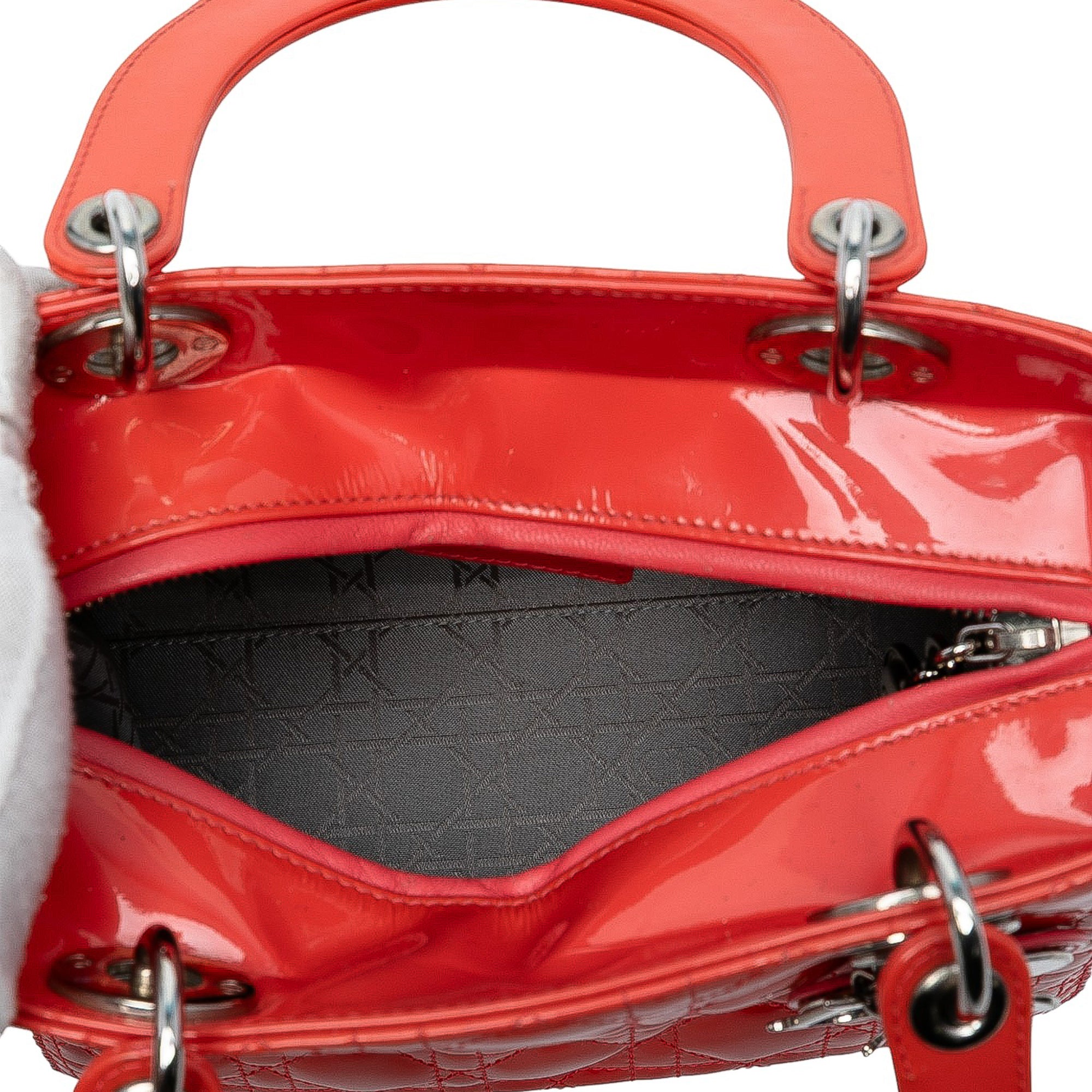 The Lady Dior features a patent leather body, flat leather top handles, a detachable flat leather strap, a top zip closure, and an interior zip pocket. Retail Price: 6100.00