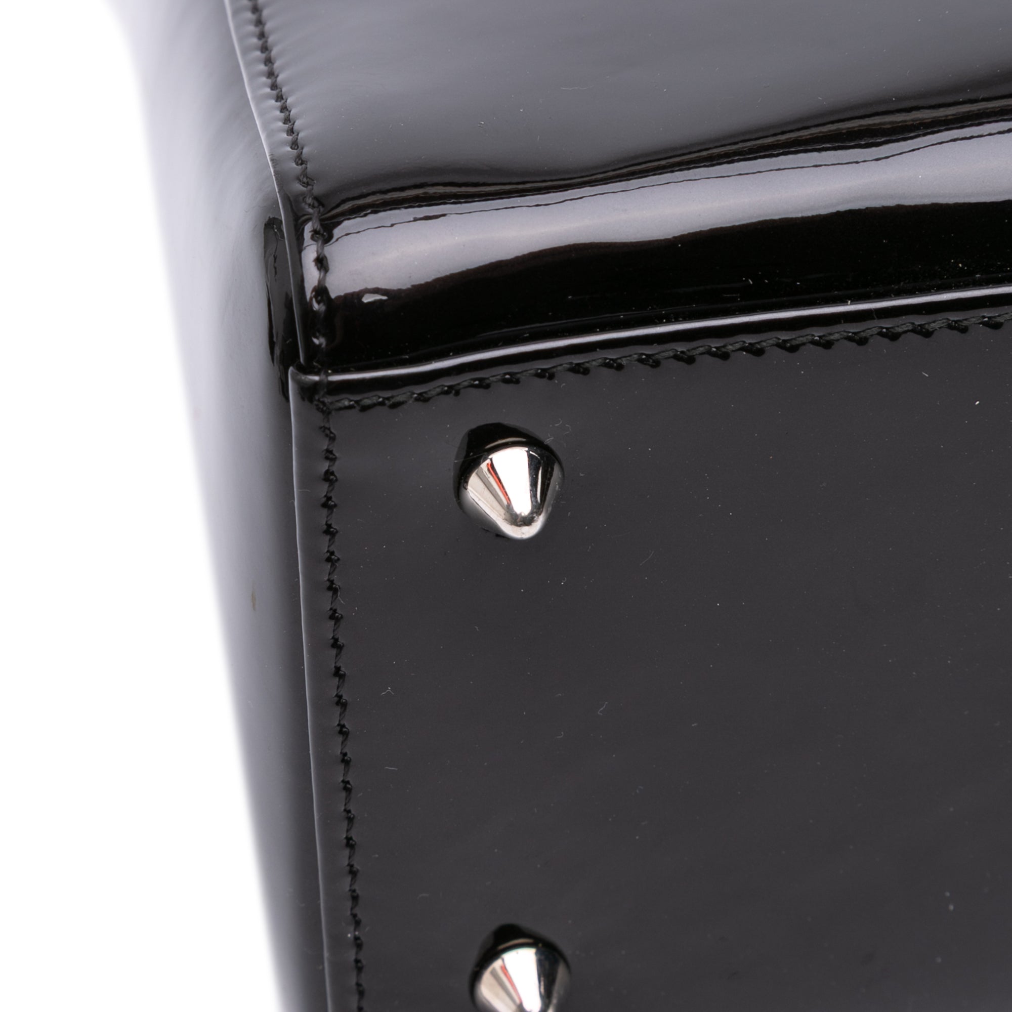 The Lady Dior features a patent leather body, flat leather top handles, a detachable flat leather shoulder strap, a top zip closure, and an interior zip pocket. Retail Price: 6100.00