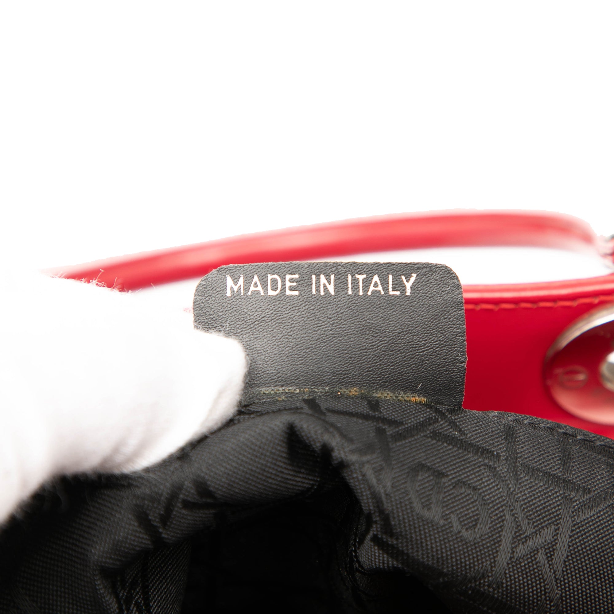 The Lady Dior satchel features a patent leather body, flat handles, a flat detachable leather strap, a top zip closure, and an interior zip pocket. Retail Price: 2200.00