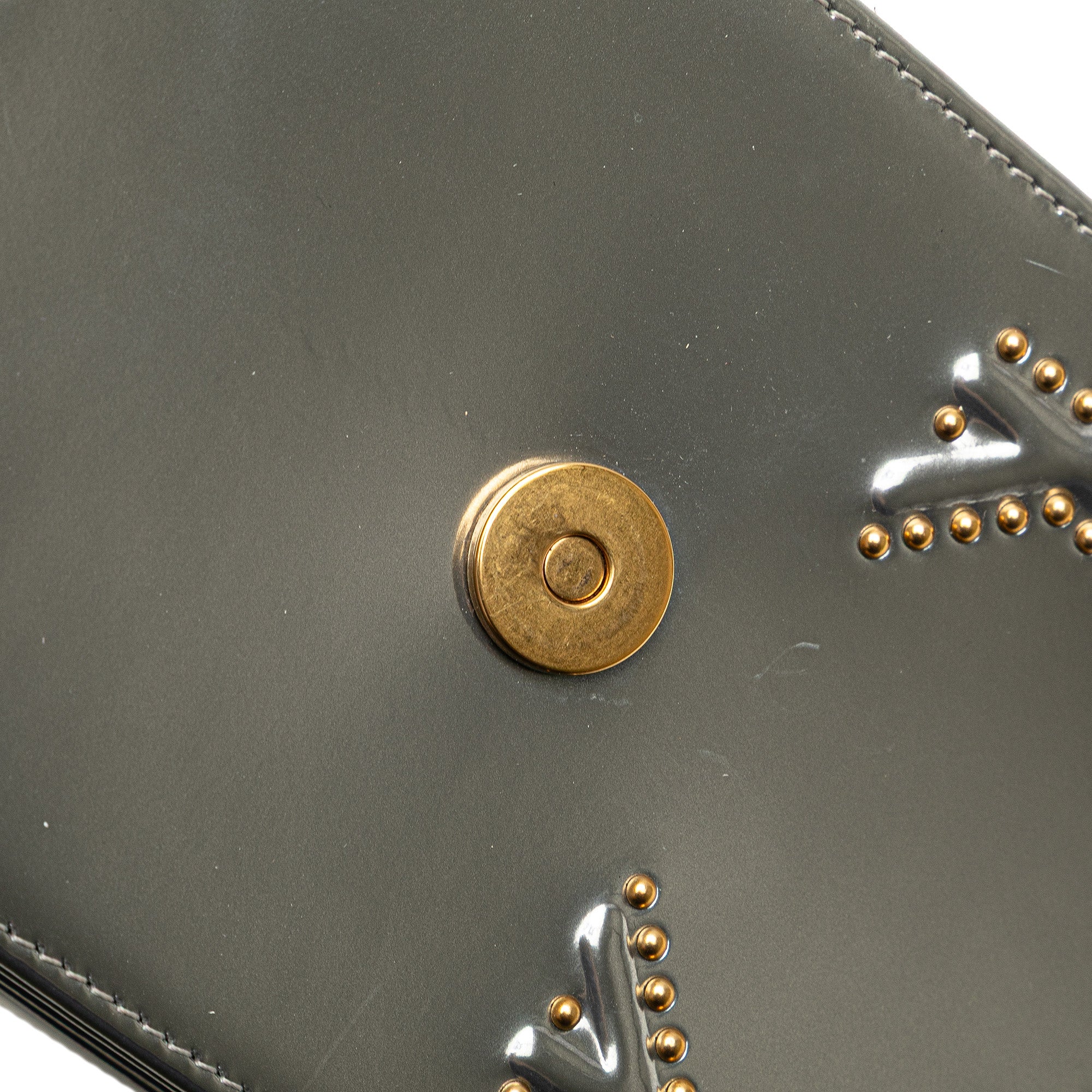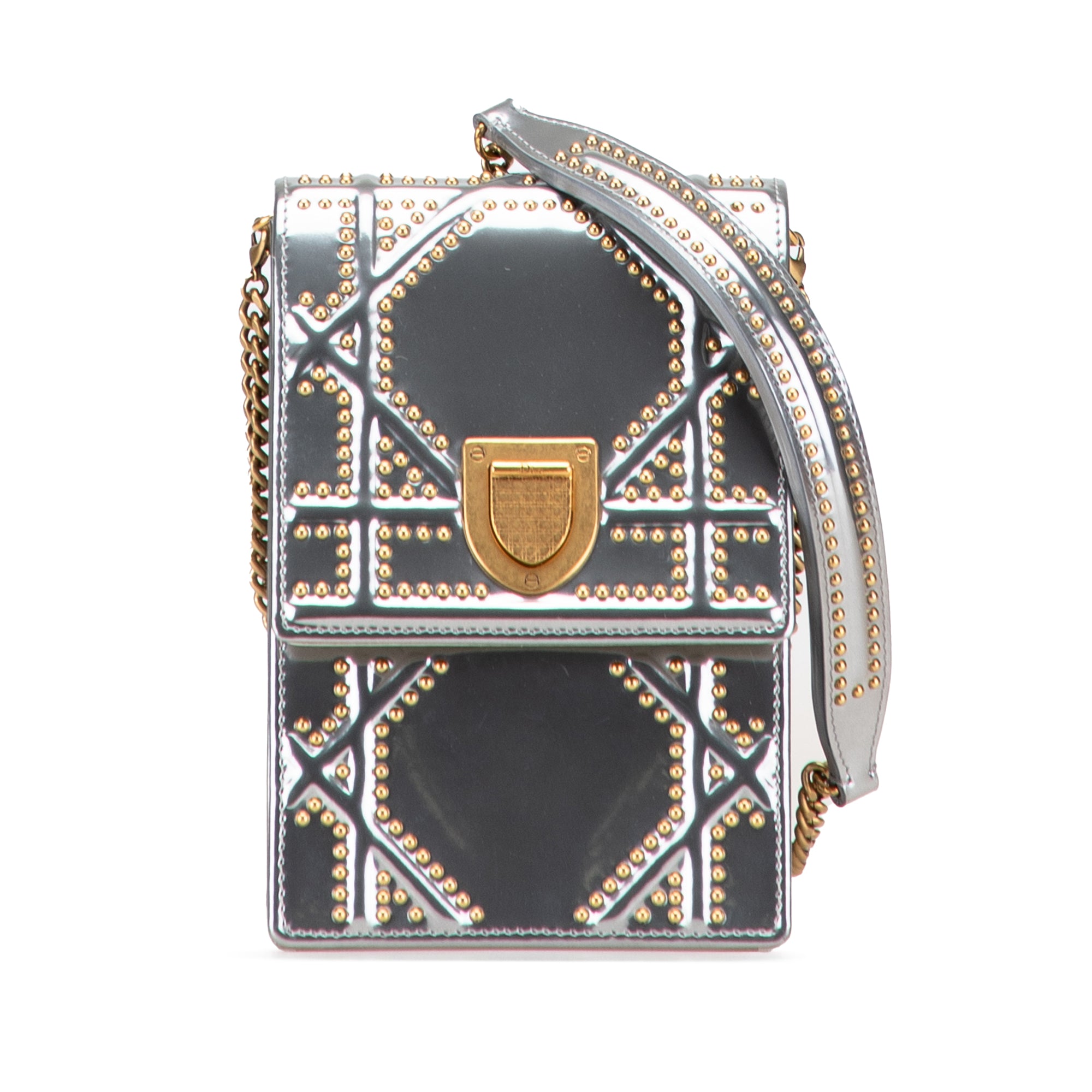 The Diorama features a studded leather body, a chain link strap with leather guard, a front flap with a metal push lock closure, and an interior slip pocket Retail Price: 1400.00