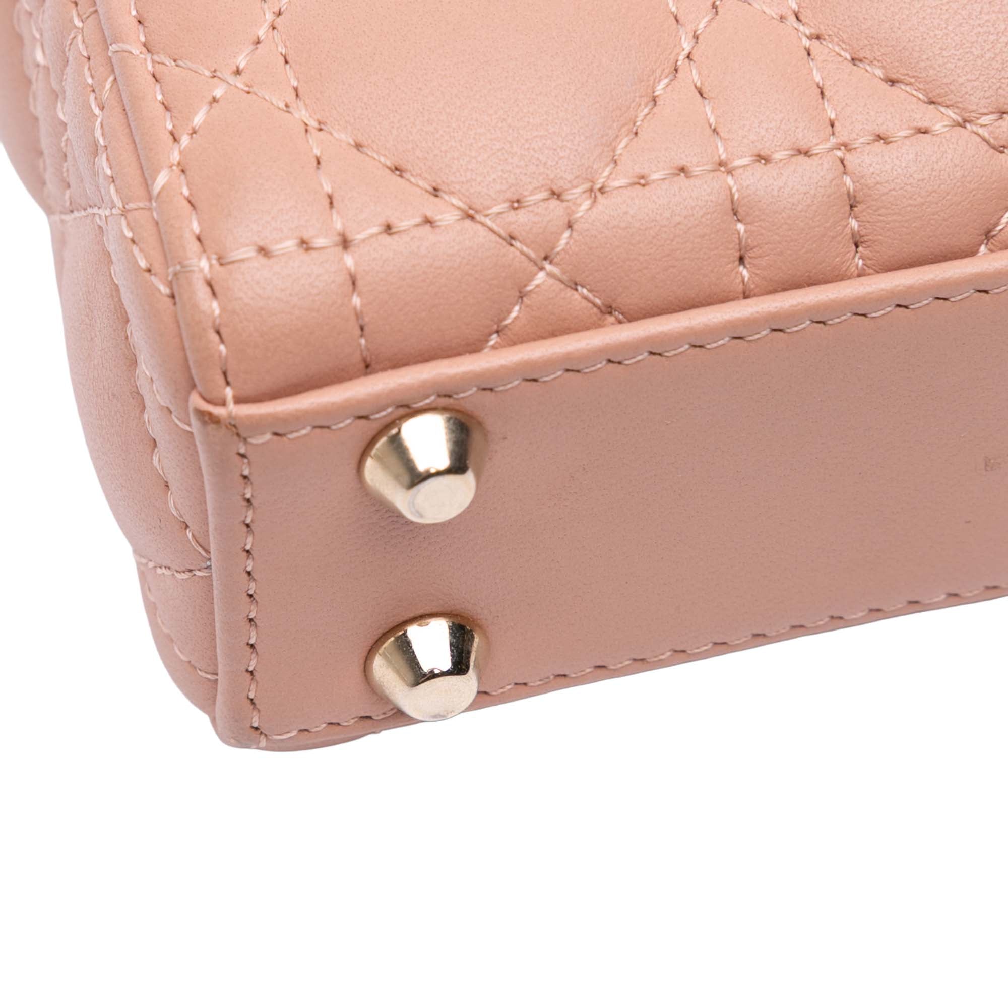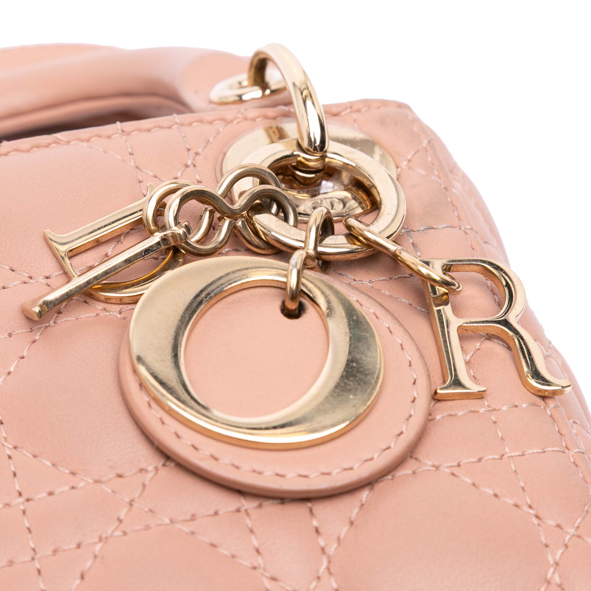 The Micro Lady Dior features a quilted lambskin leather body, flat leather top handles, a detachable flat leather shoulder strap, and a fold-in flap closure. Retail Price: 3900.00