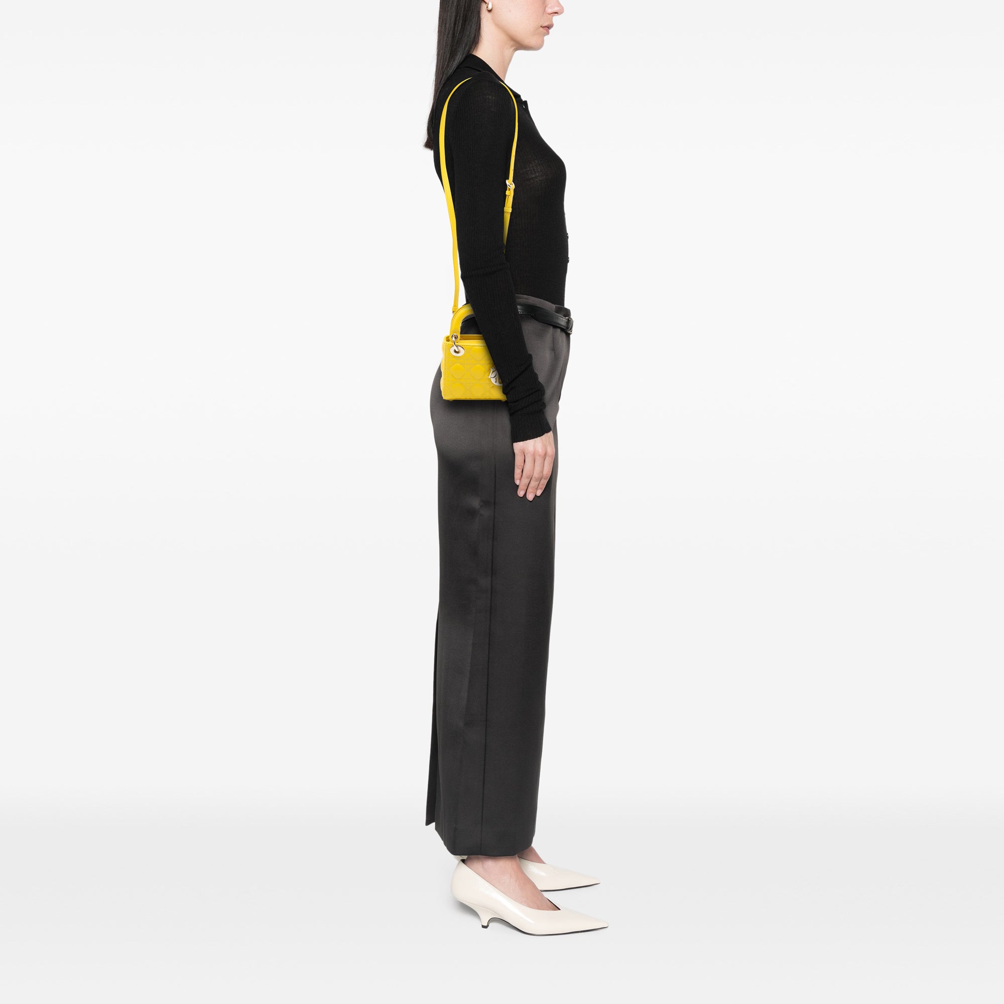 The Micro Lady Dior features a quilted lambskin leather body, flat leather top handles, a detachable flat leather shoulder strap, and a fold-in flap closure. Retail Price: 2500.00