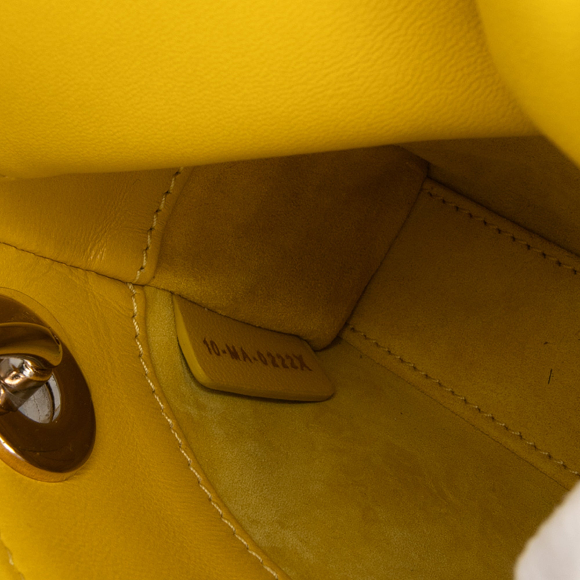 The Micro Lady Dior features a quilted lambskin leather body, flat leather top handles, a detachable flat leather shoulder strap, and a fold-in flap closure. Retail Price: 3900.00